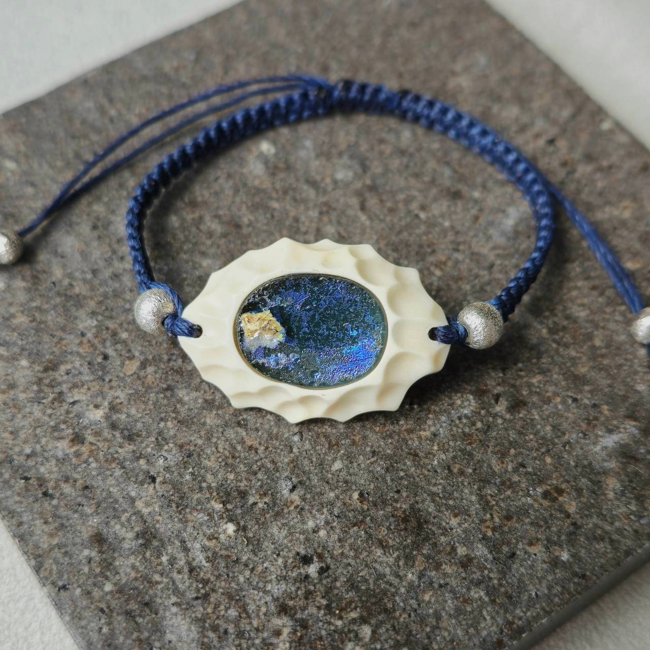 この作品に使用したルースには、深いコバルトブルーと紫がかった青の層に、柔らかな金色の煌めきが混じり、まるで夜明け前の空のような静けさを湛えています。