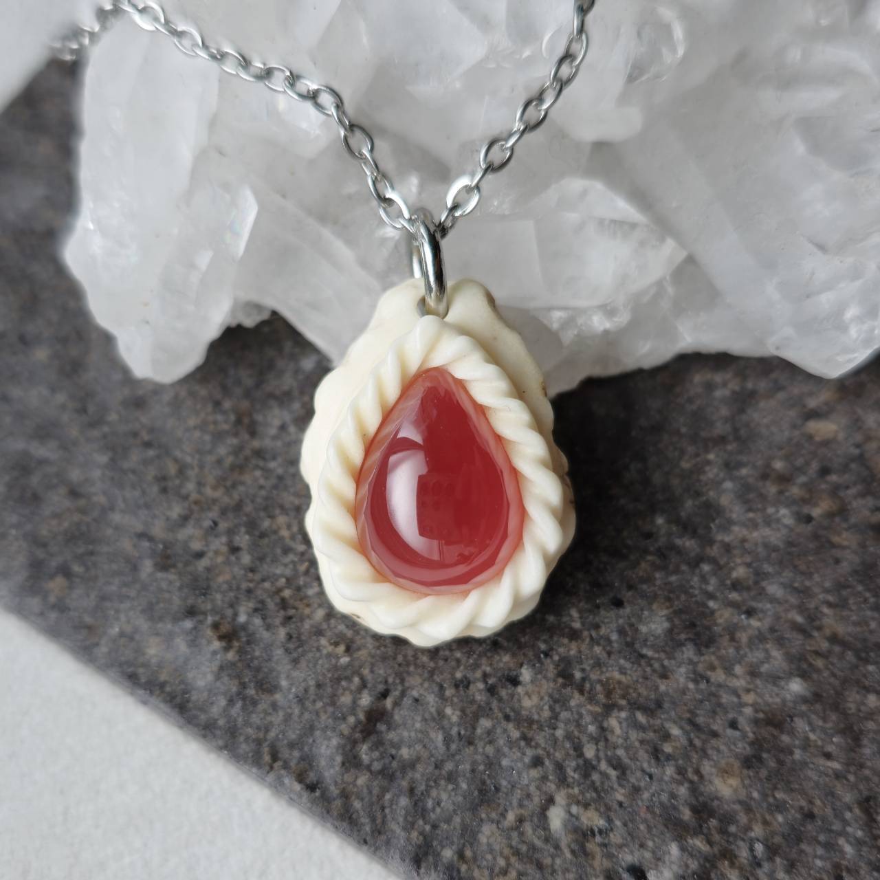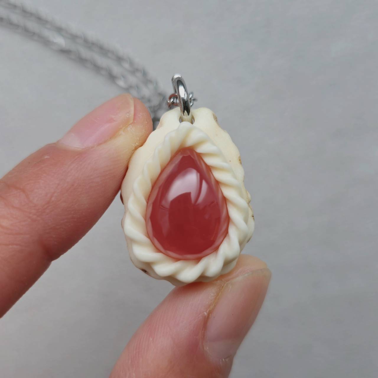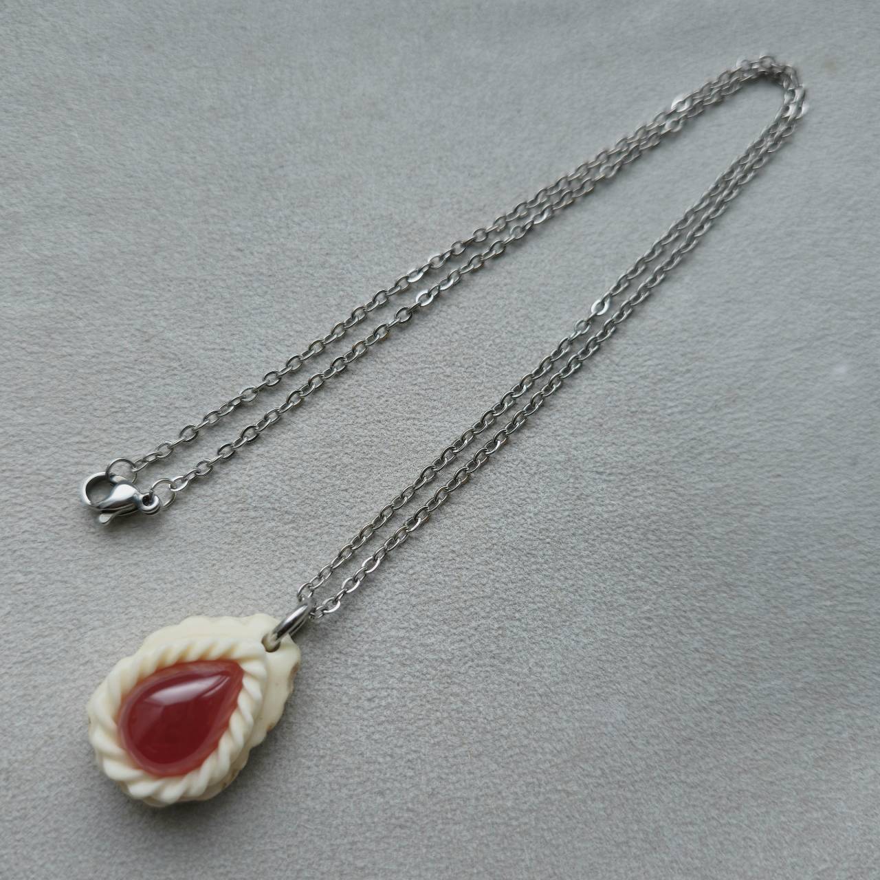 北海道産の鹿の角から削り出して仕立てた、やさしいクリーム色の土台。その中心に、しずく型のペルー産インカローズを埋め込んだネックレスです。
