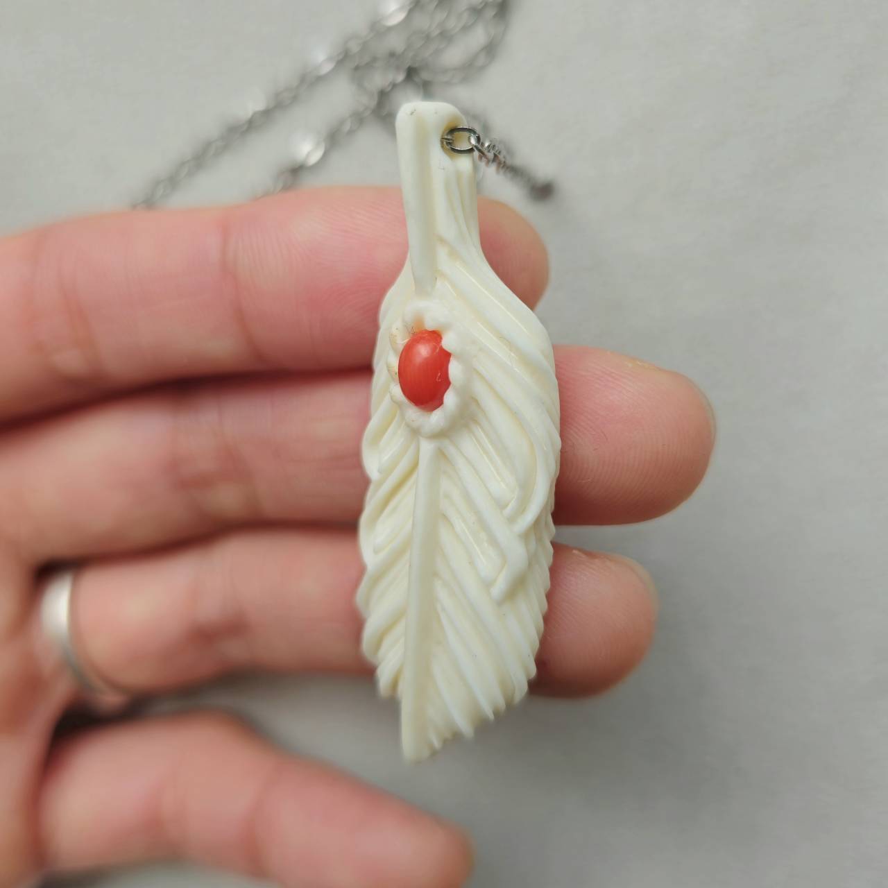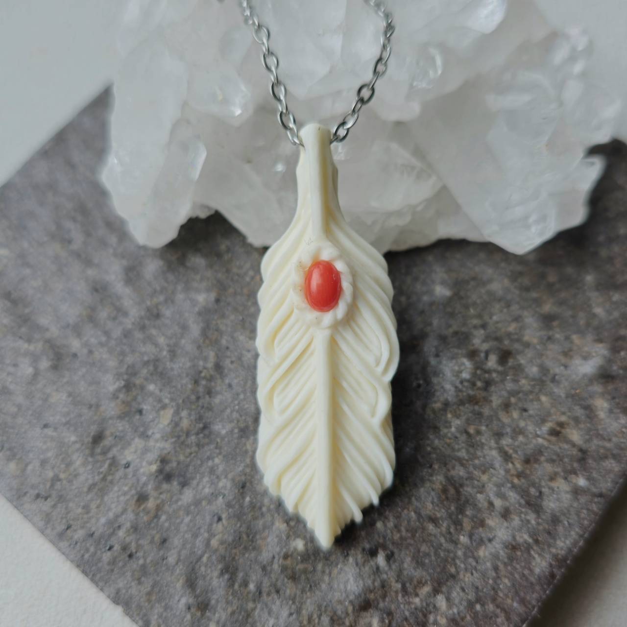 白くなめらかで、わずかにアイボリーがかった艶を持つ鹿の角から削り出したフェザーには、イタリア サルデーニャ島で採れた天然の赤珊瑚を埋め込んでいます。
