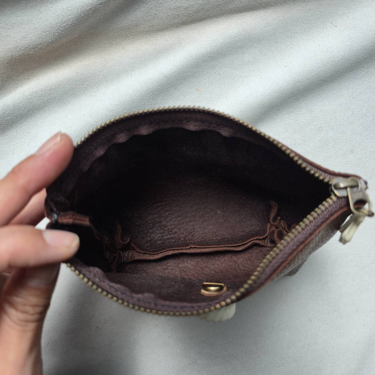 手に取った瞬間、革の質感と素材の力強さがそのまま伝わるポーチです。