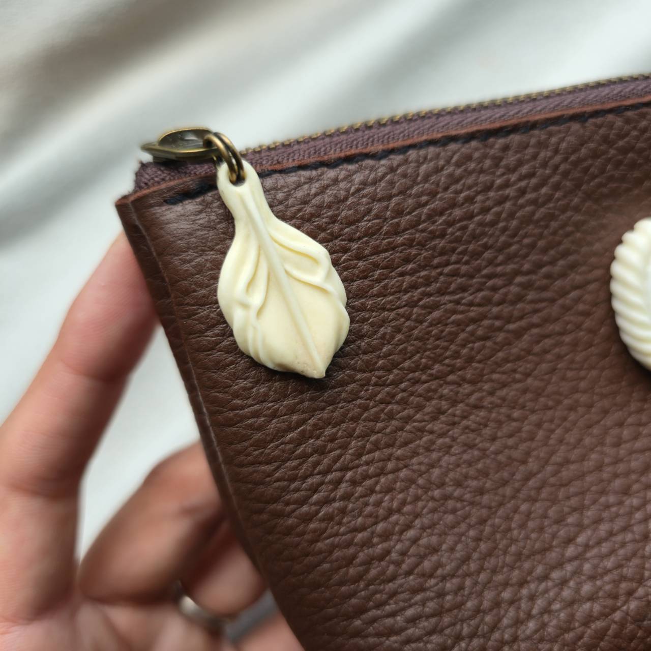 ファスナーチャームには鹿の角を削り出し、フェザーをモチーフに彫刻。
