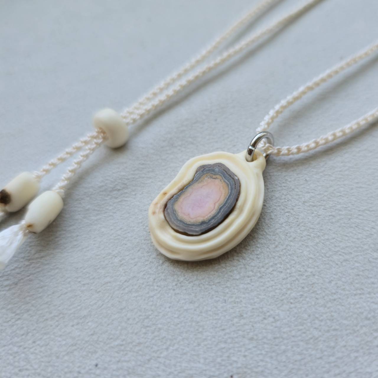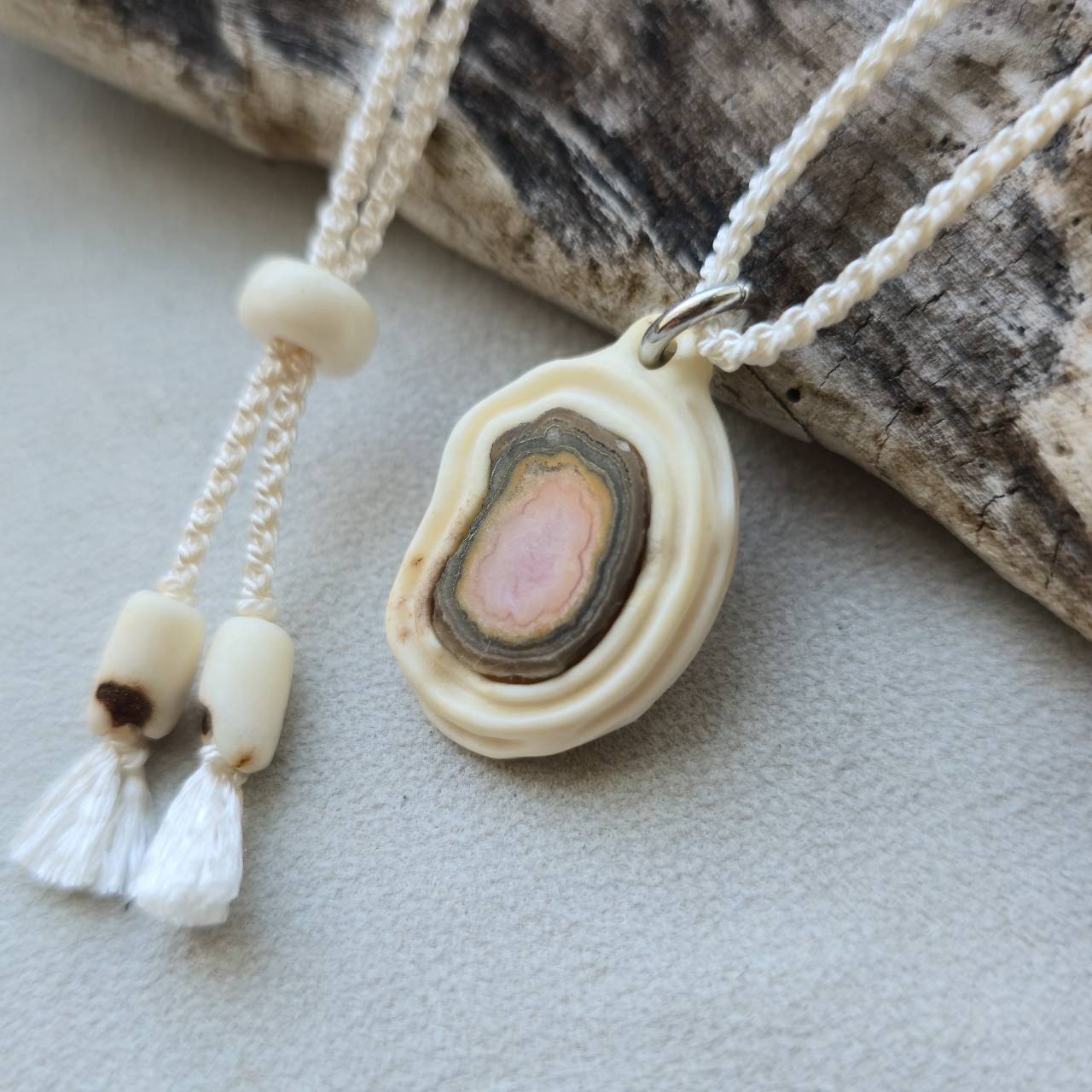 柔らかなアイボリー色の鹿角を削り出し、中心にロードクロサイトの鍾乳石スライスを埋め込んだペンダントです。