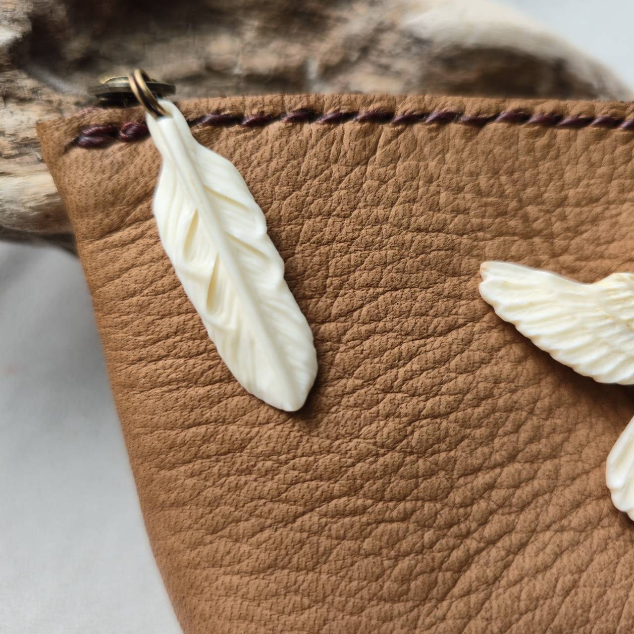 ファスナーチャームには鹿の角を削り出し、フェザーをモチーフに彫刻。