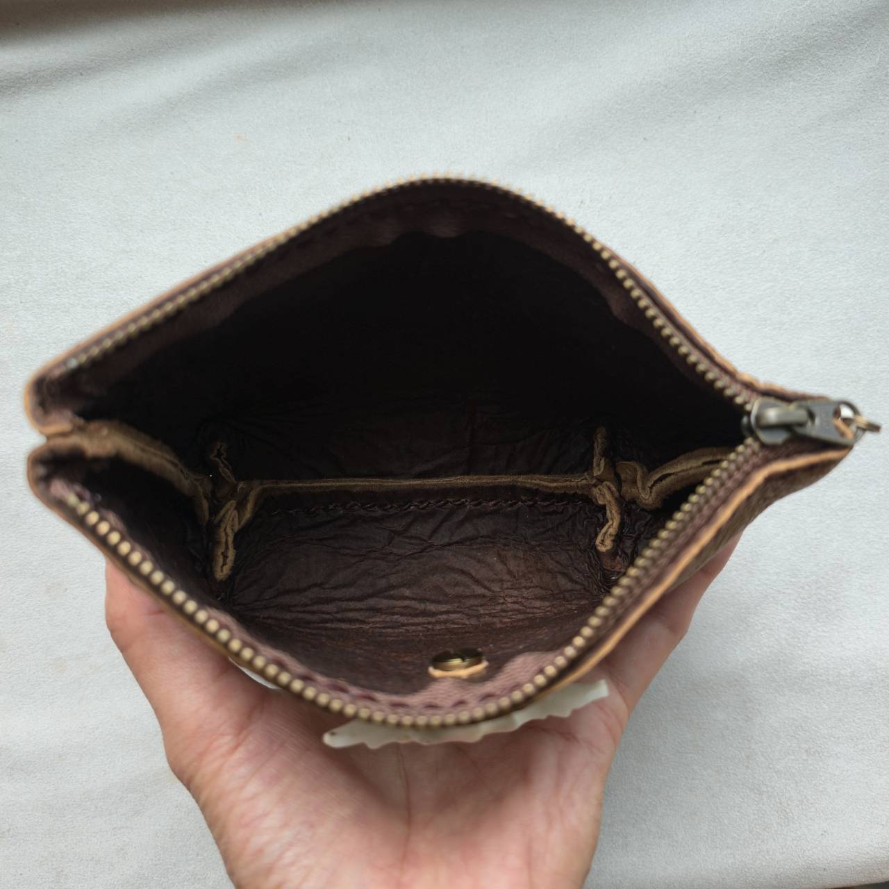 手に取った瞬間、革の質感と素材の力強さがそのまま伝わるポーチです。