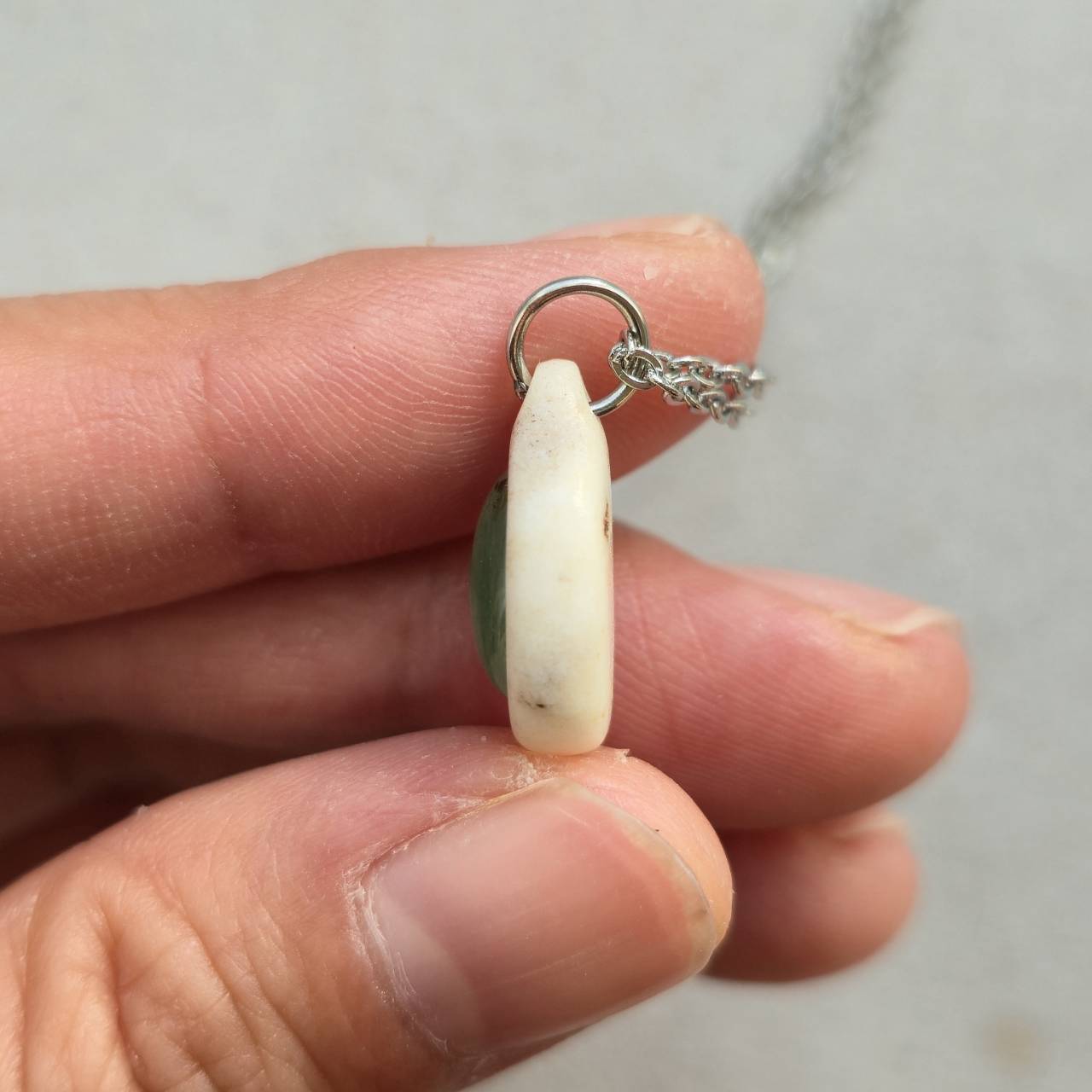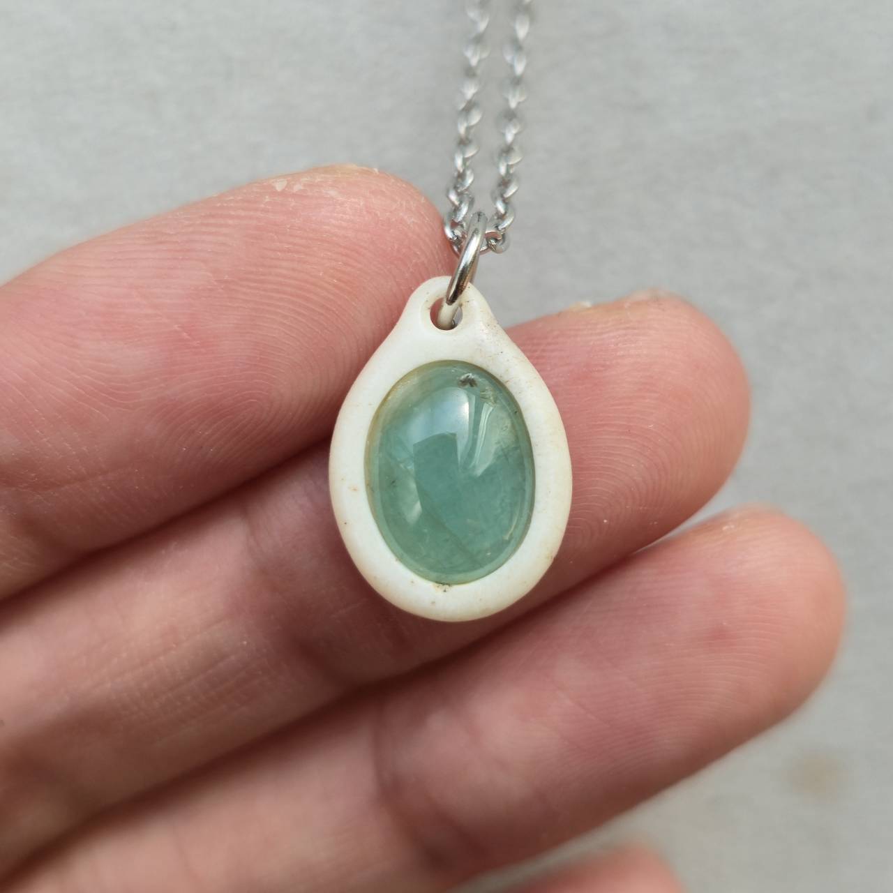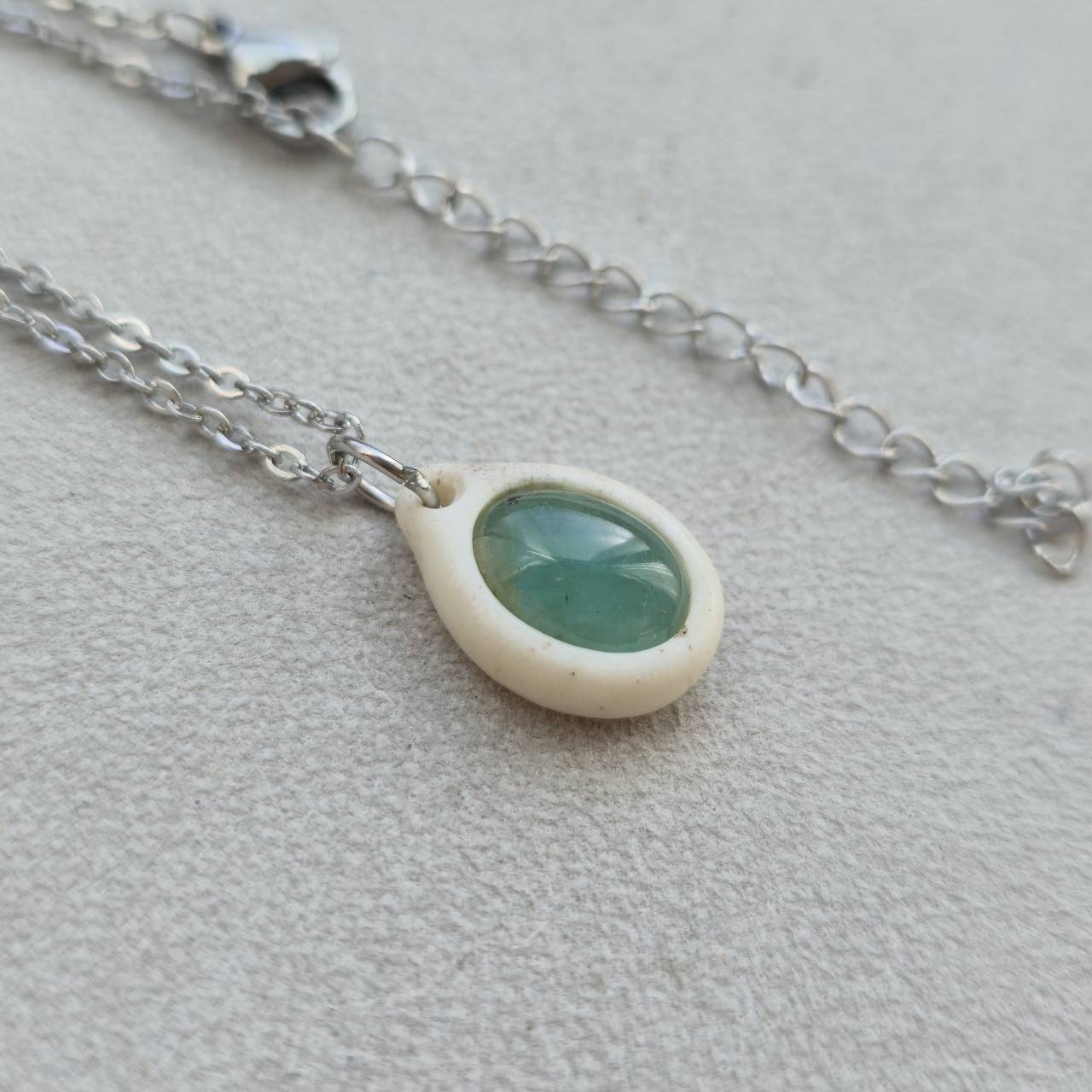 白く滑らかな鹿角の質感と、深みのある青緑の石が対比を生み、自然素材ならではの存在感を放っています。