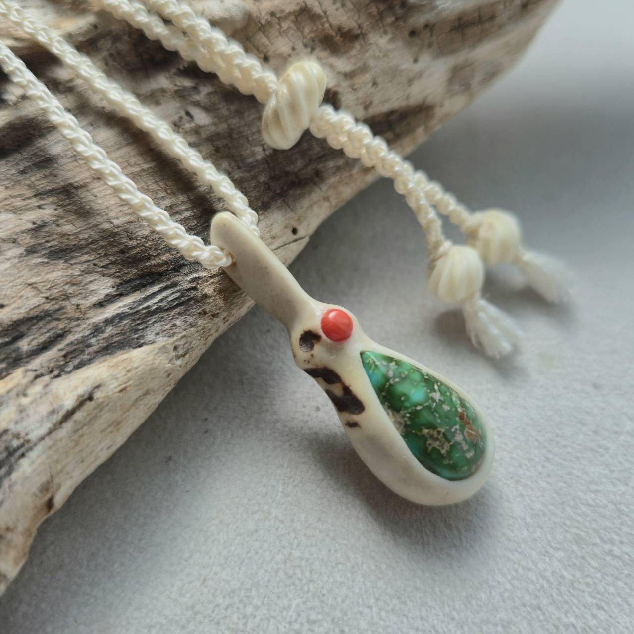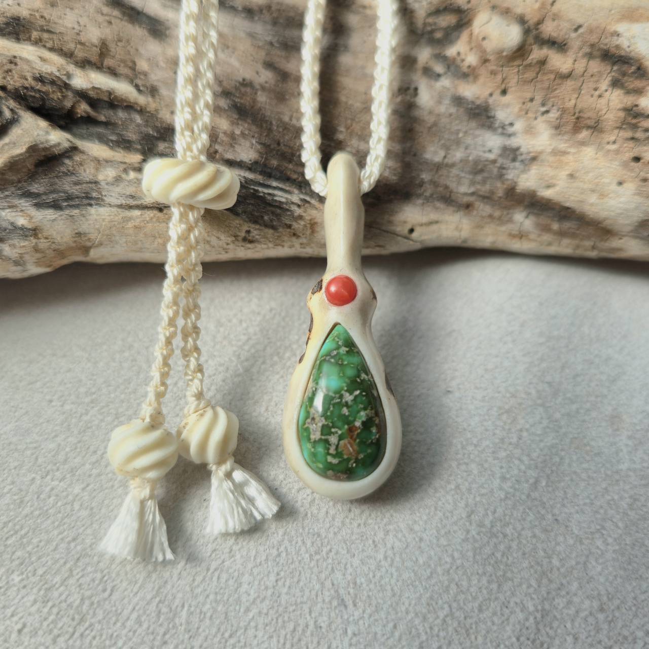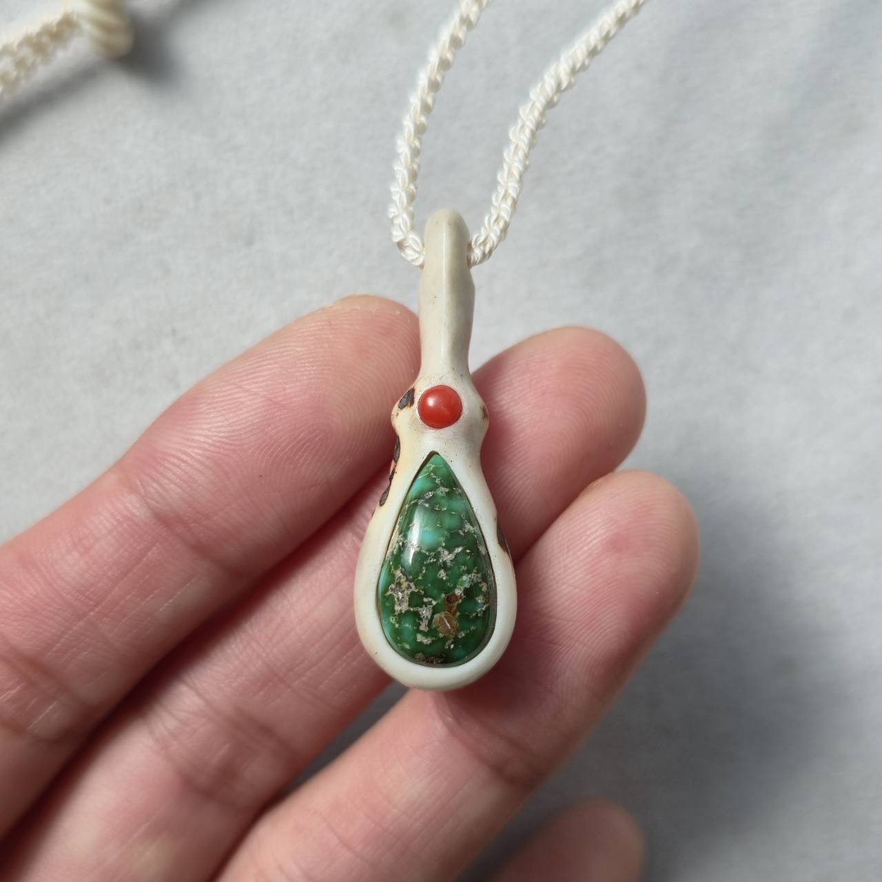 鹿の角を削り出した土台に、ソノランターコイズと赤珊瑚を組み合わせたペンダントです。