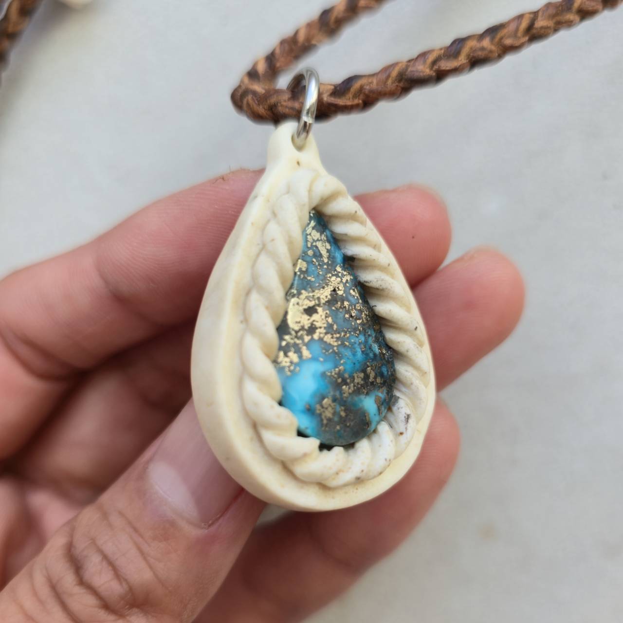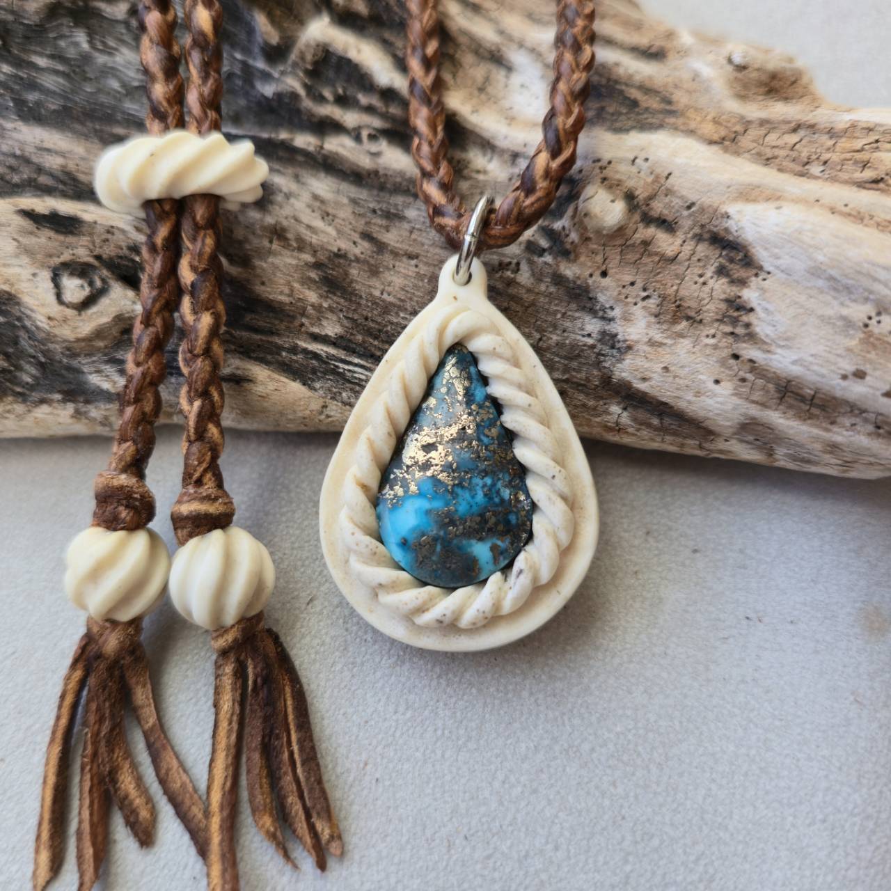 白く磨き上げた鹿の角を土台に、深い青が印象的なペルシアンターコイズを埋め込んだペンダントです。