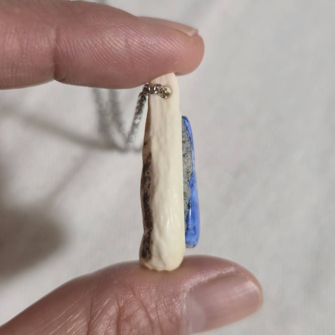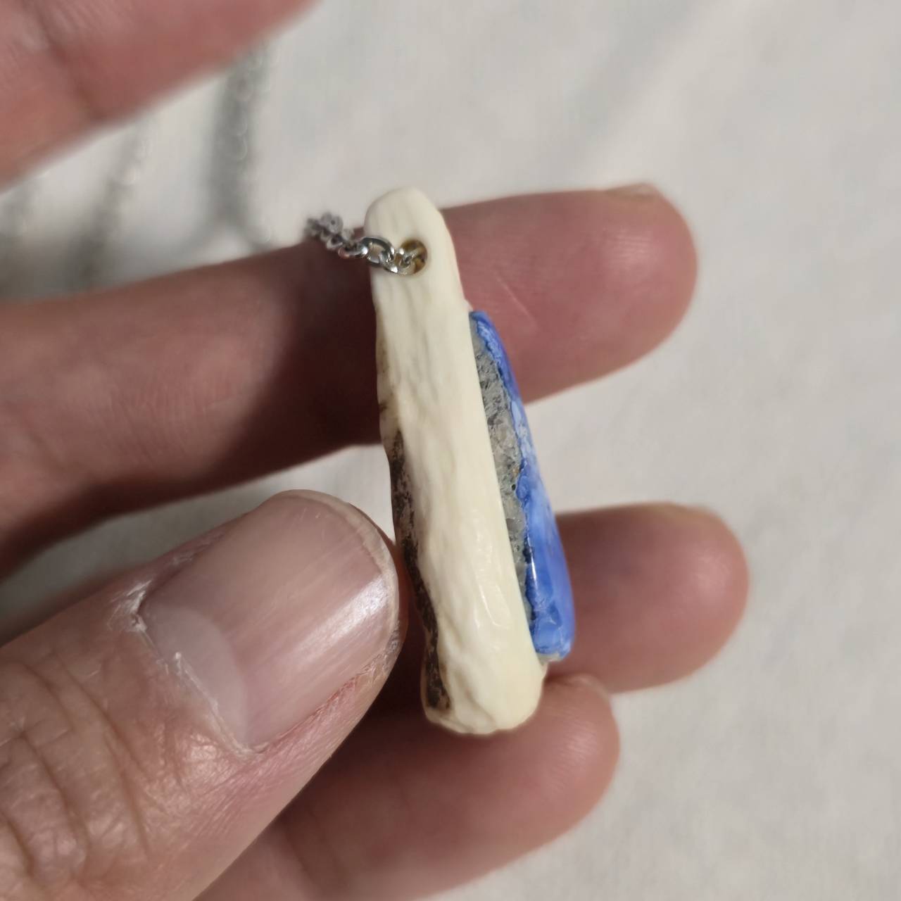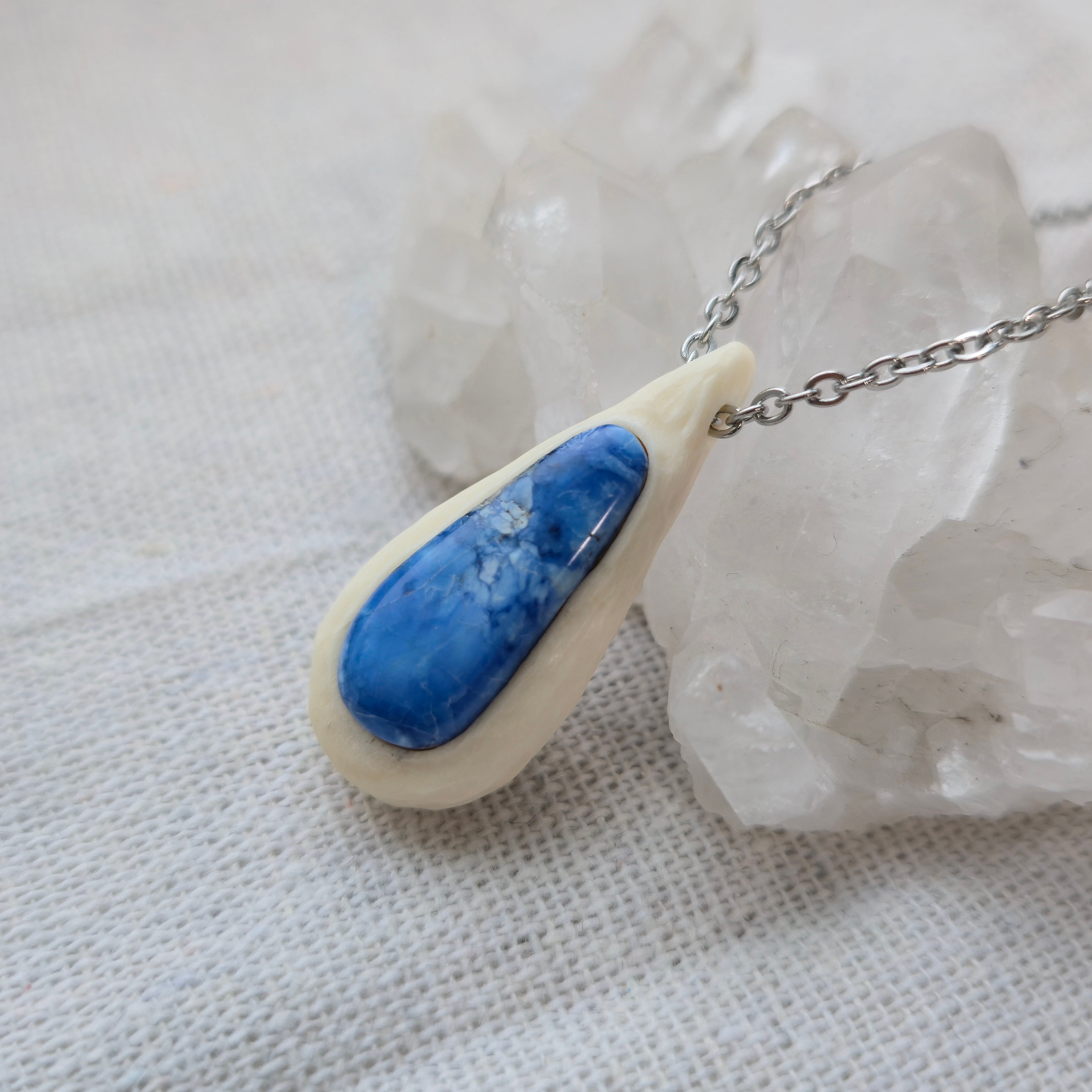 鹿の角を削り出し、その中央にラベンダーターコイズを埋め込んだネックレスです。