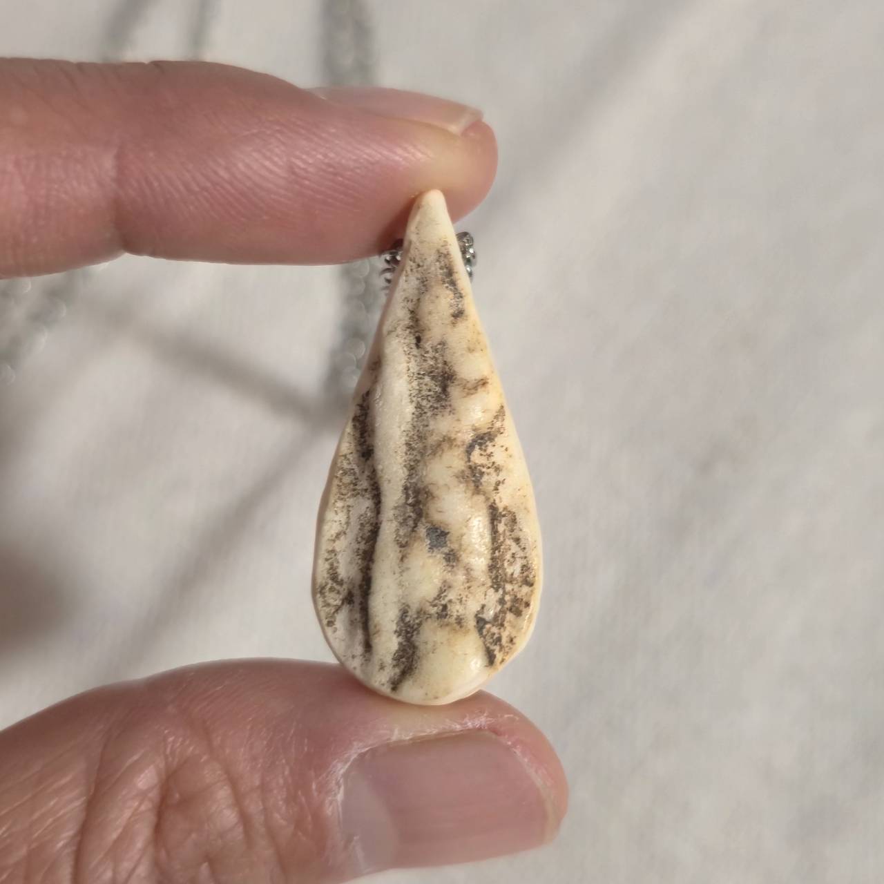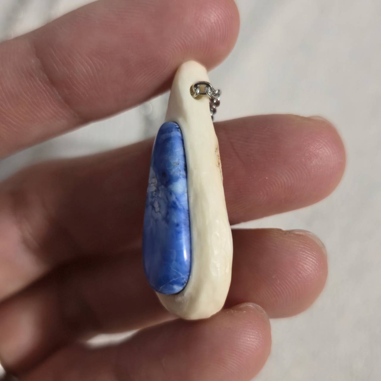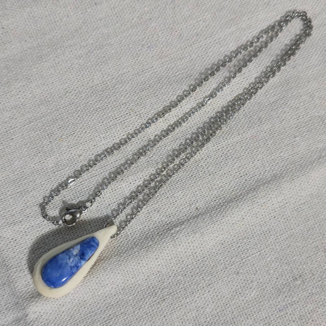 鹿の角を削り出し、その中央にラベンダーターコイズを埋め込んだネックレスです。