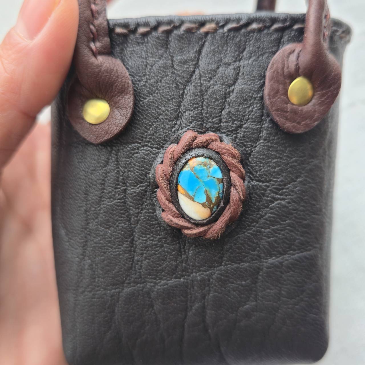 石の周囲は、鹿革を編み込むように縁取っています。