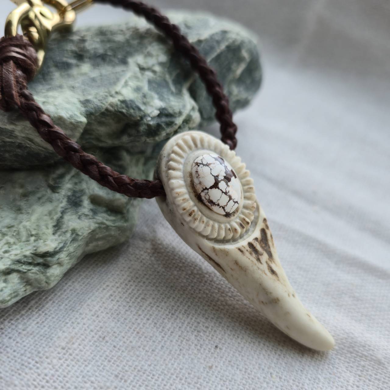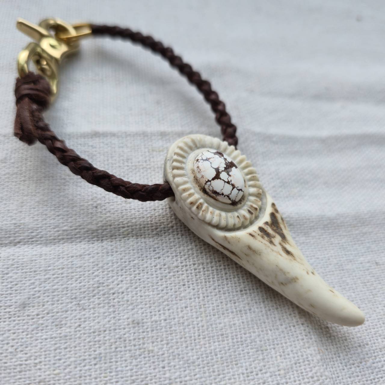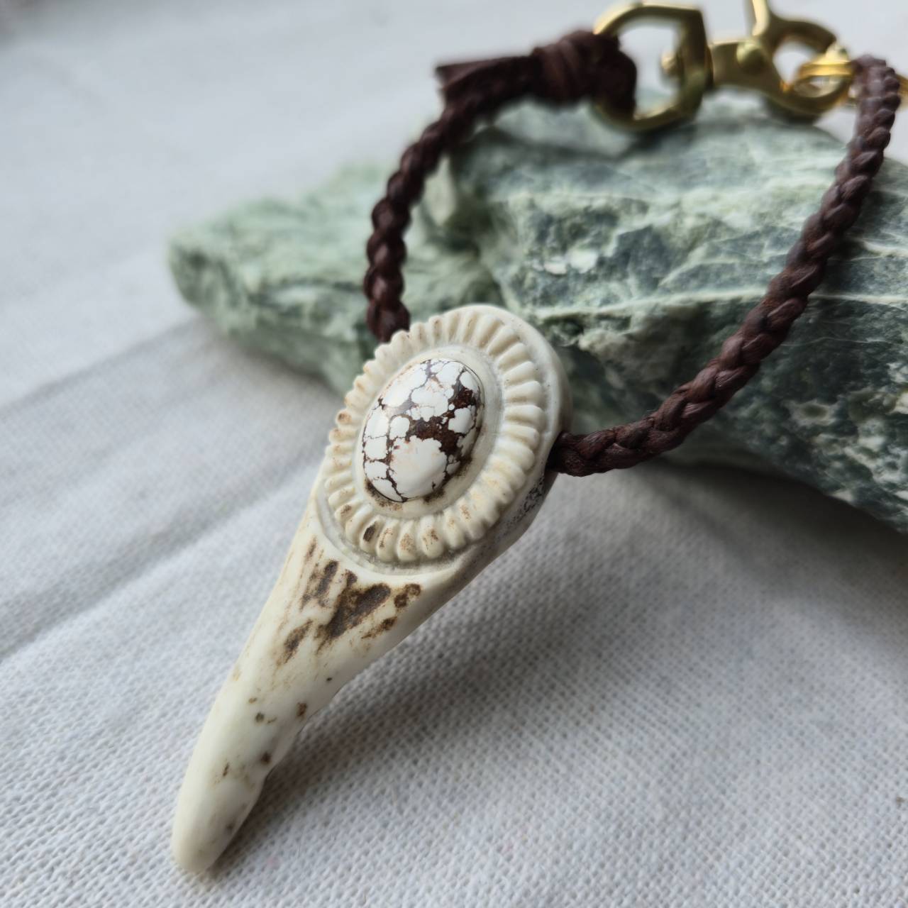 鹿角、天然石、真鍮金具、編み込んだ鹿革紐。