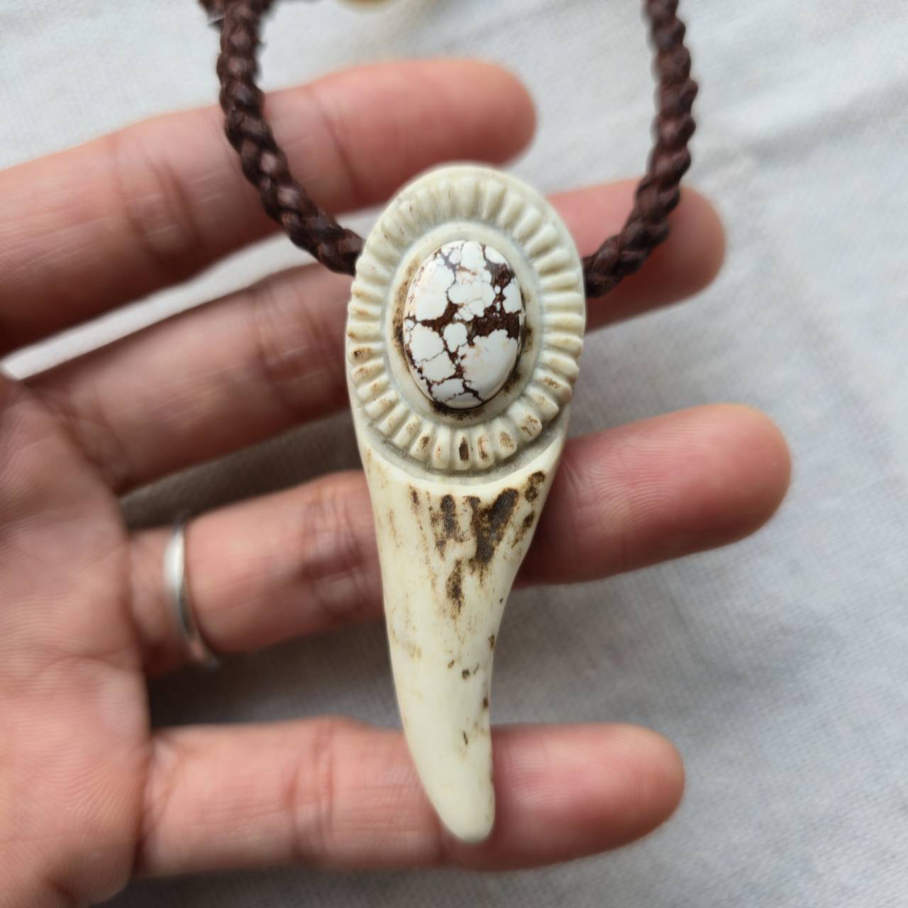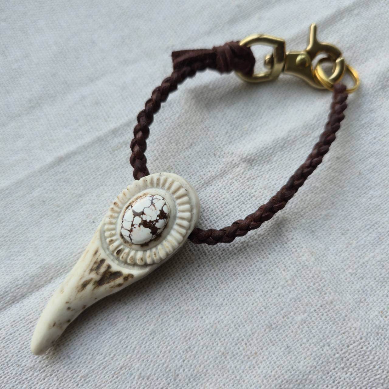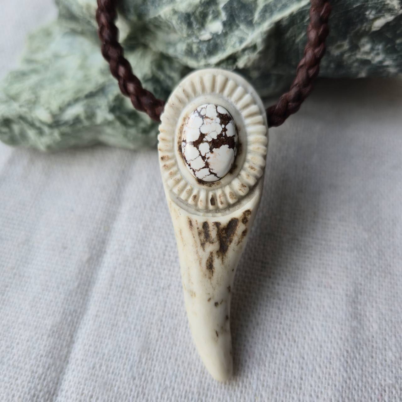 鹿角、天然石、真鍮金具、編み込んだ鹿革紐。