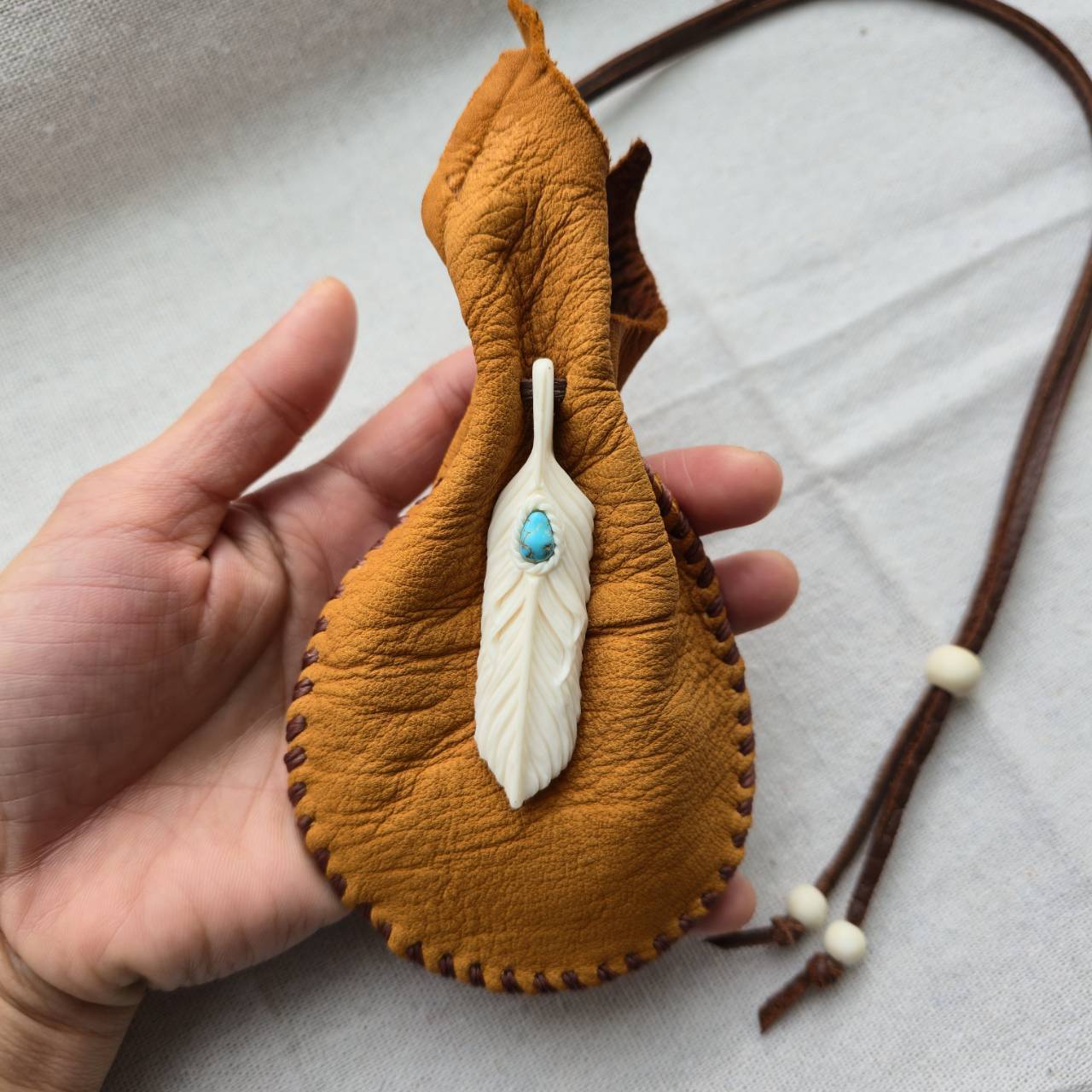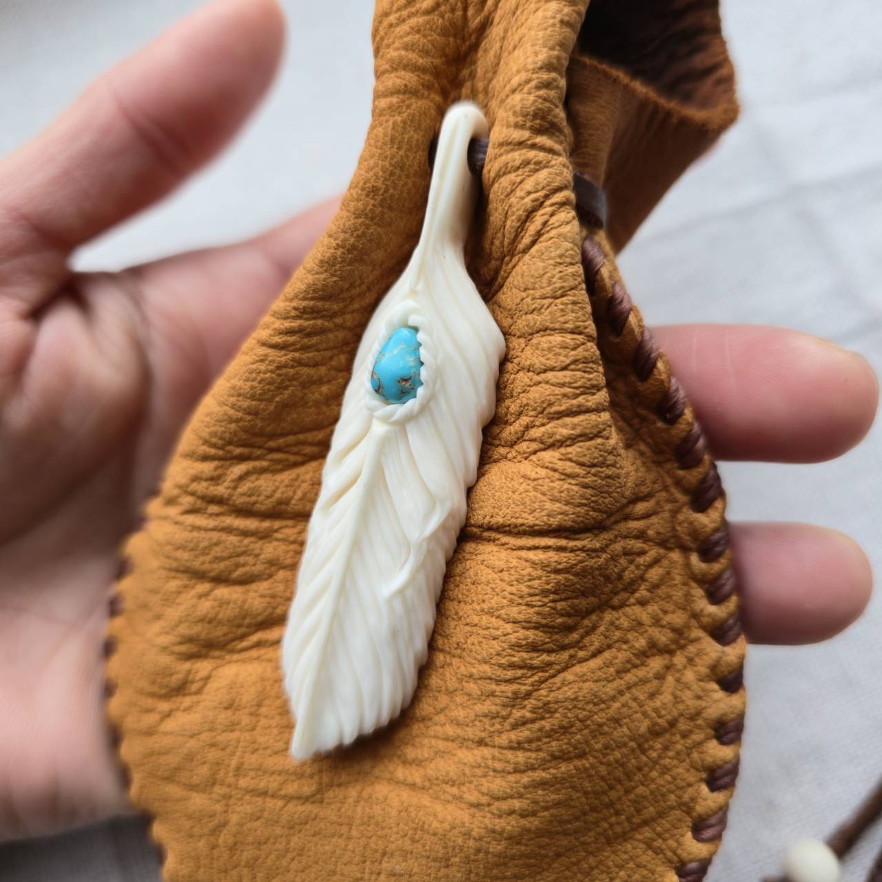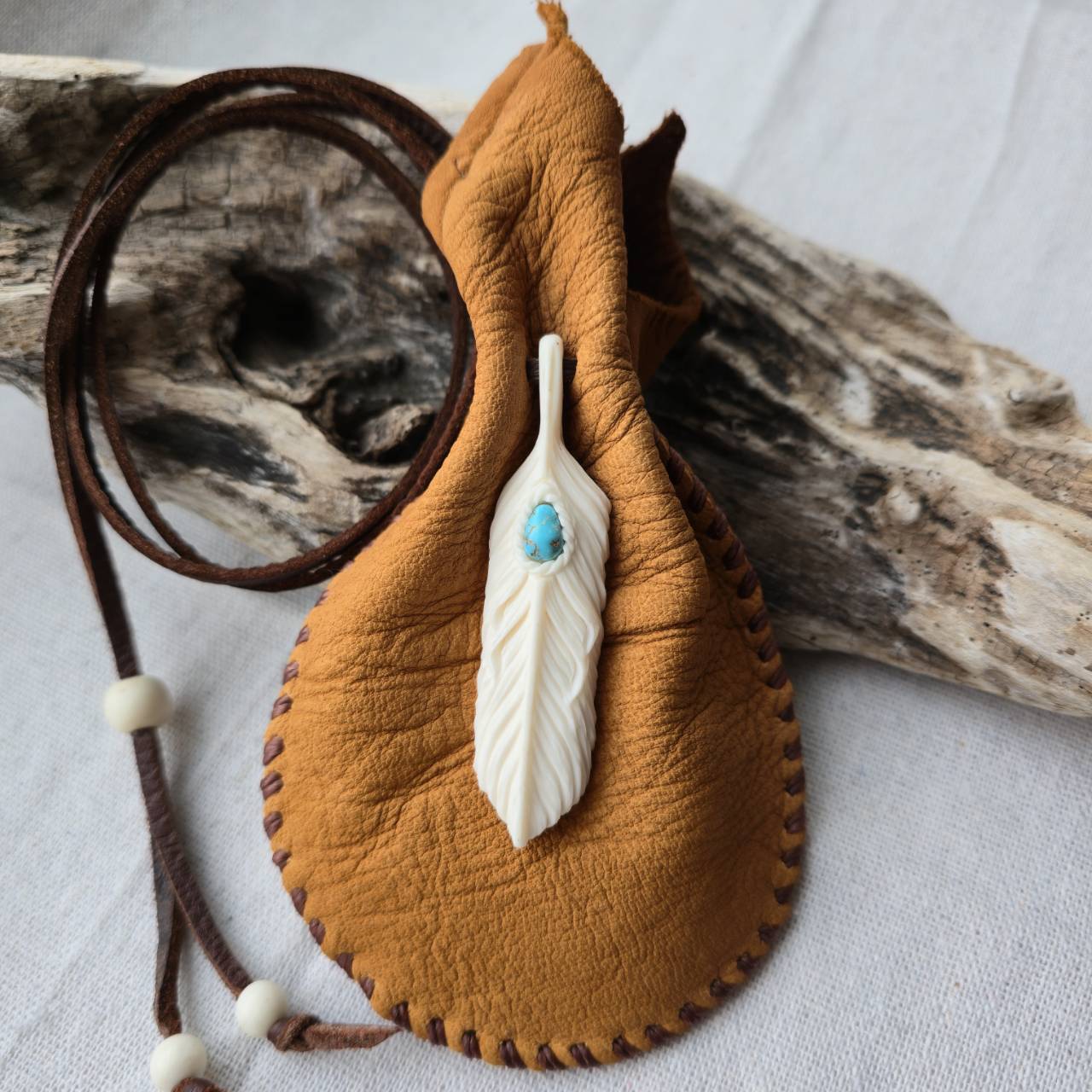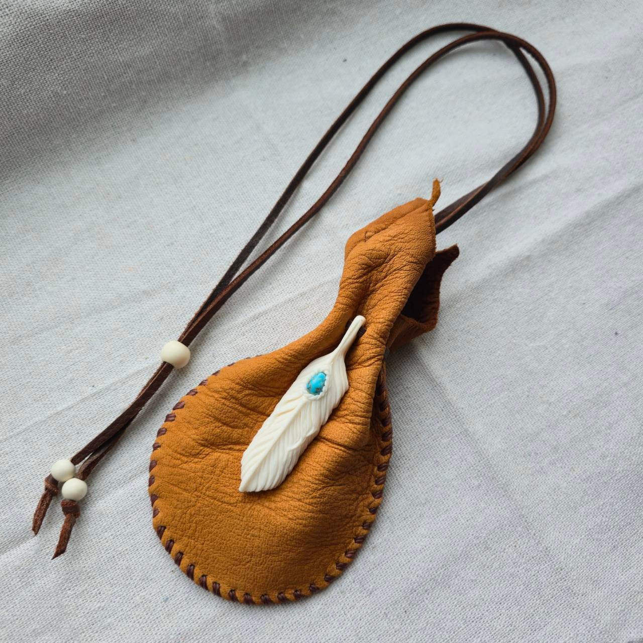 鹿革の巾着ペンダント ローンマウンテンターコイズの鹿角フェザー