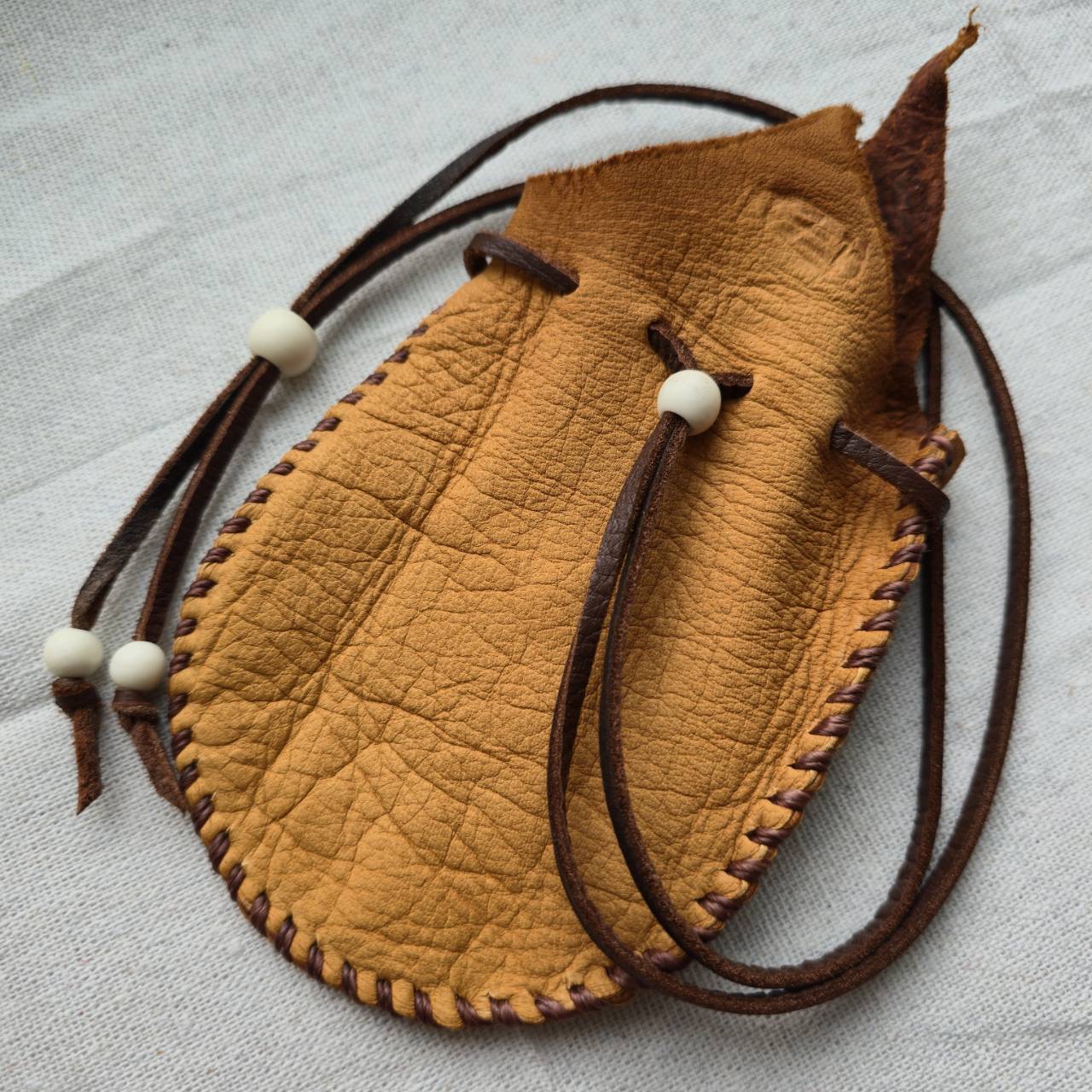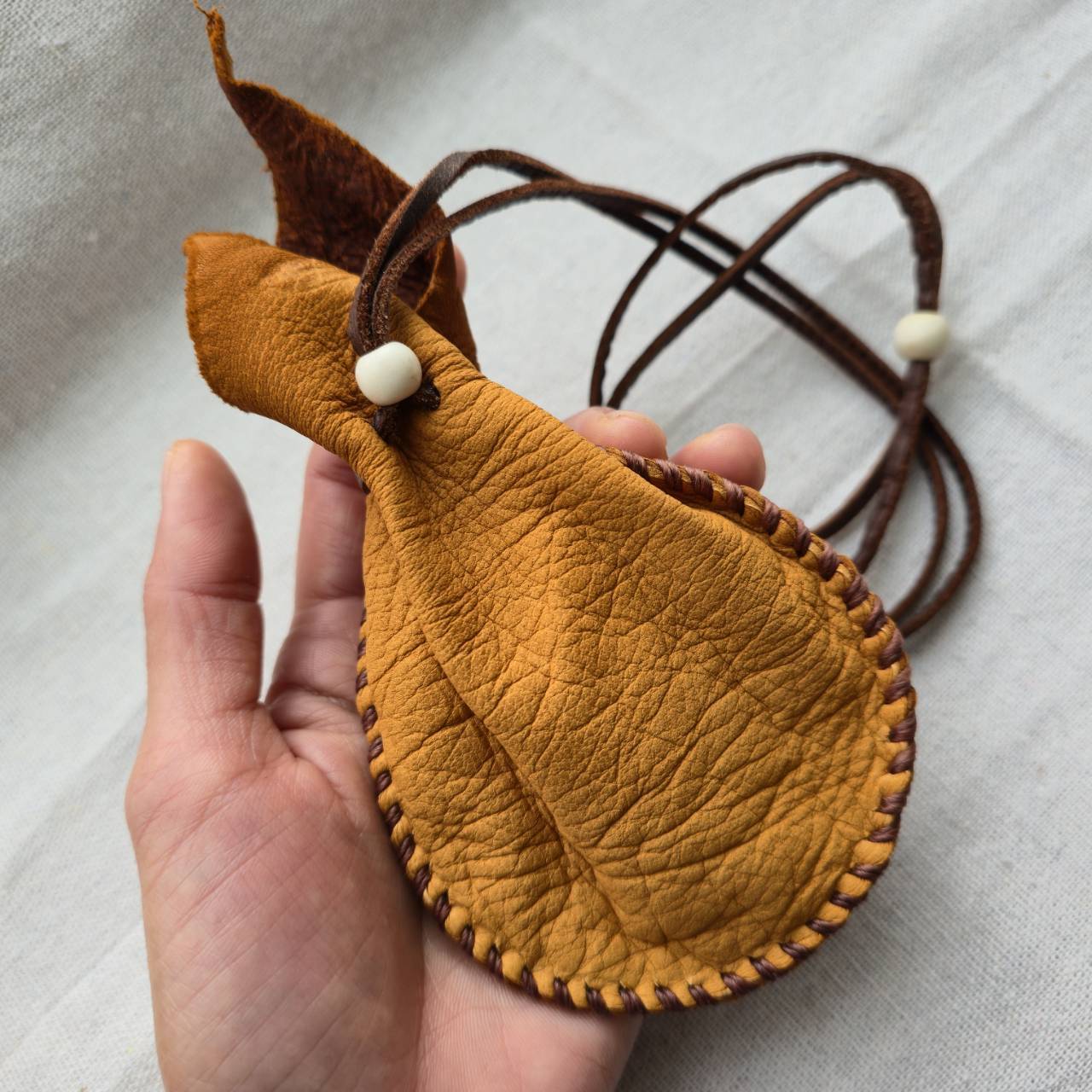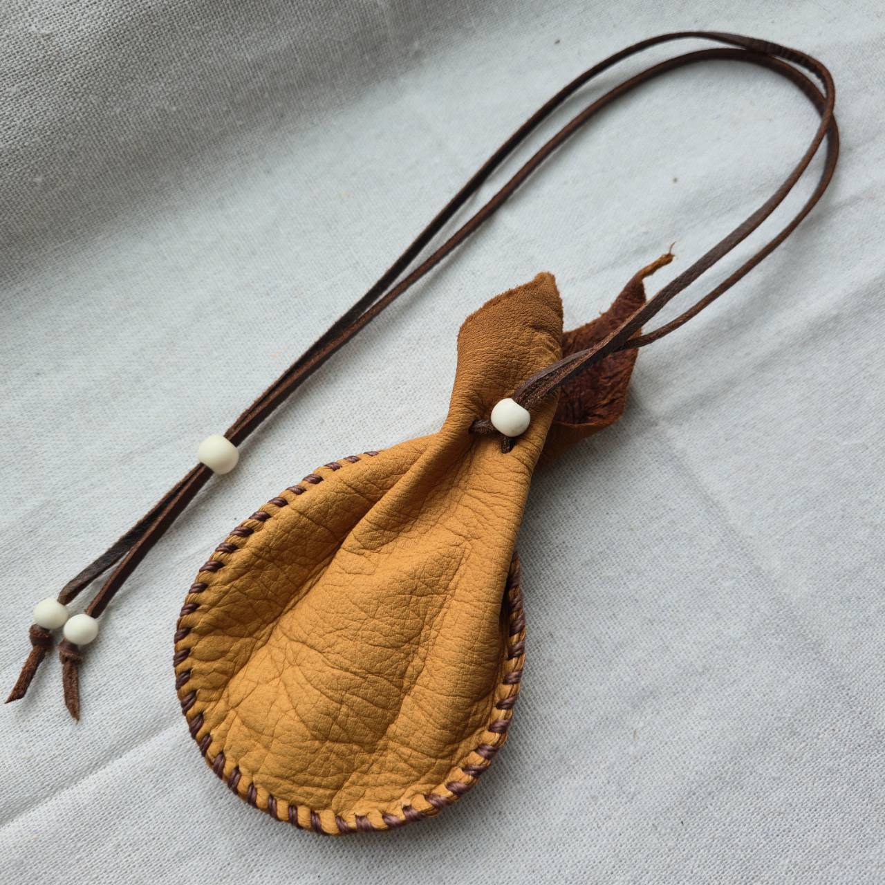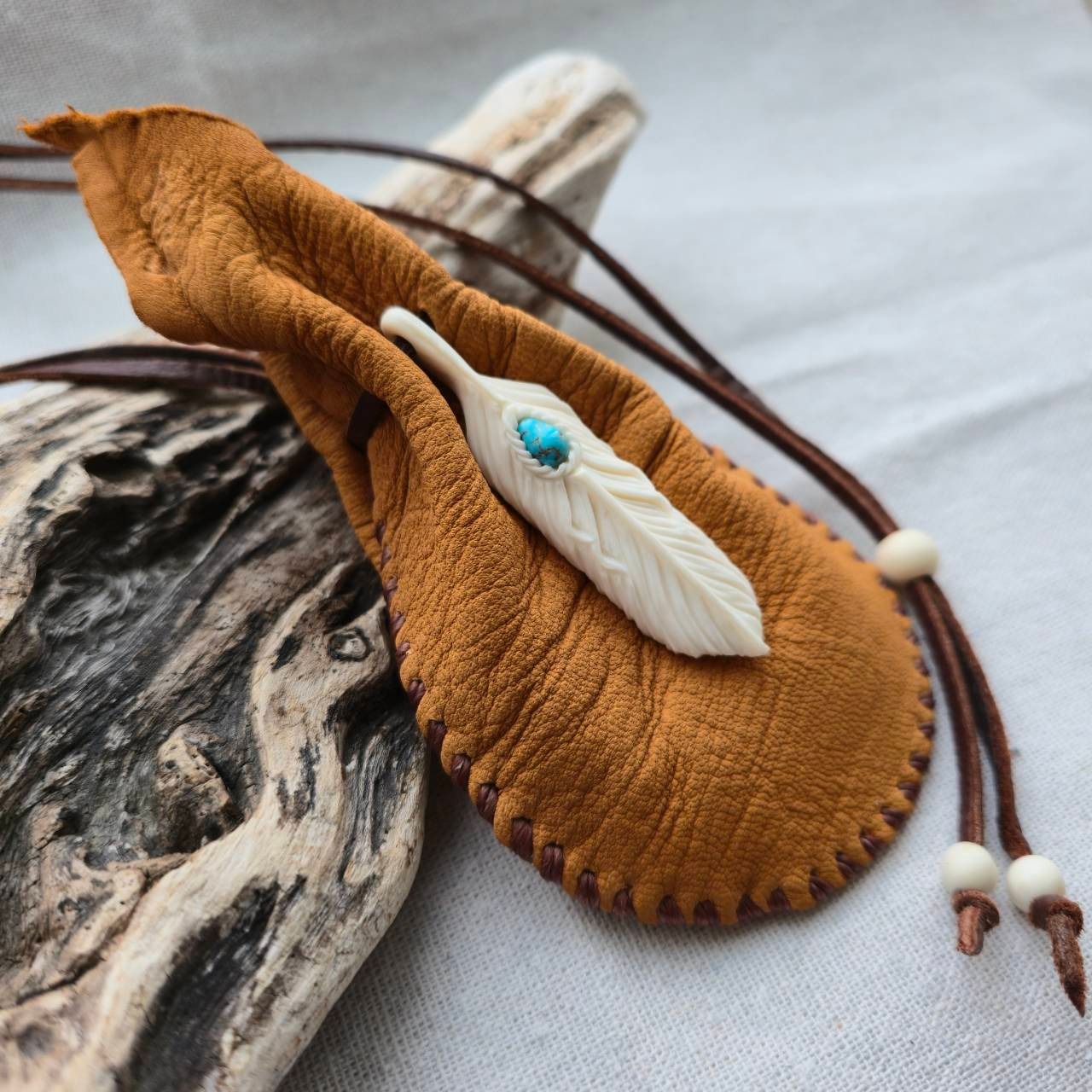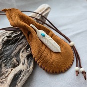 鹿革の巾着ペンダント ローンマウンテンターコイズの鹿角フェザー