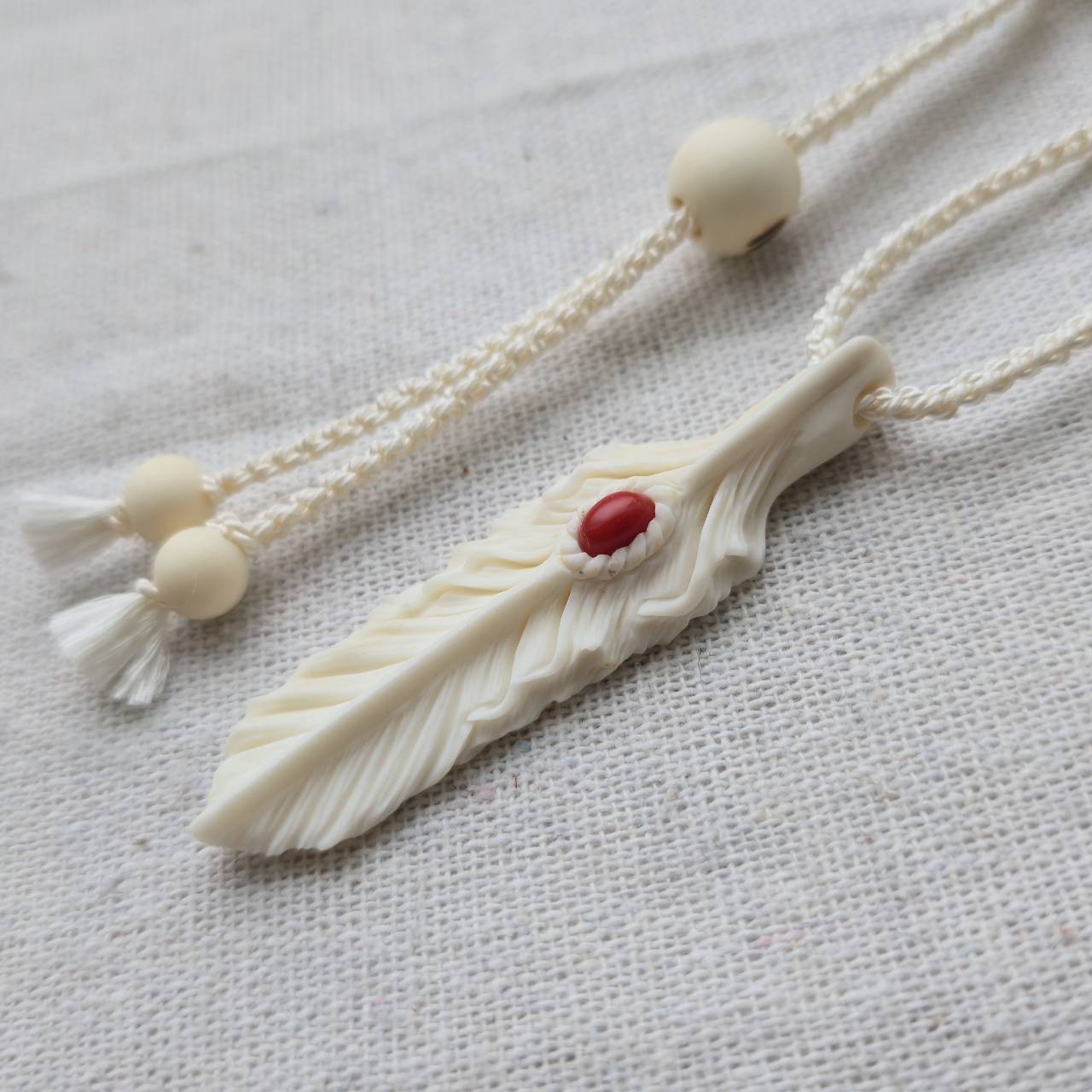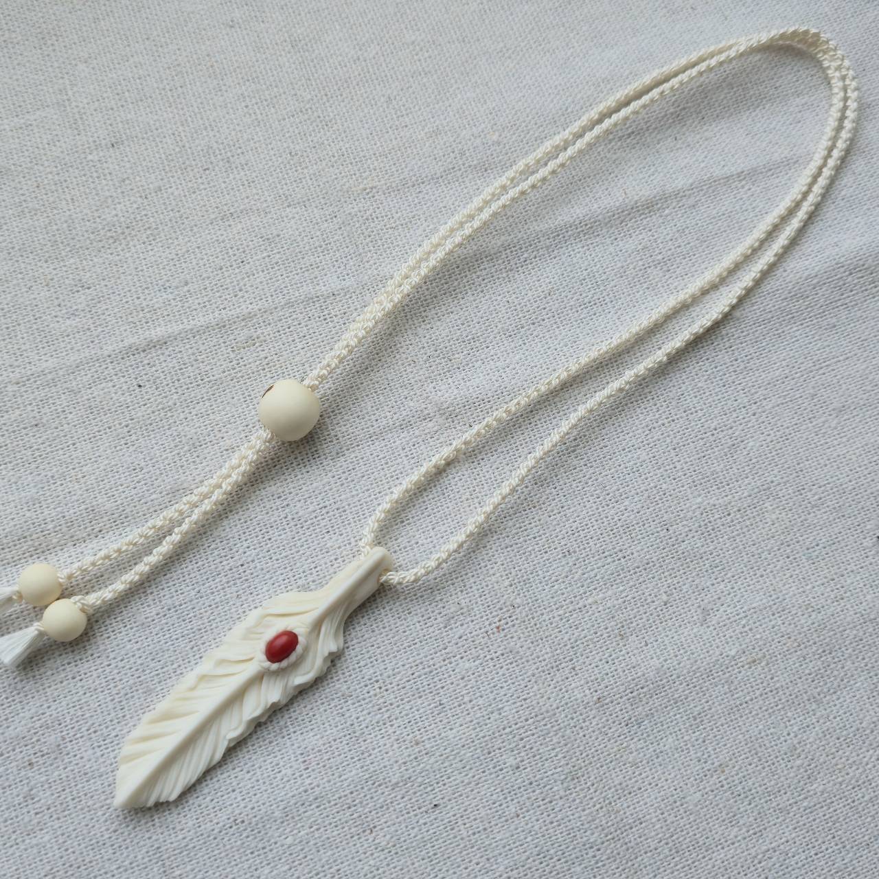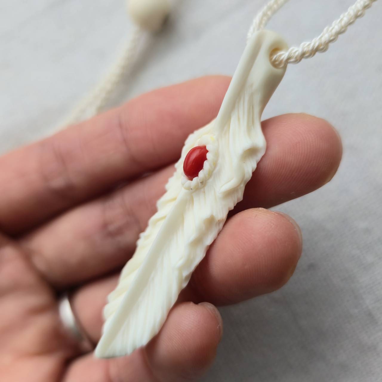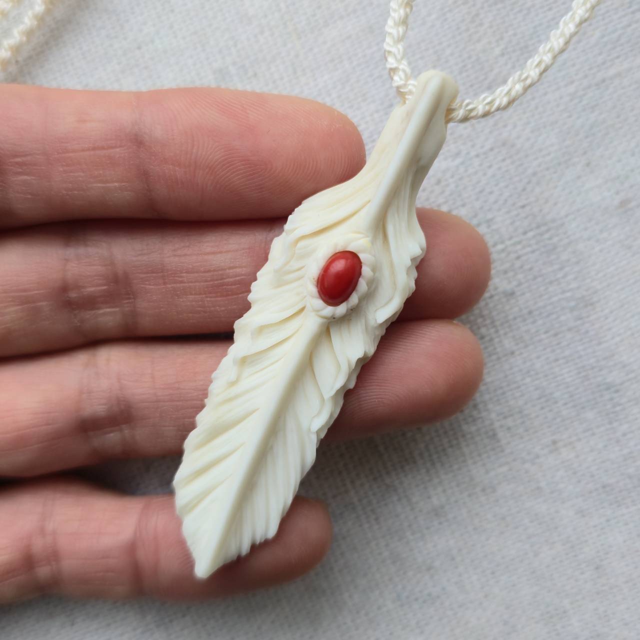 白くなめらかで、わずかにアイボリーがかった艶を持つ鹿の角から削り出したフェザーには、イタリア サルデーニャ島で採れた天然の赤珊瑚を埋め込んでいます。