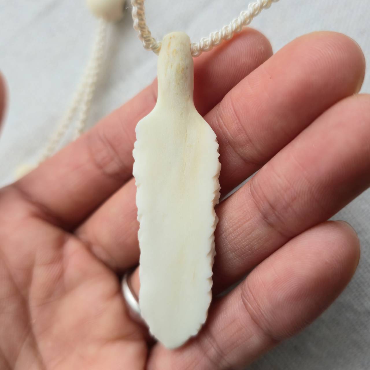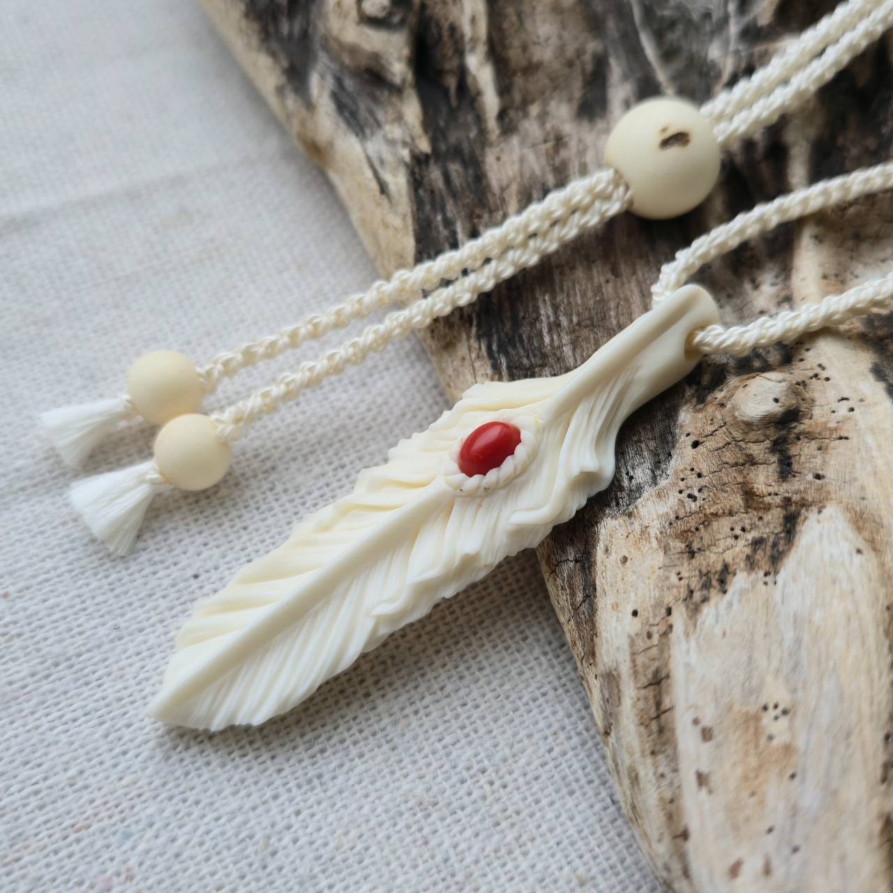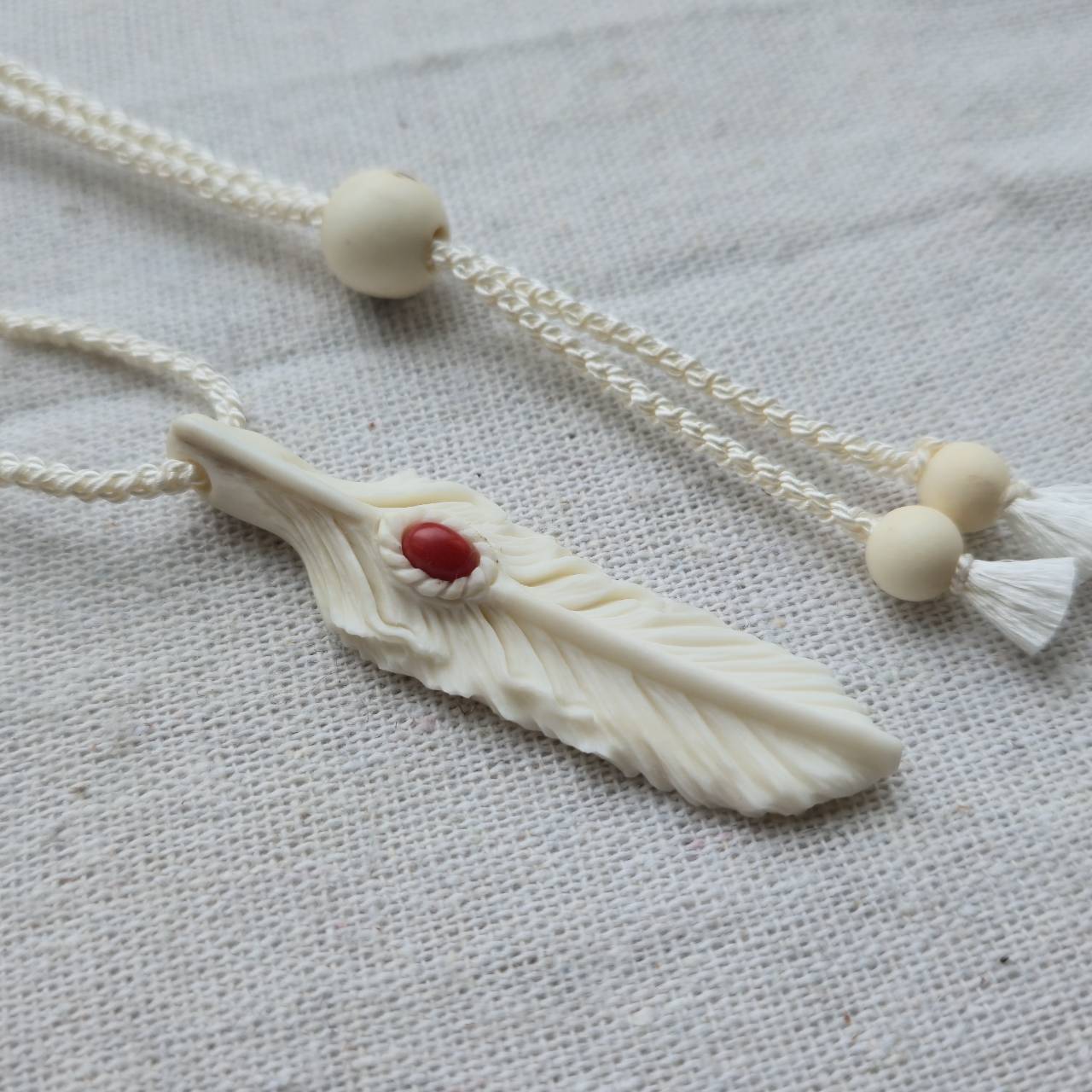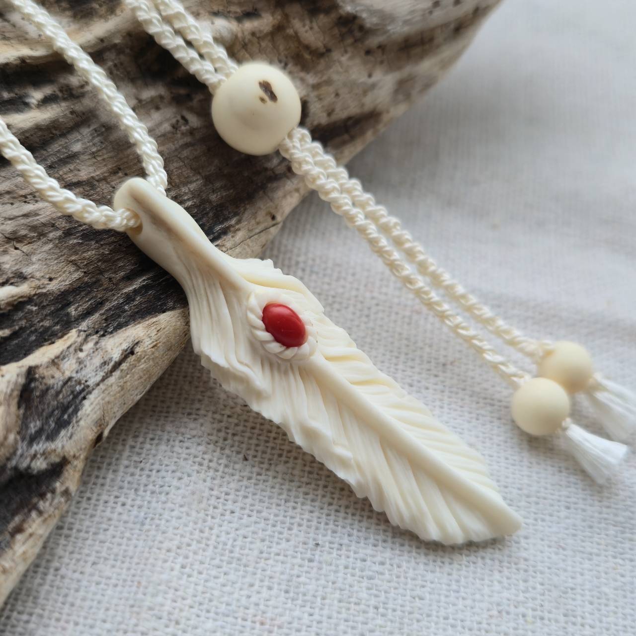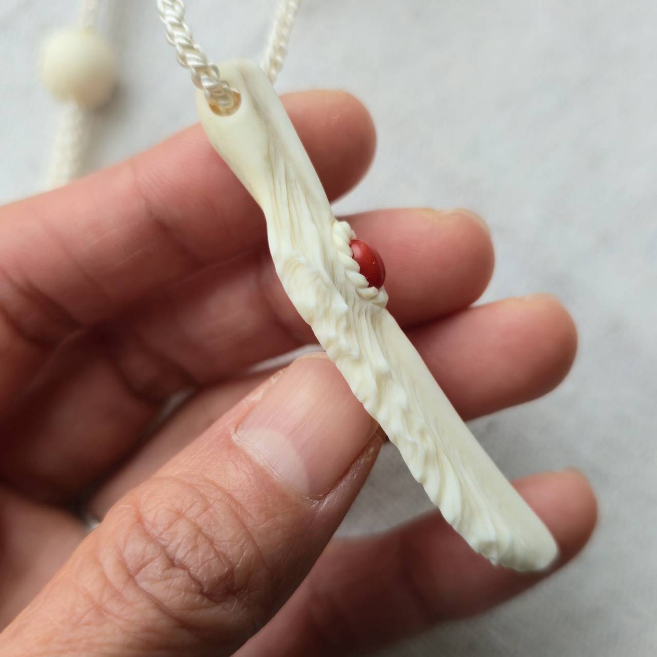 白くなめらかで、わずかにアイボリーがかった艶を持つ鹿の角から削り出したフェザーには、イタリア サルデーニャ島で採れた天然の赤珊瑚を埋め込んでいます。