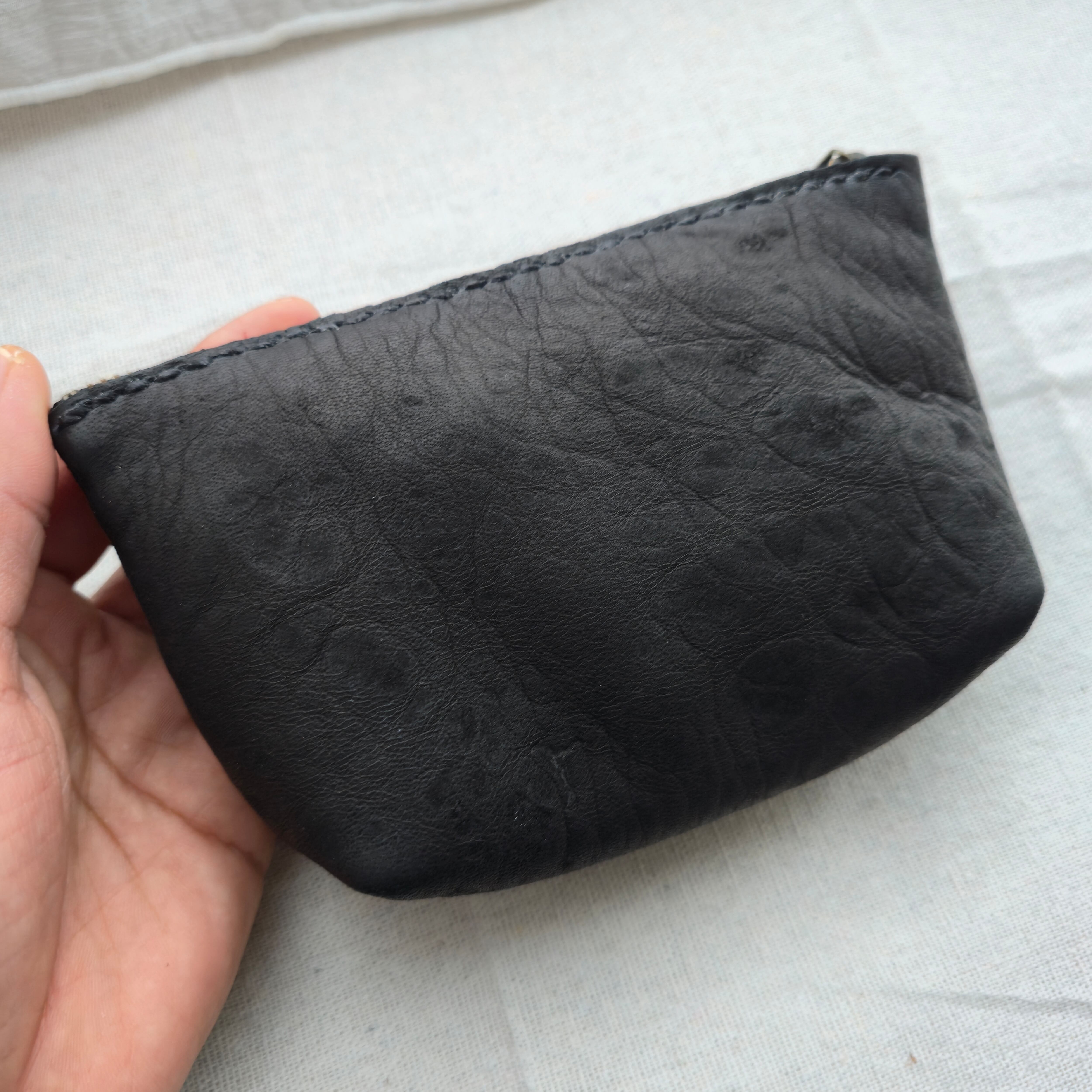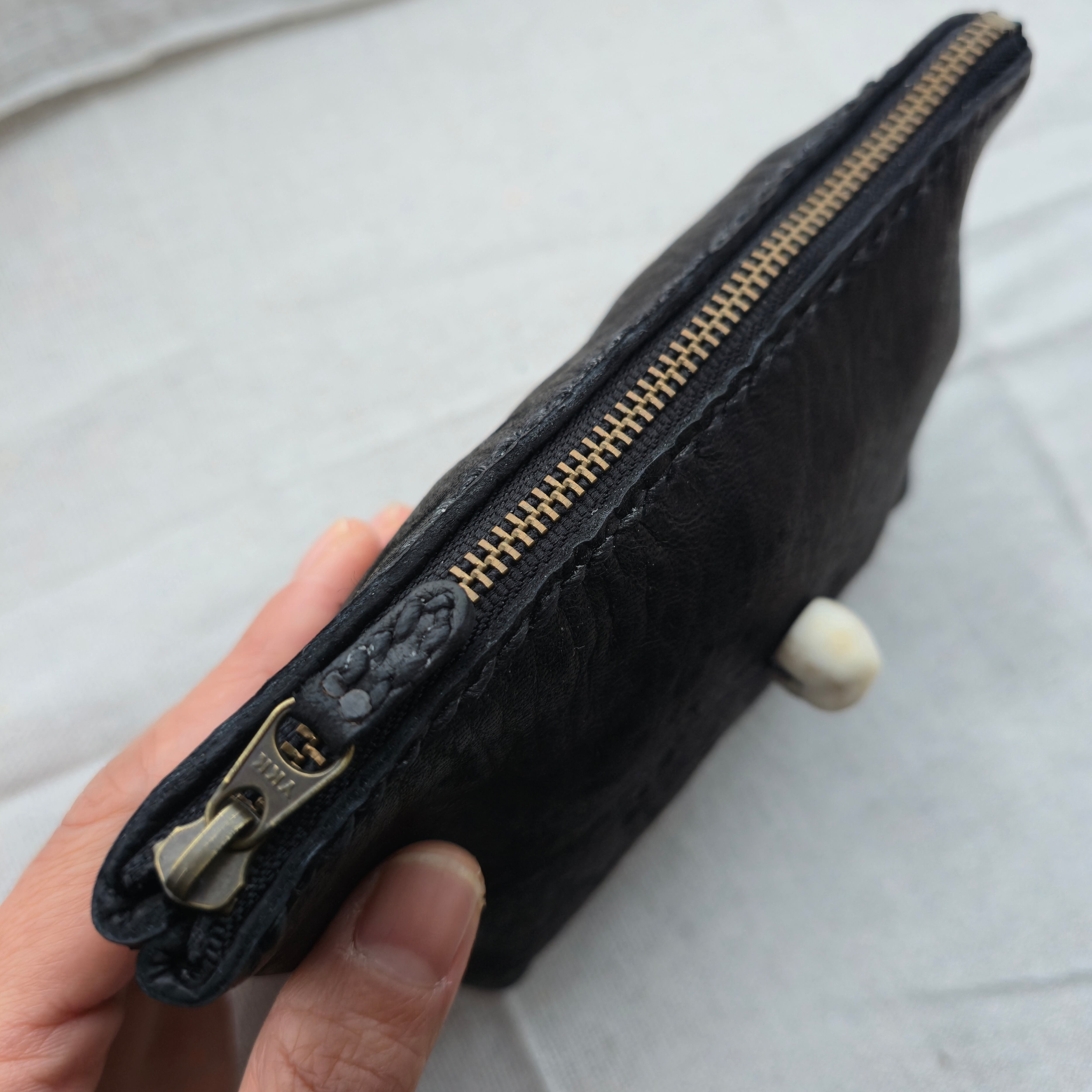 手に取った瞬間、革の質感と素材の力強さがそのまま伝わるポーチです。