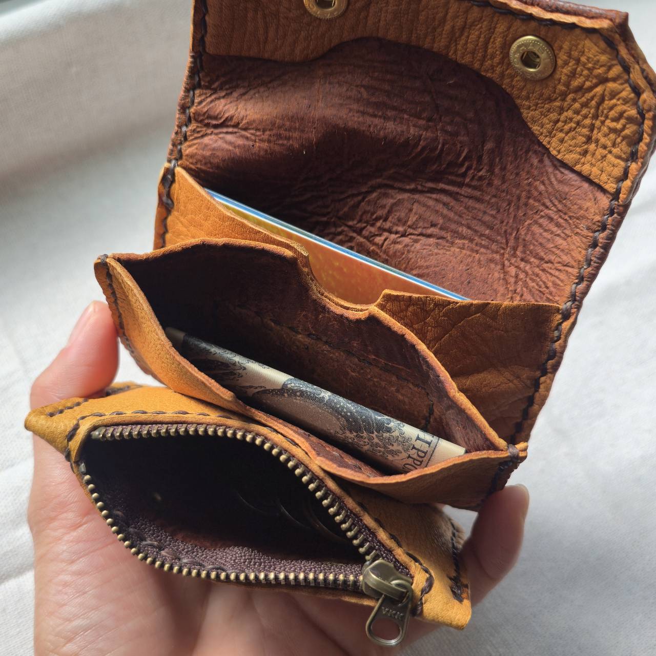 キャッシュレス化が進む暮らしを前提に、必要最低限を無理なく収められるサイズ感を意識して作りました。