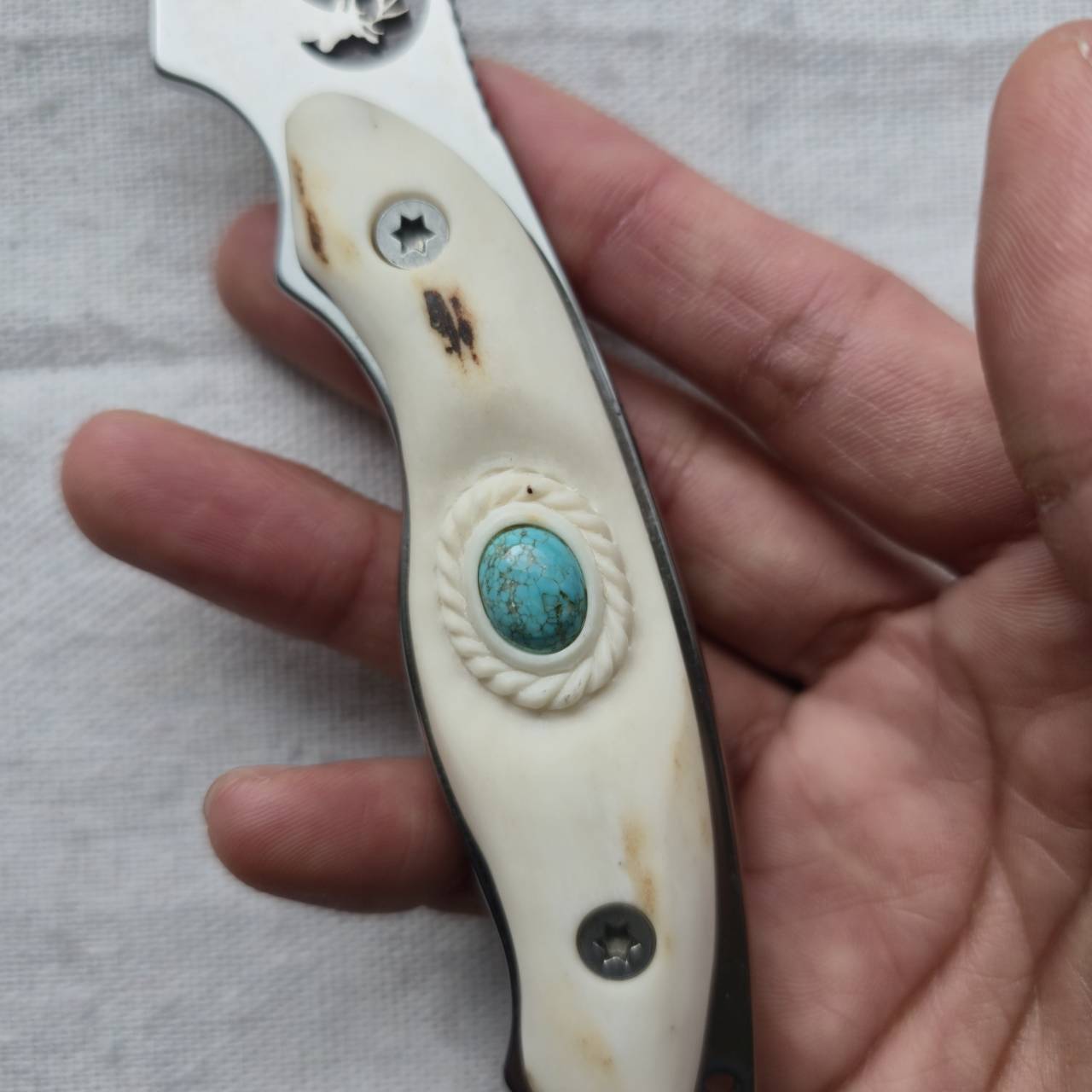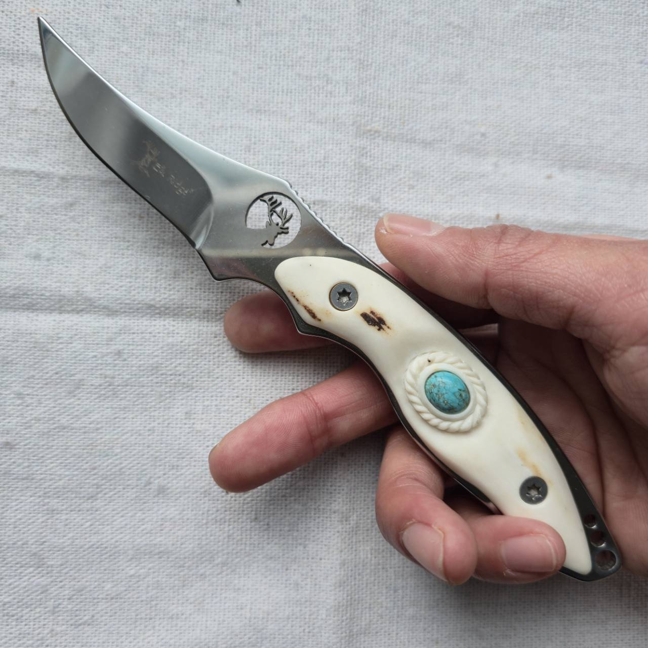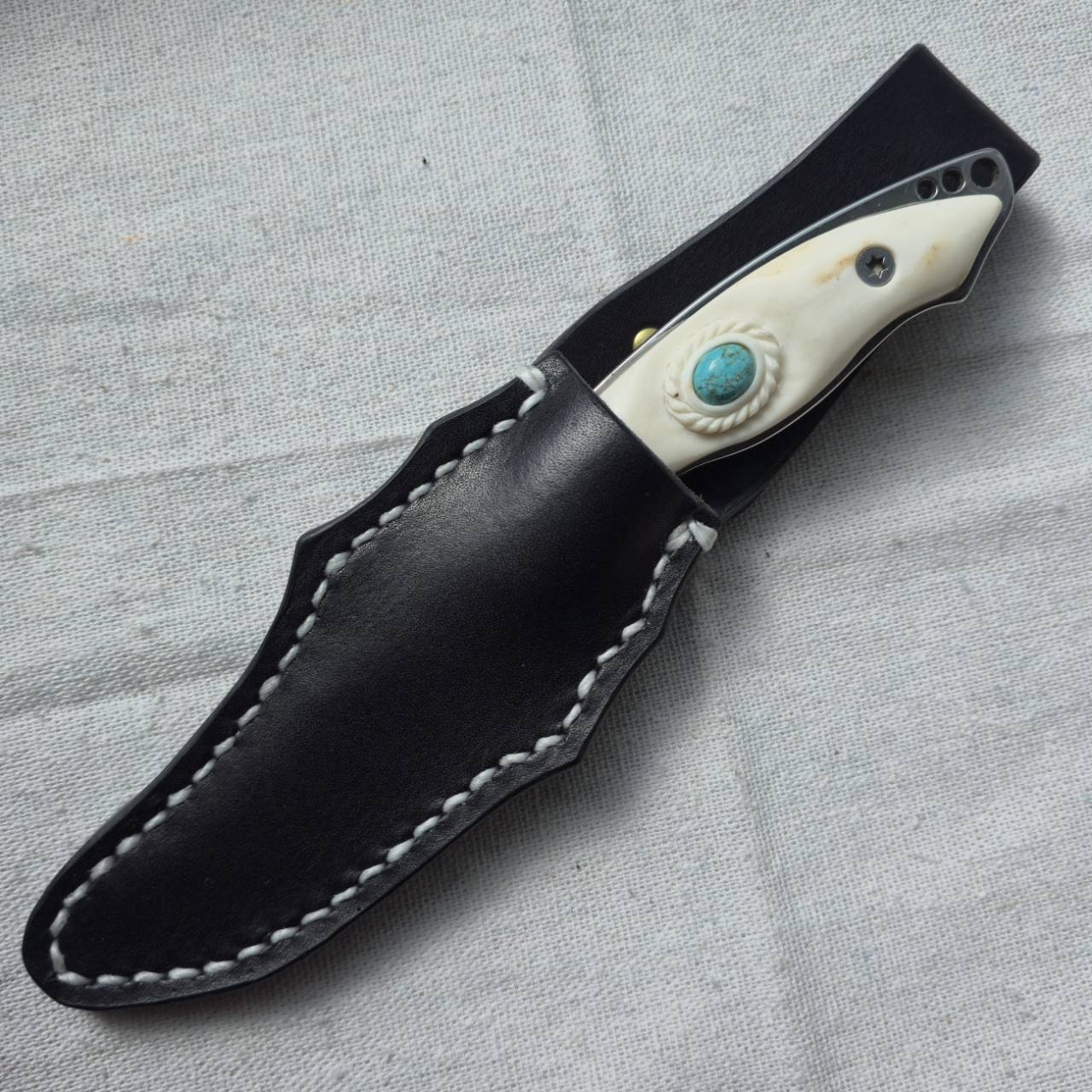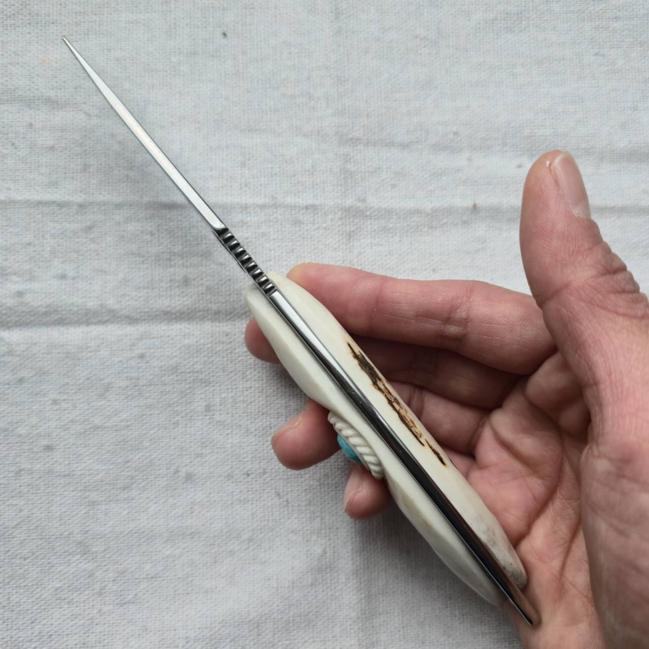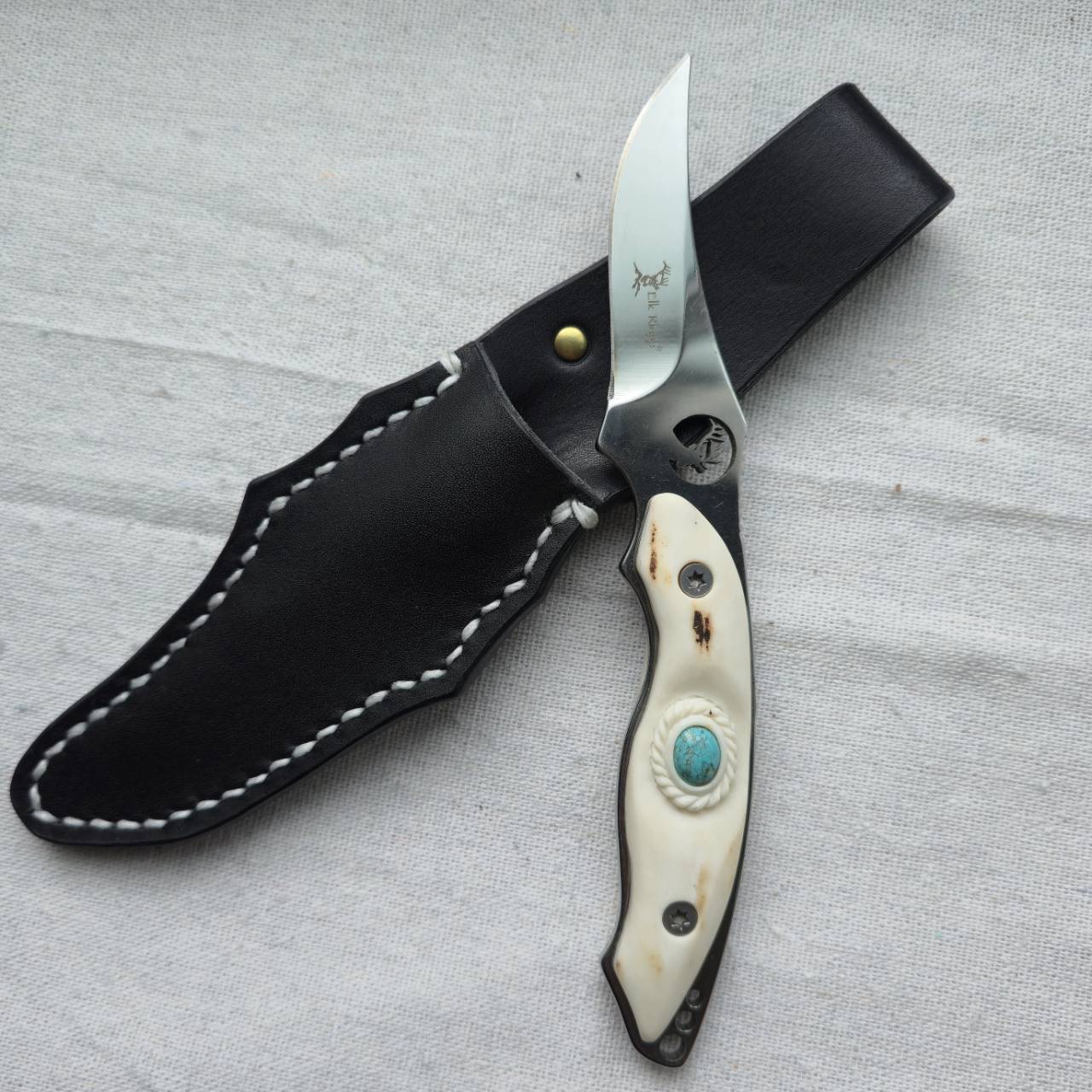 エルクリッジのロゴがくり抜かれ、反り上がった形状のスキナーナイフのブレードをベースに、鹿角グリップへと変更し、ナンバーエイトターコイズを埋め込んでカスタムしました。