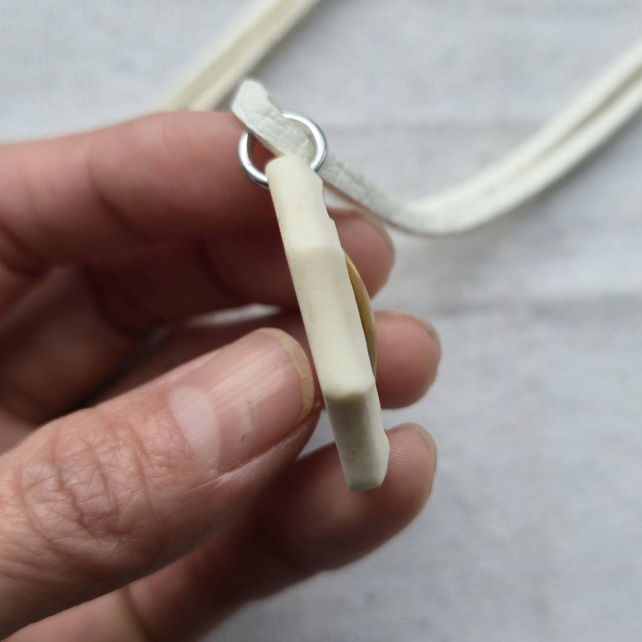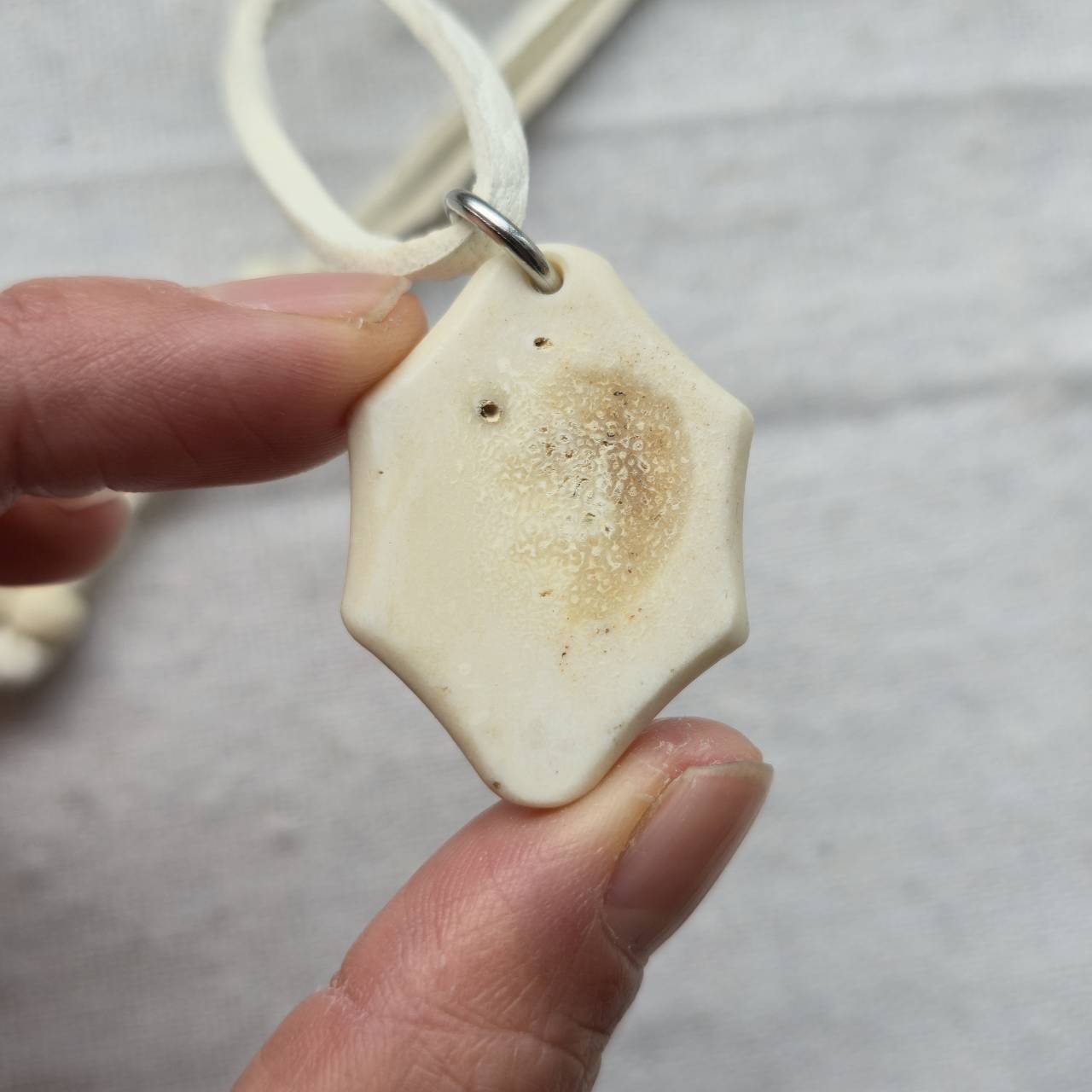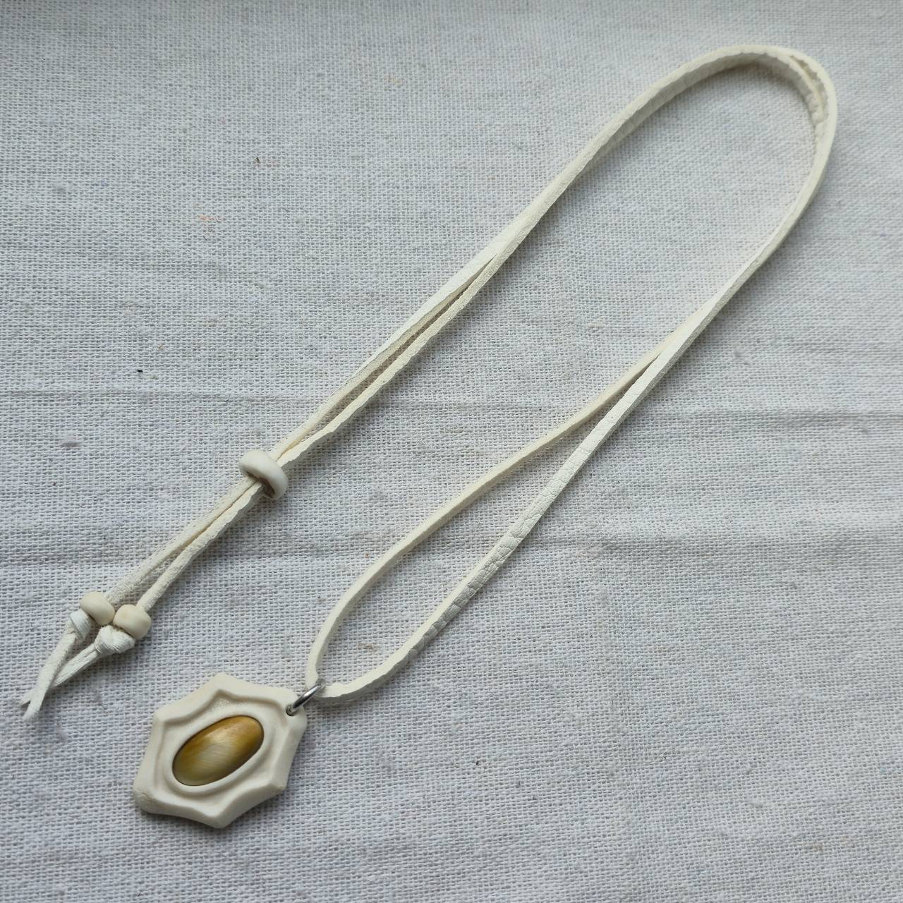 紐には鹿革を使用し、スライドビーズで長さ調整が可能です。