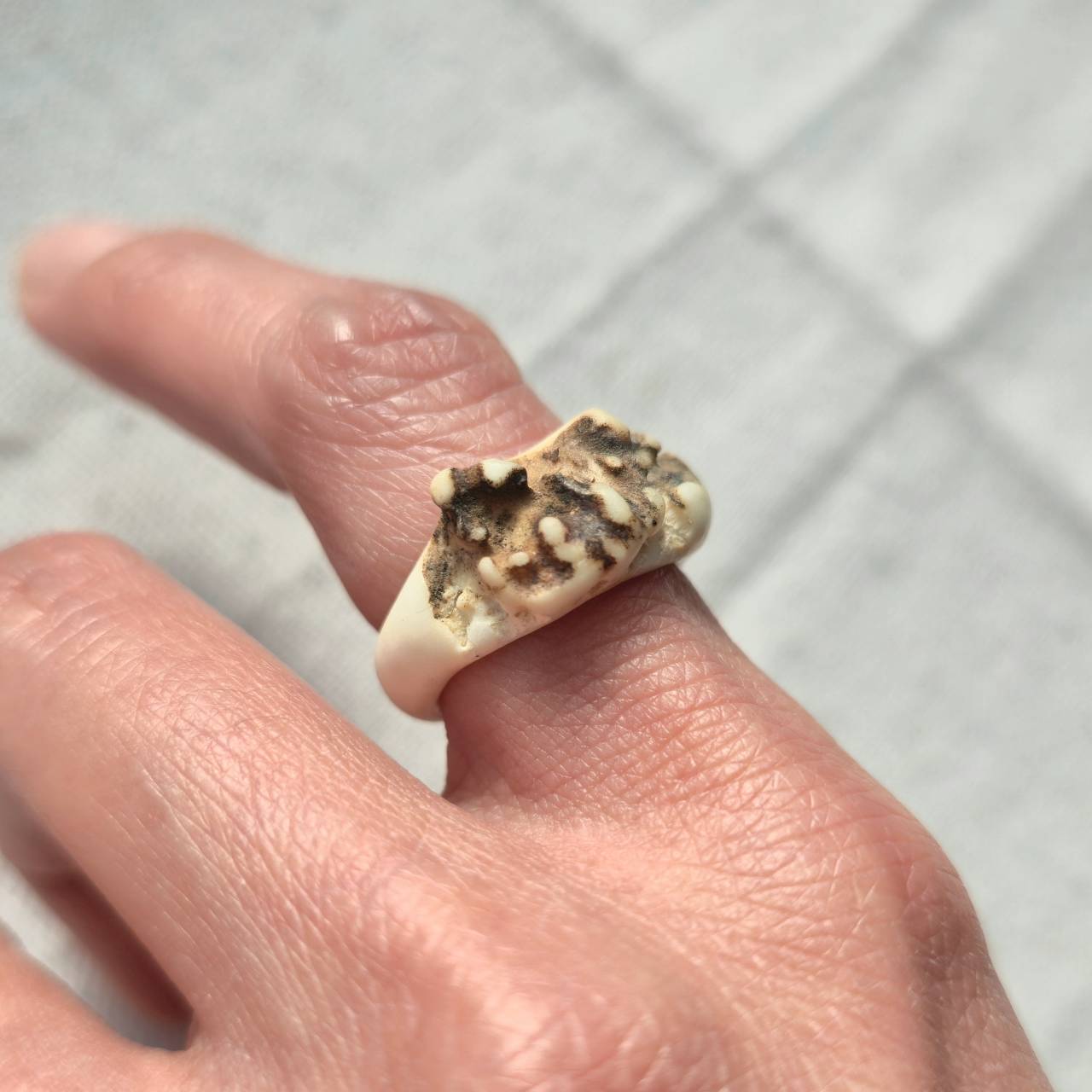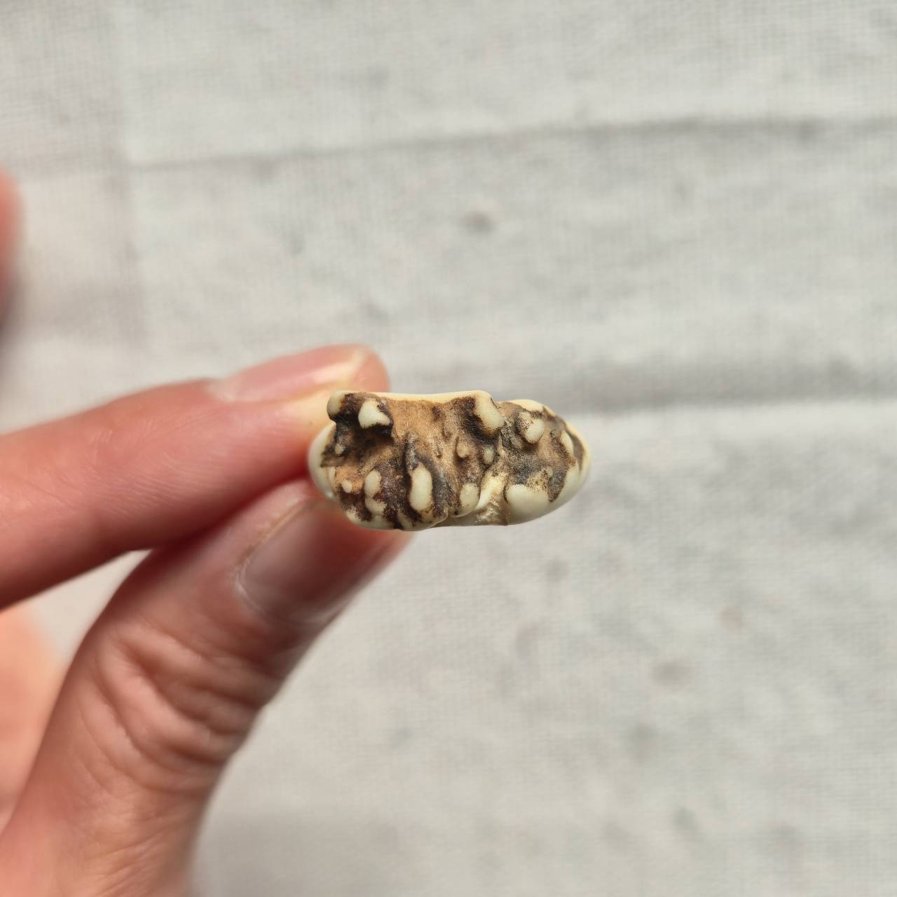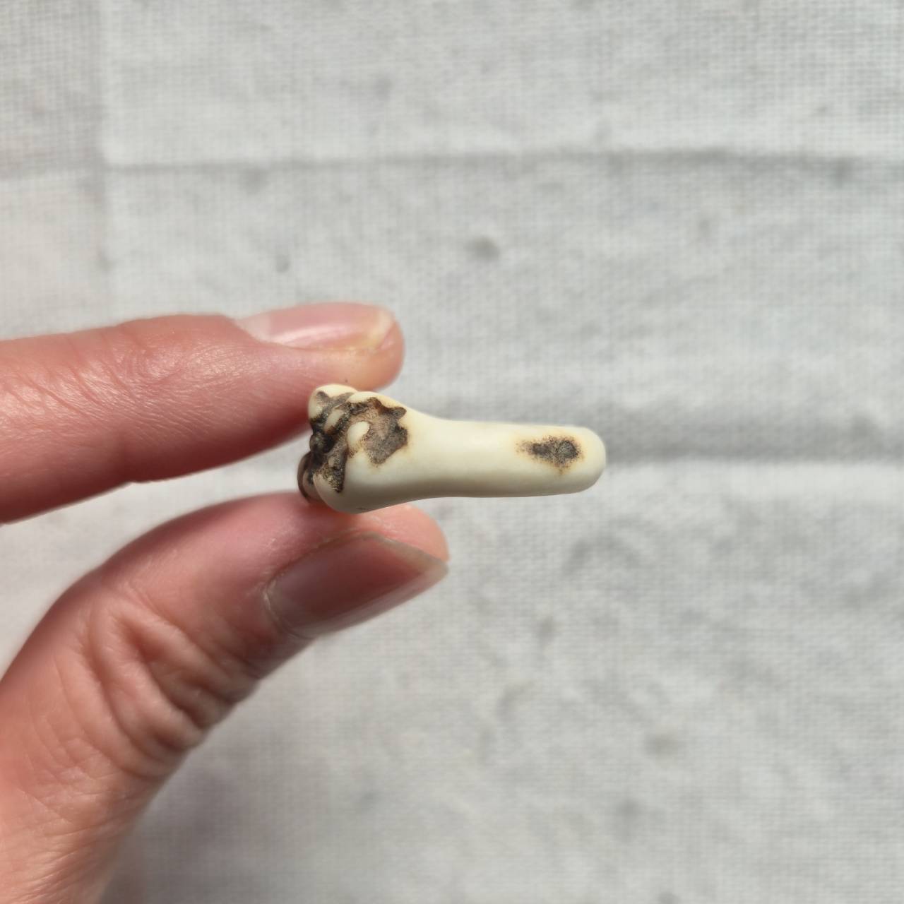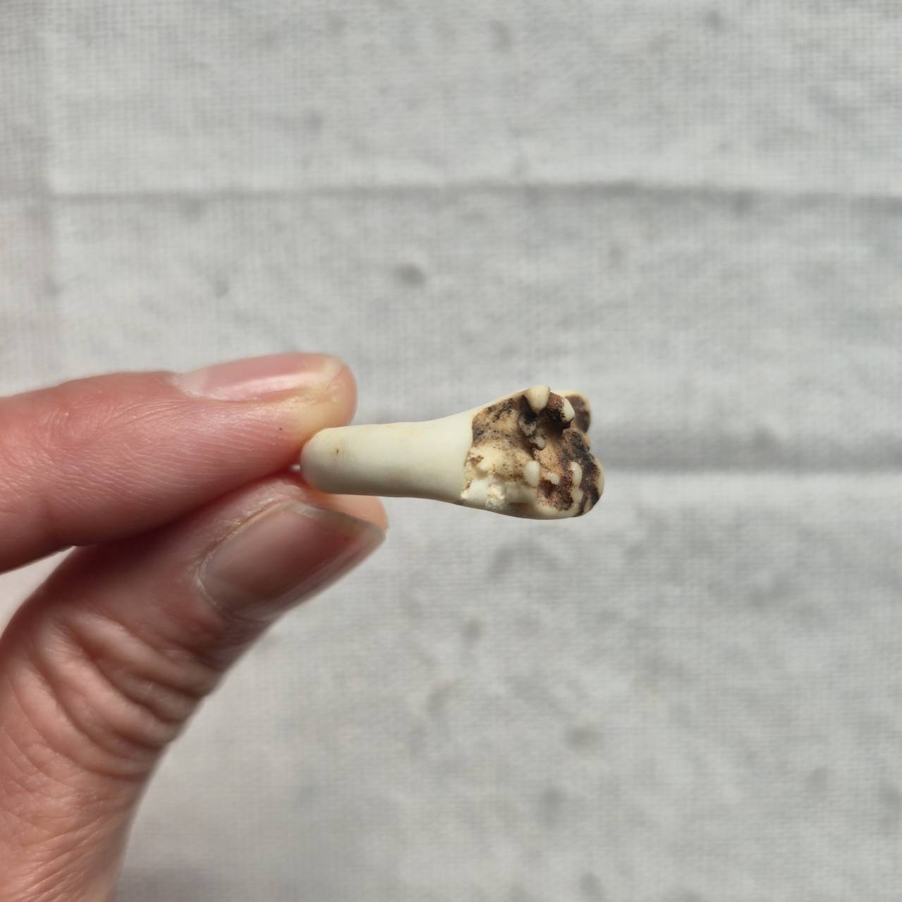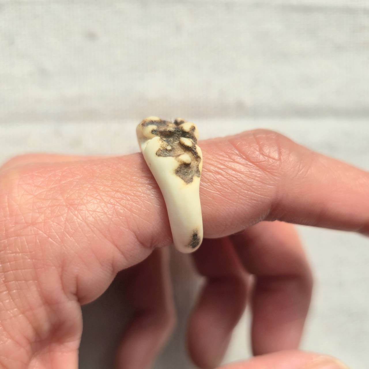 根元部分は骨質が詰まり、滑らかな白と野性を感じる黒ずみ、斑点が混ざり合う部分です。