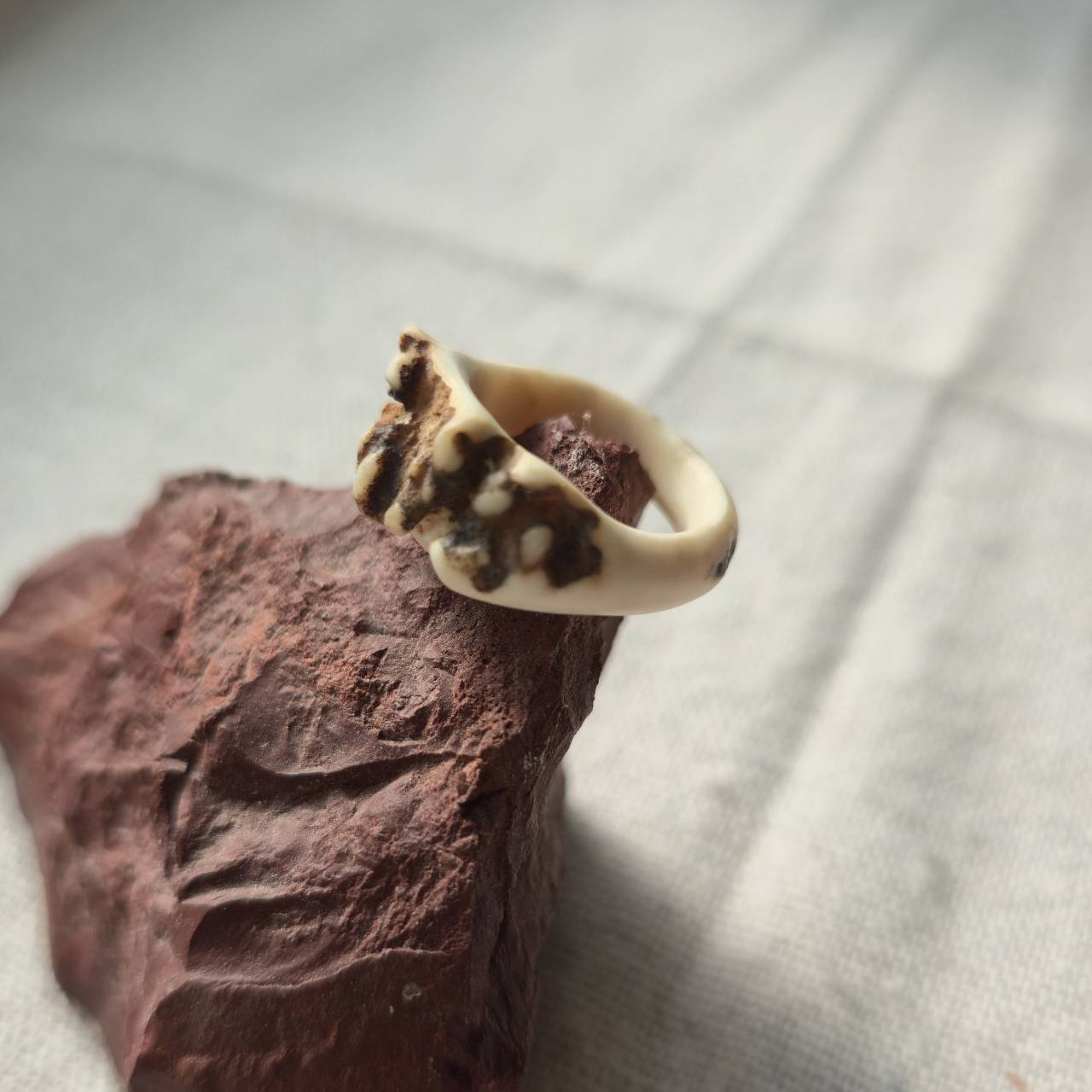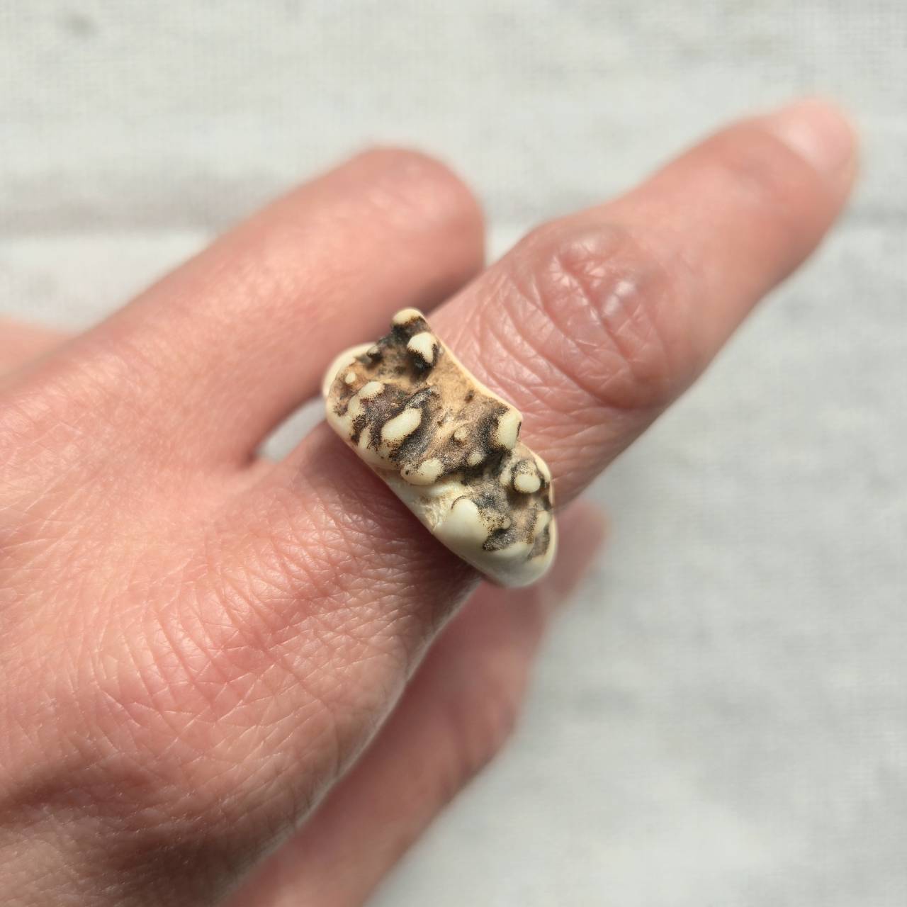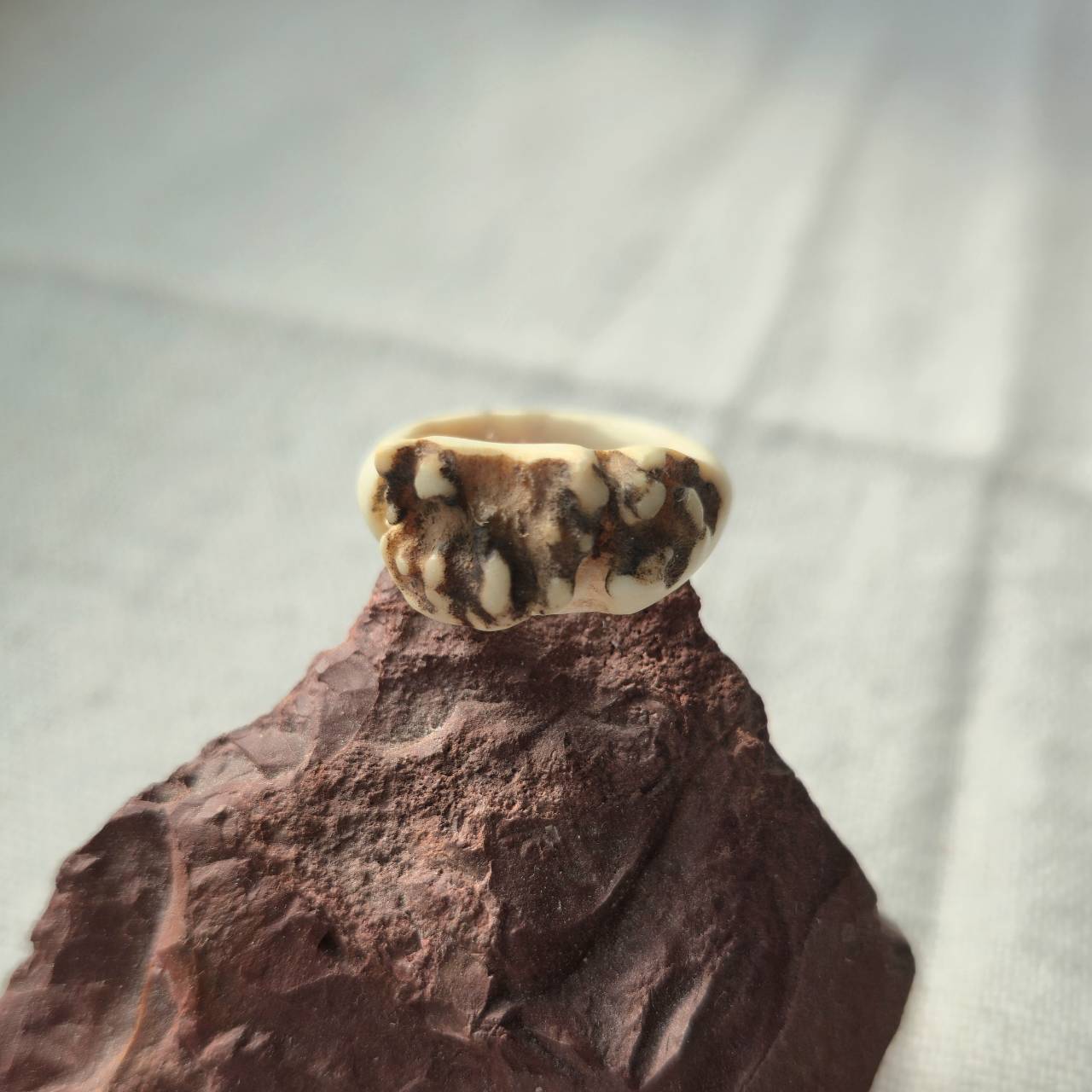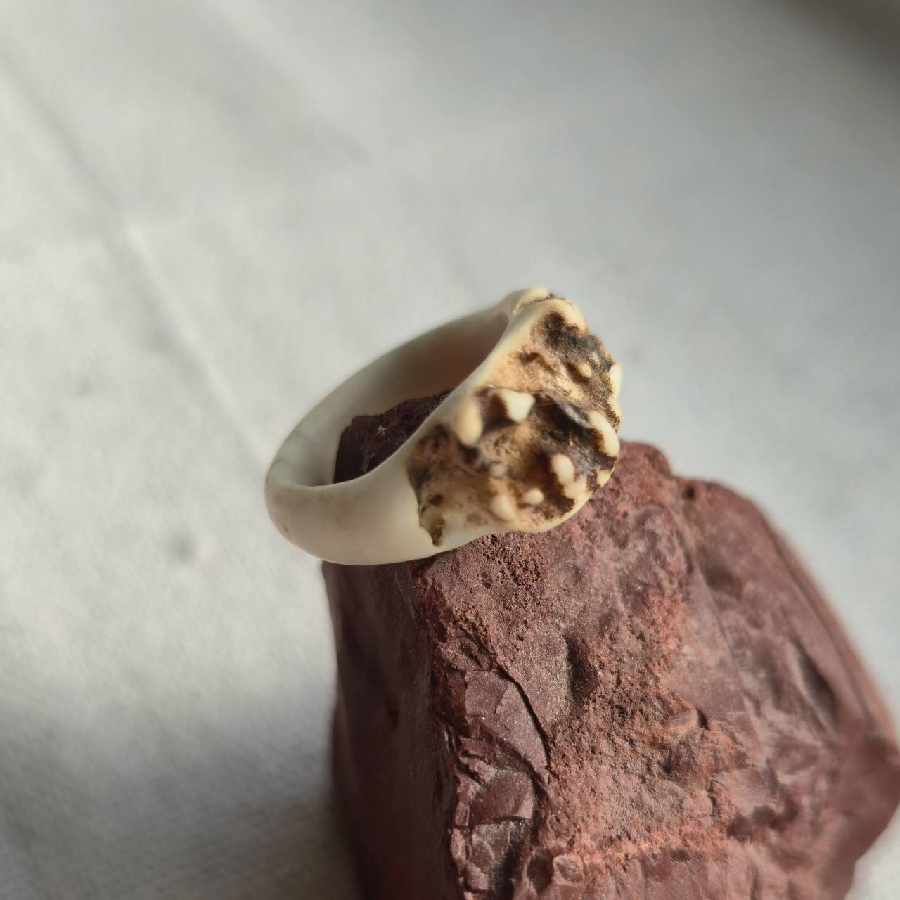 小さい鹿の角の根元から削り出して制作したリングです。