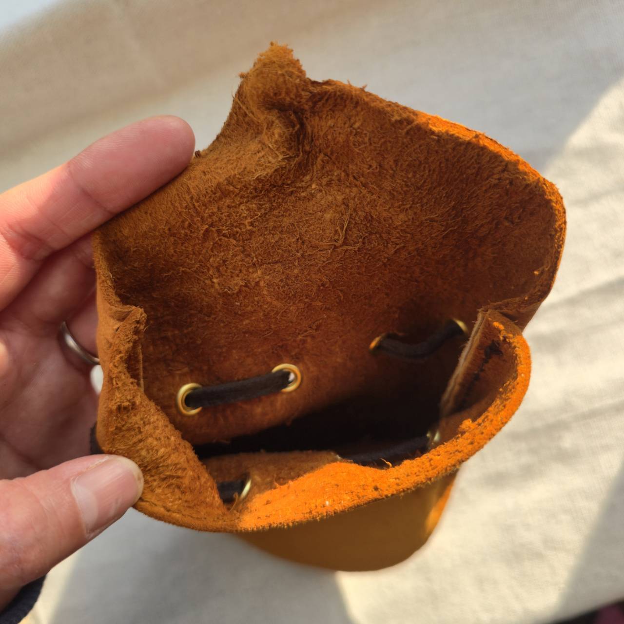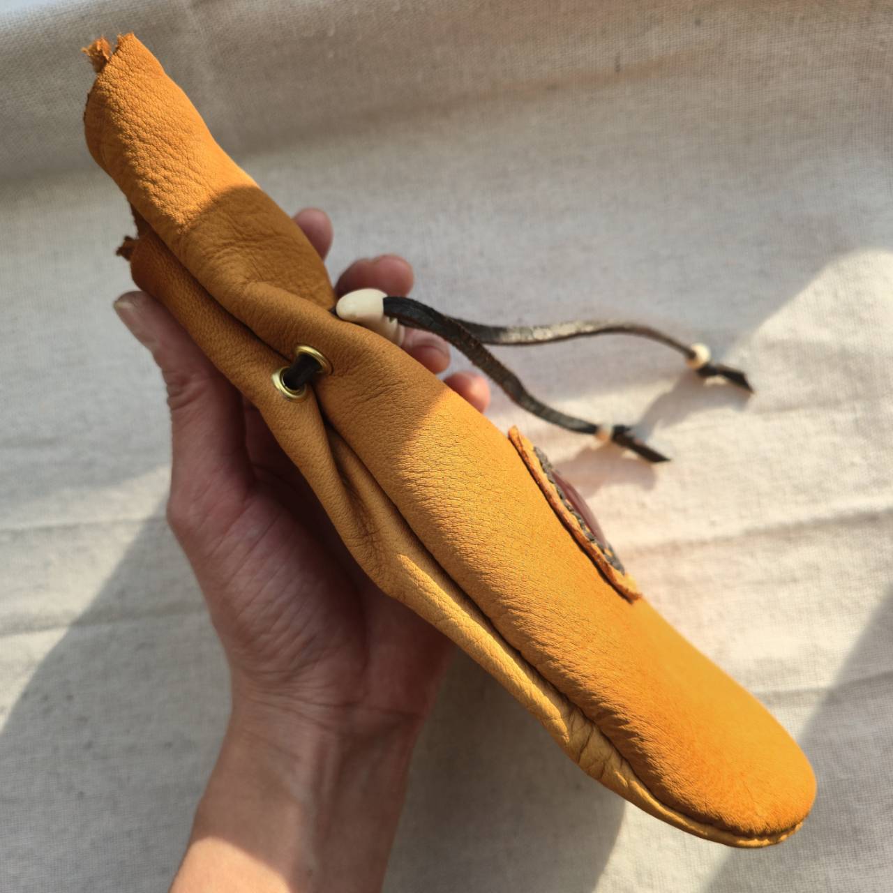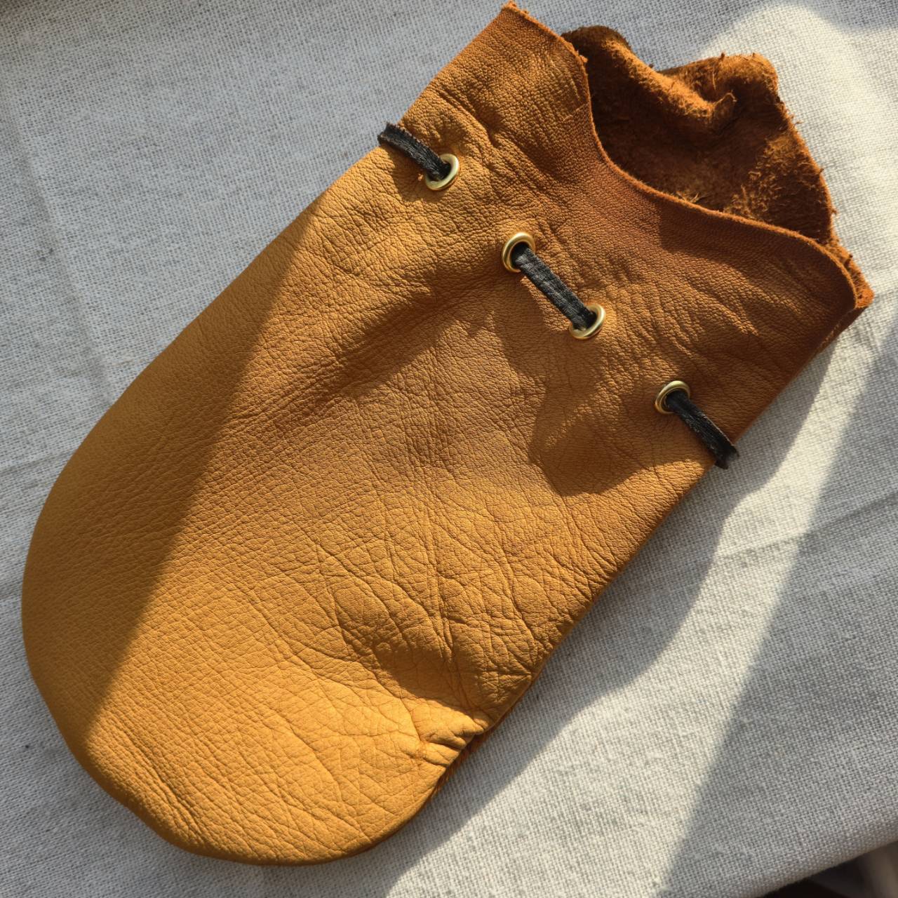 開閉は紐を絞るシンプルな構造ですが、その要となるストッパーには鹿の角を削り出して制作したパーツを使っています。