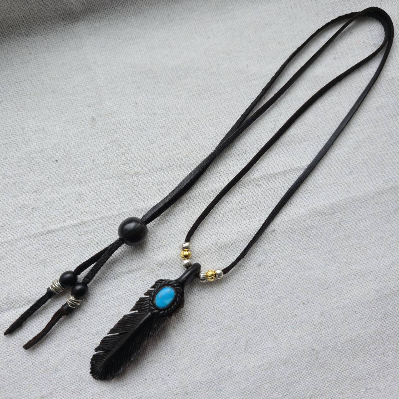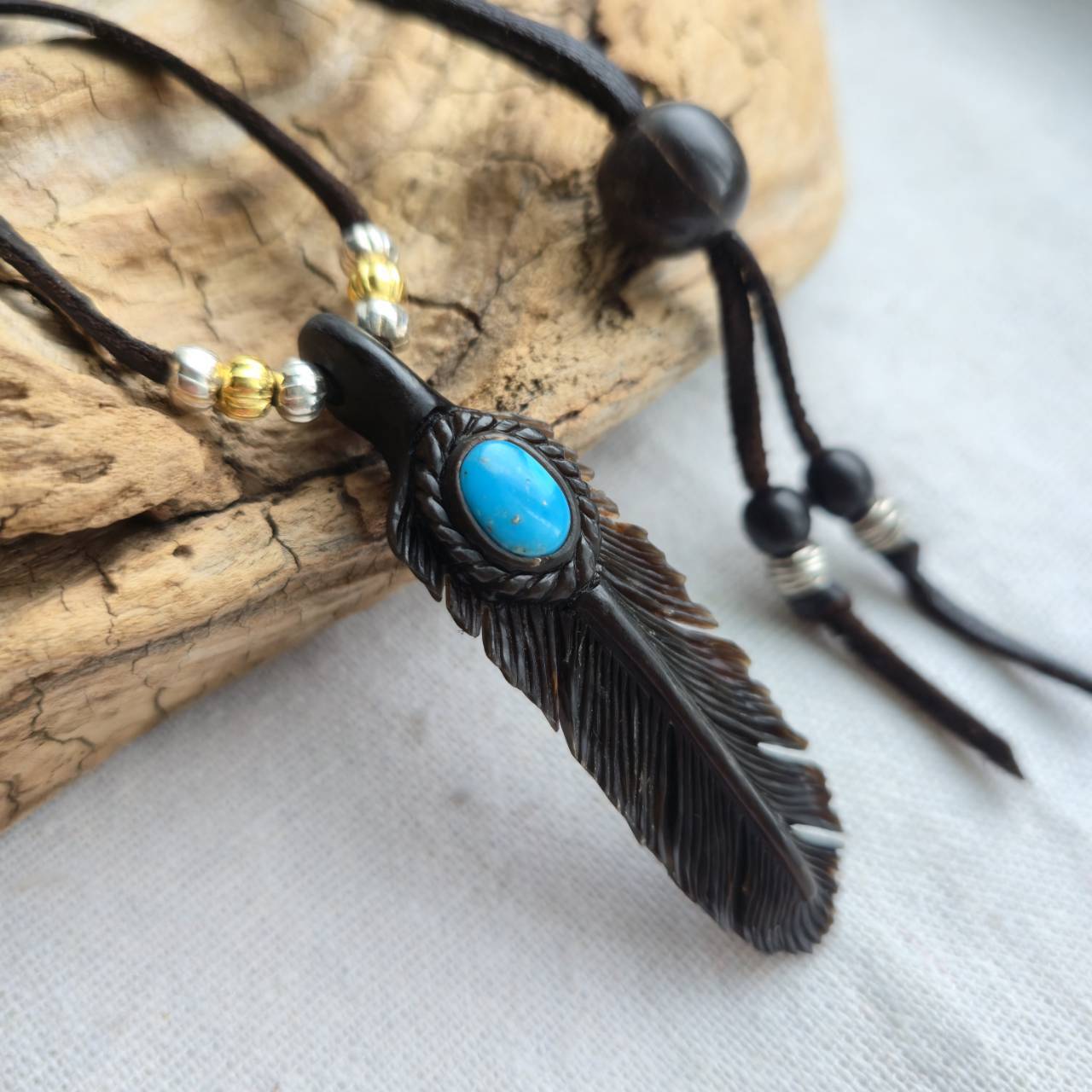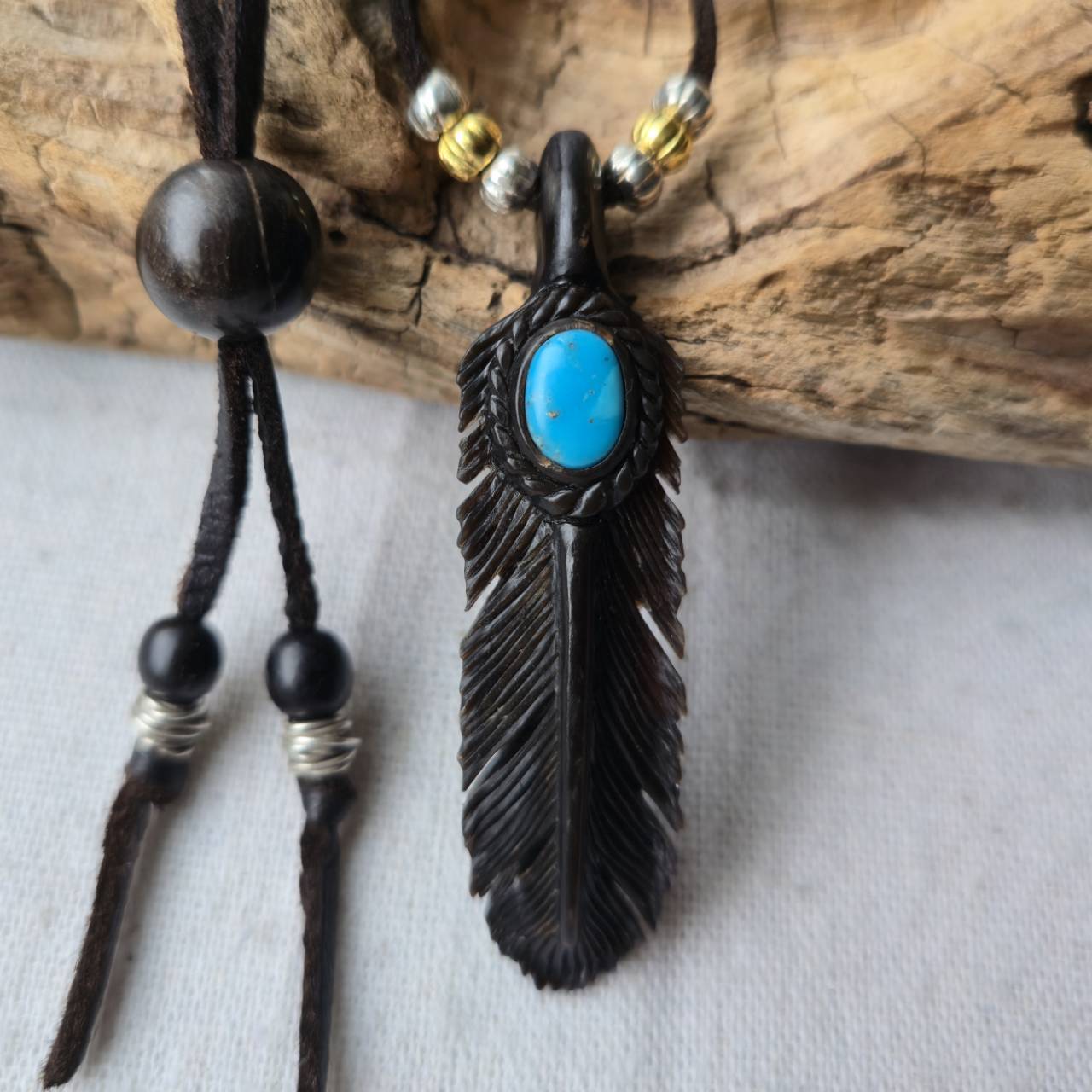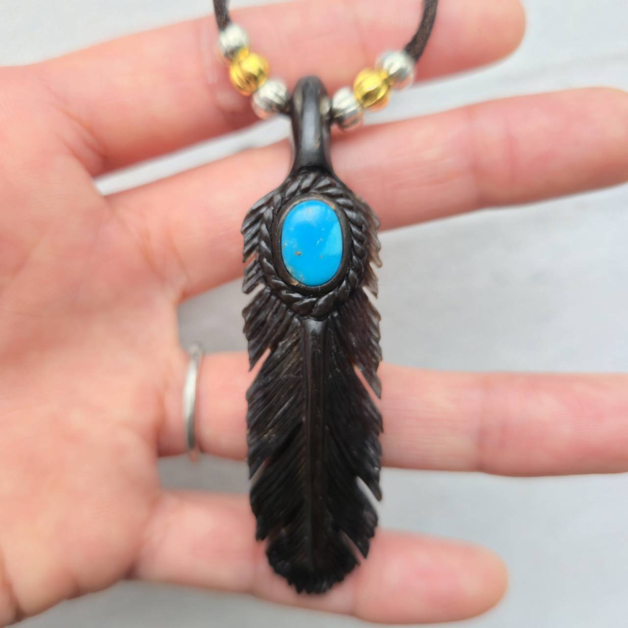水牛の角 スリーピングビューティーターコイズのフェザーペンダント