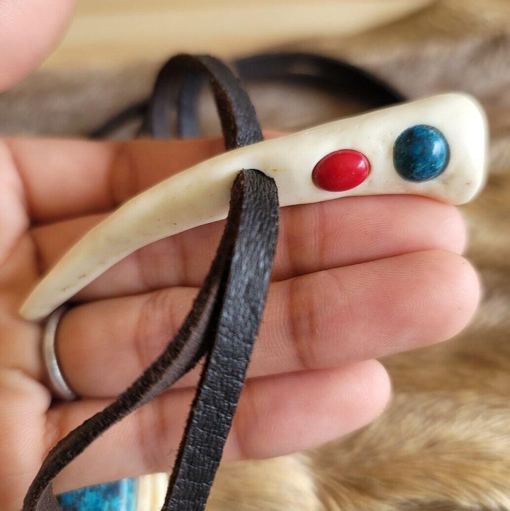 調整用の鹿角端部には白化したものを使用し、レッドコーラル、クリソコラのルースを埋め込みました。