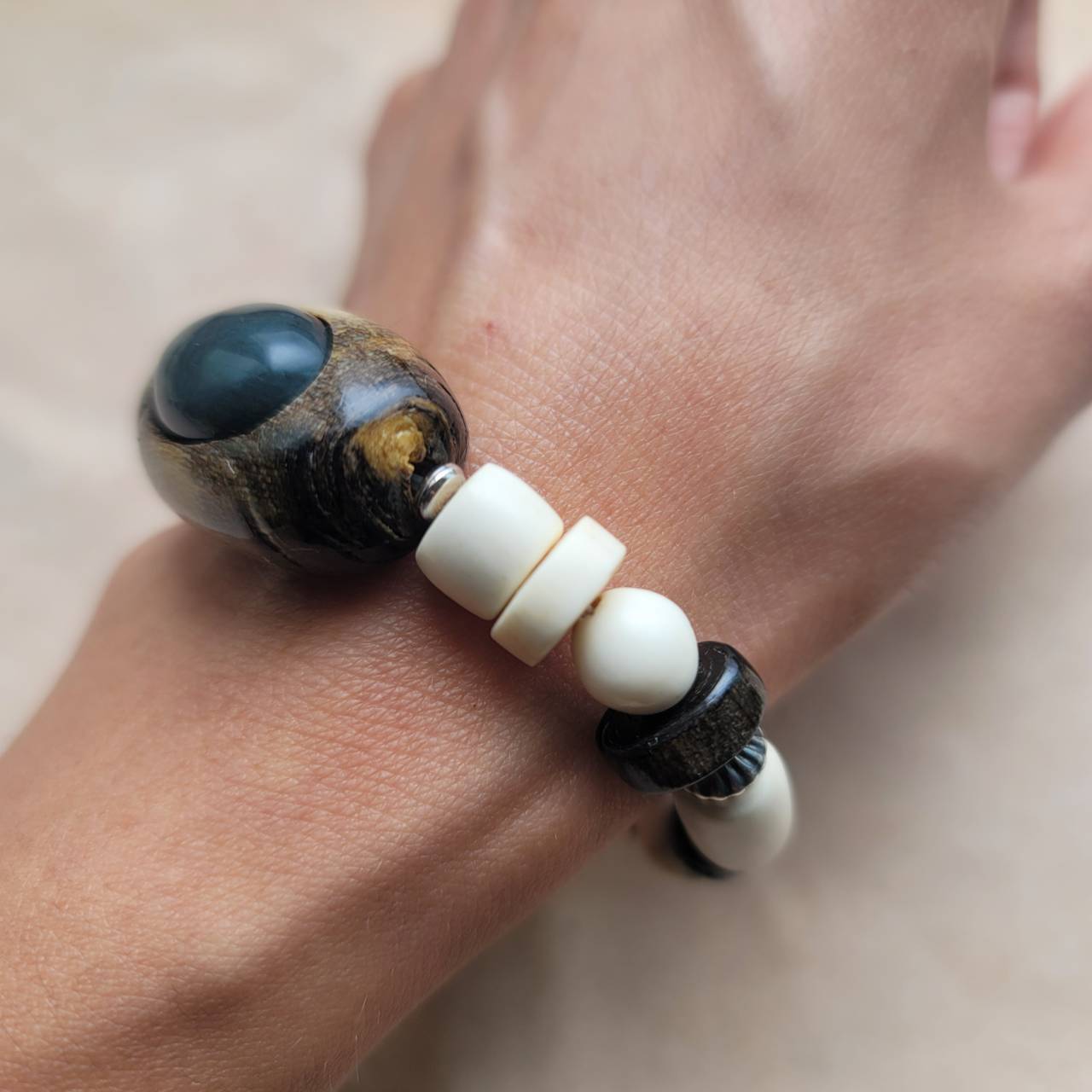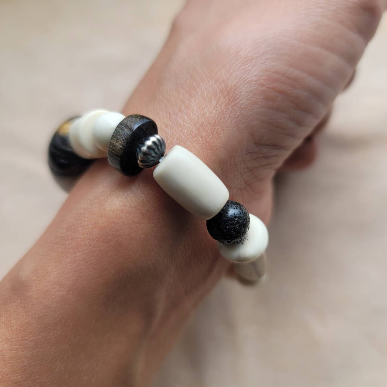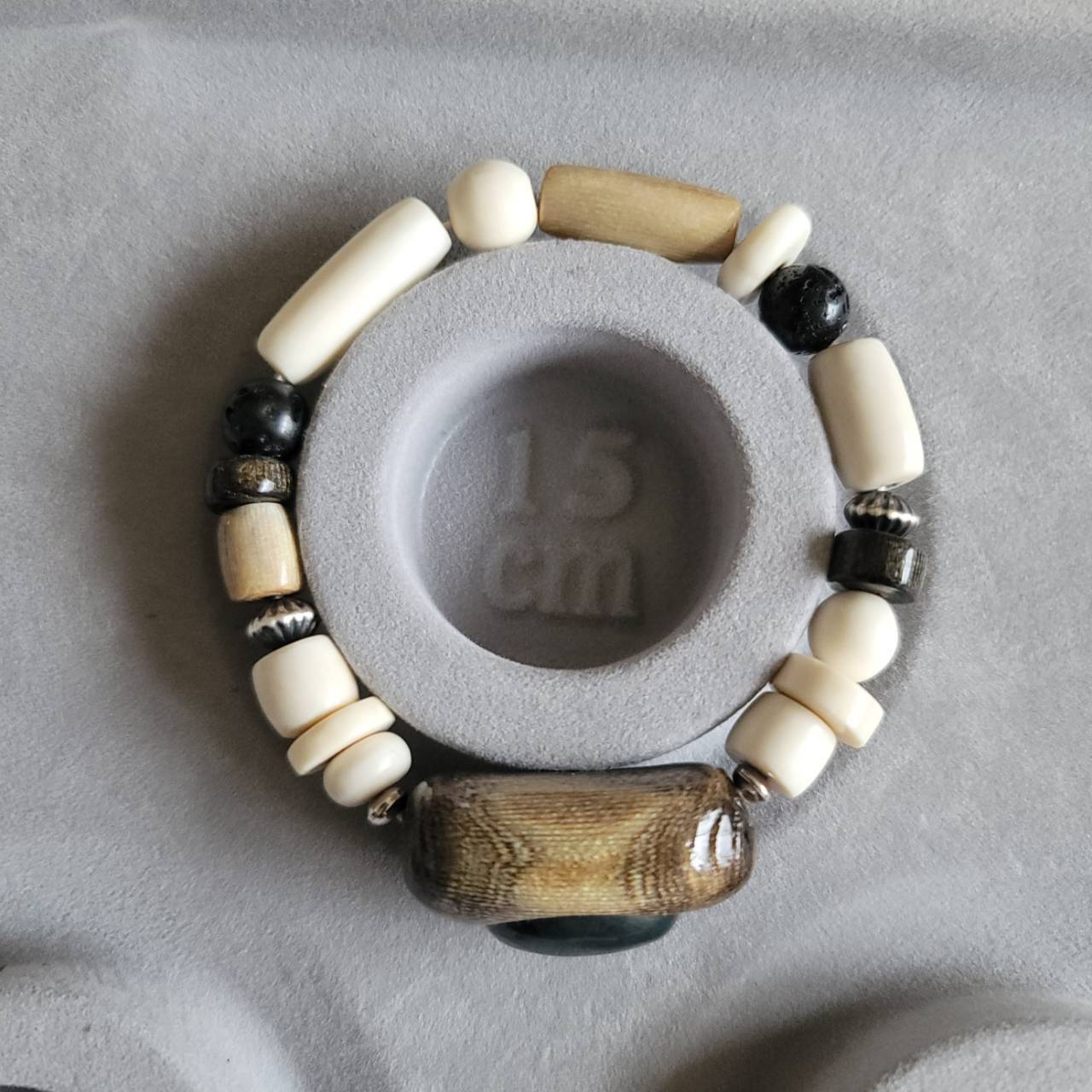 虹珊瑚に神居古潭石を埋め込んだトップに、様々な形の鹿角ビーズや虹珊瑚ビーズを制作し、天然石のビーズを組み合わせてブレスレットを作成いたしました。
