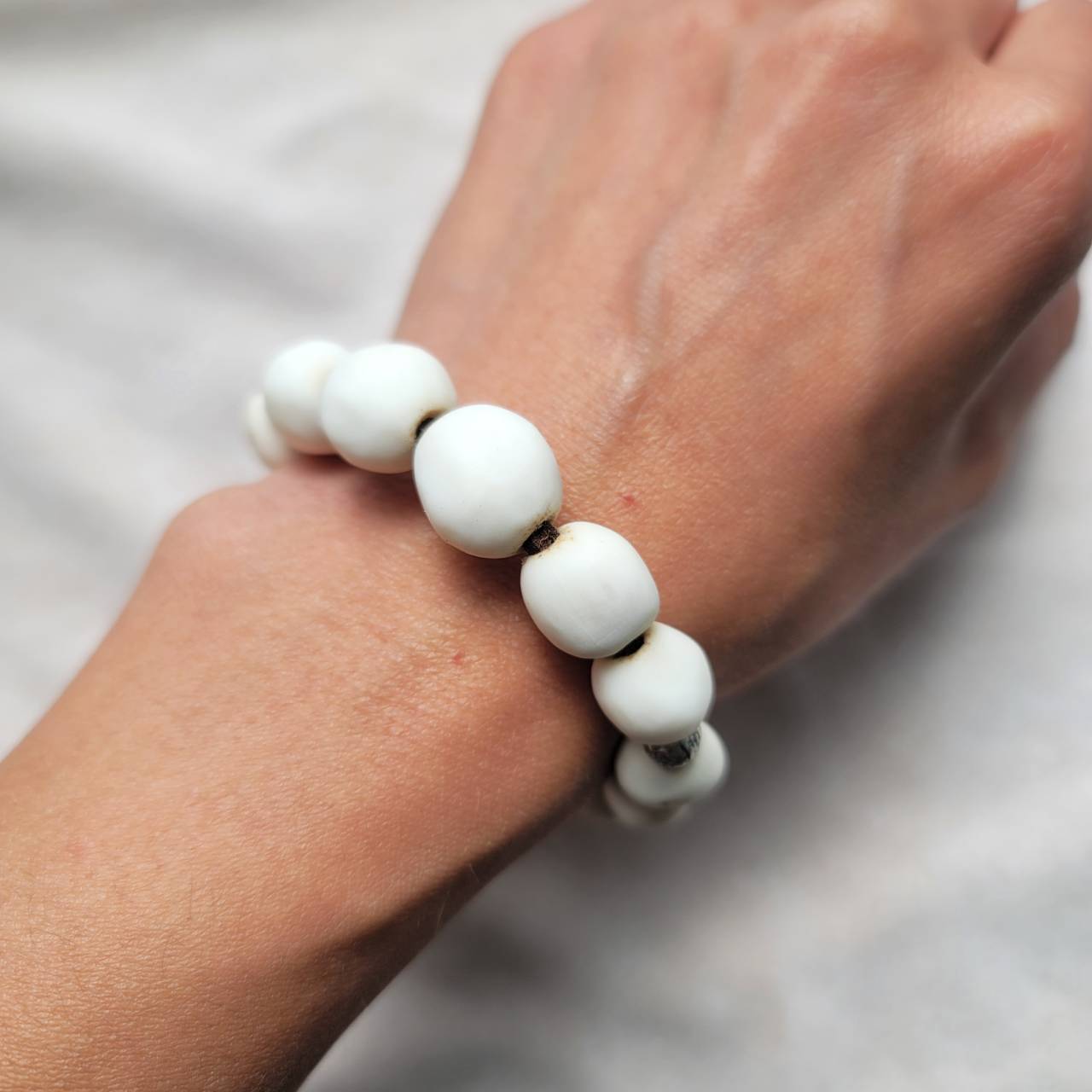 中央5つの大きめビーズが白に近く、両サイド5つの小さめビーズが生成りに近いカラーになっております。