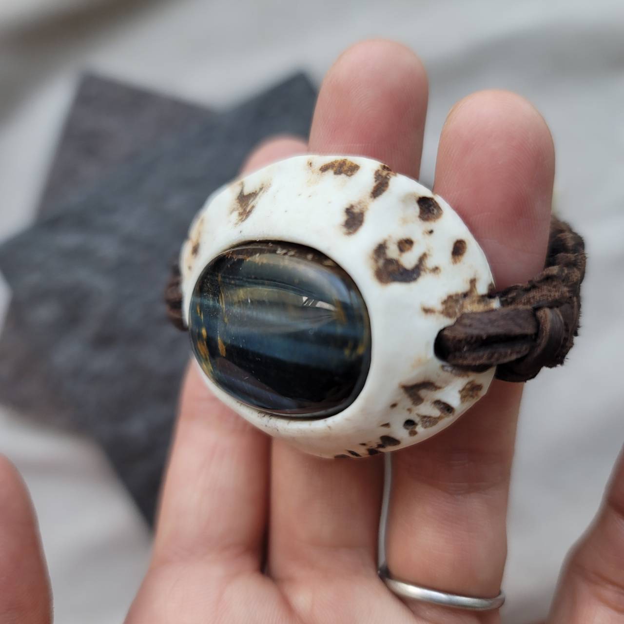 蝦夷鹿の角の根本部分を加工し、イエローとブルーカラーがミックスされたターガーアイを埋め込み、鹿の革紐を編んで制作しました。