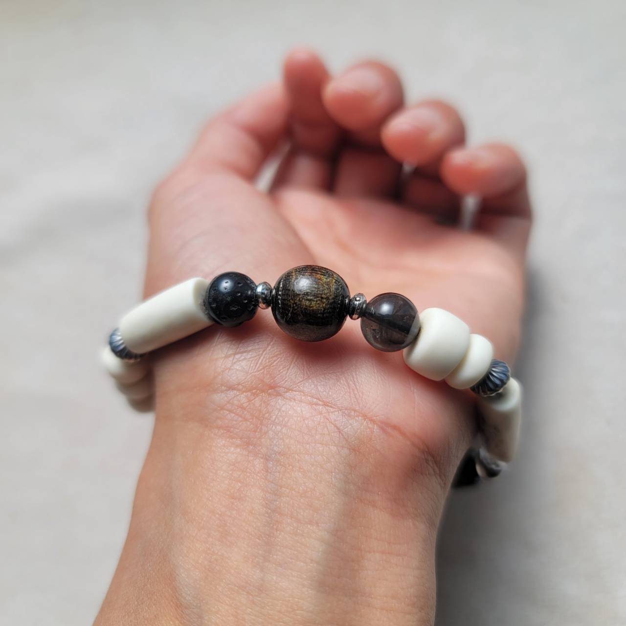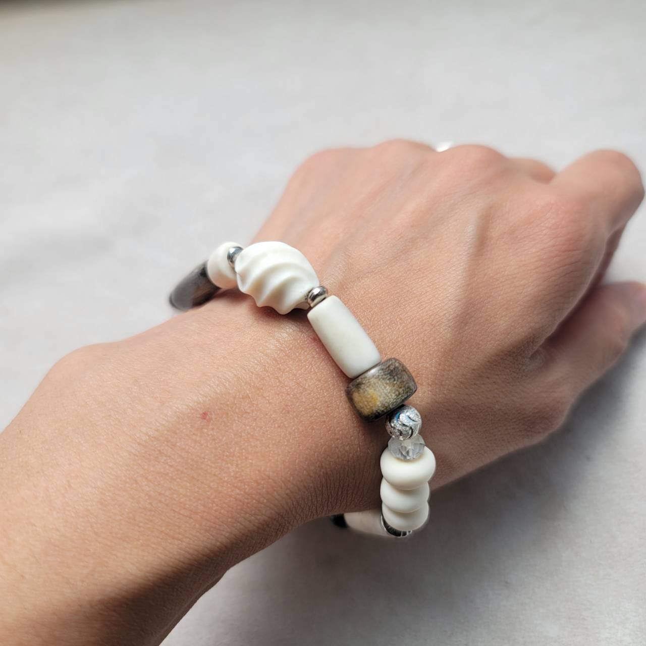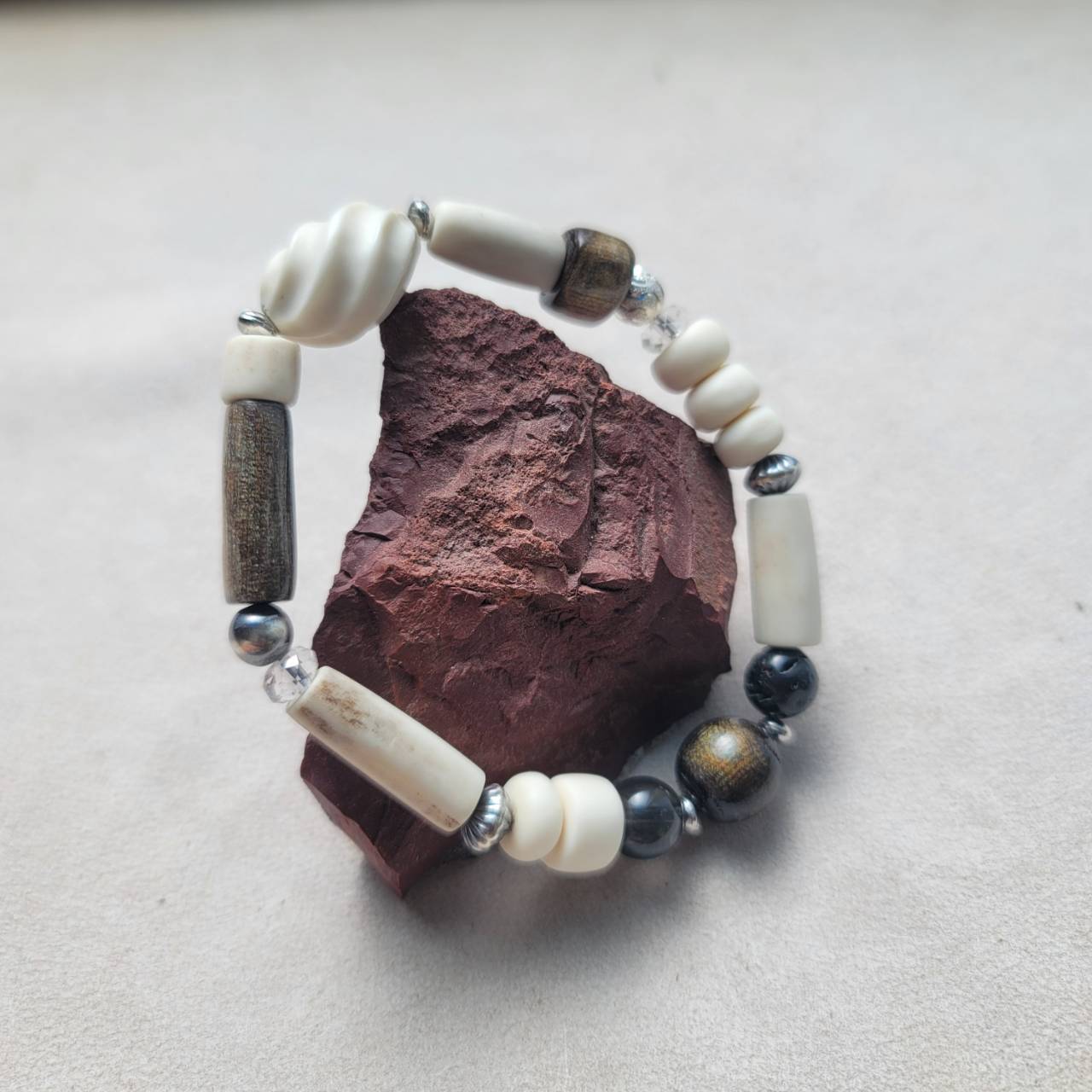 鹿の角、虹彩珊瑚、天然石やシルバービーズ、様々なパーツを、バランスを整え配置したブレスレットになります。