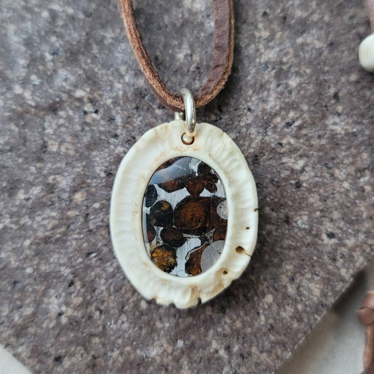 鹿の角を土台に稀少な隕石、セリコパラサイトを埋め込んでいます。
