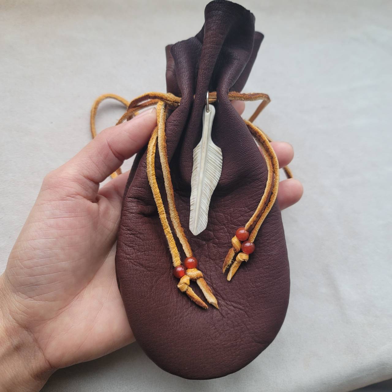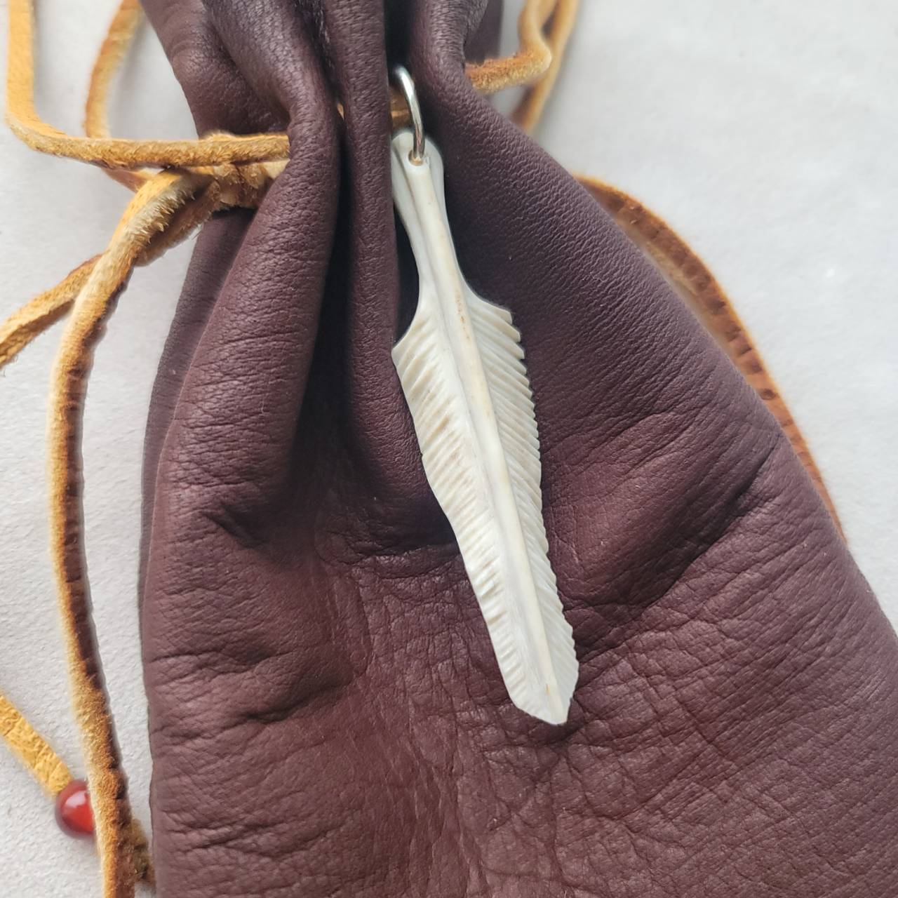 鹿の角を土台に彫った風切りフェザーチャーム付きです。