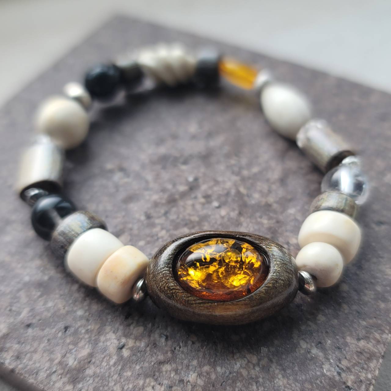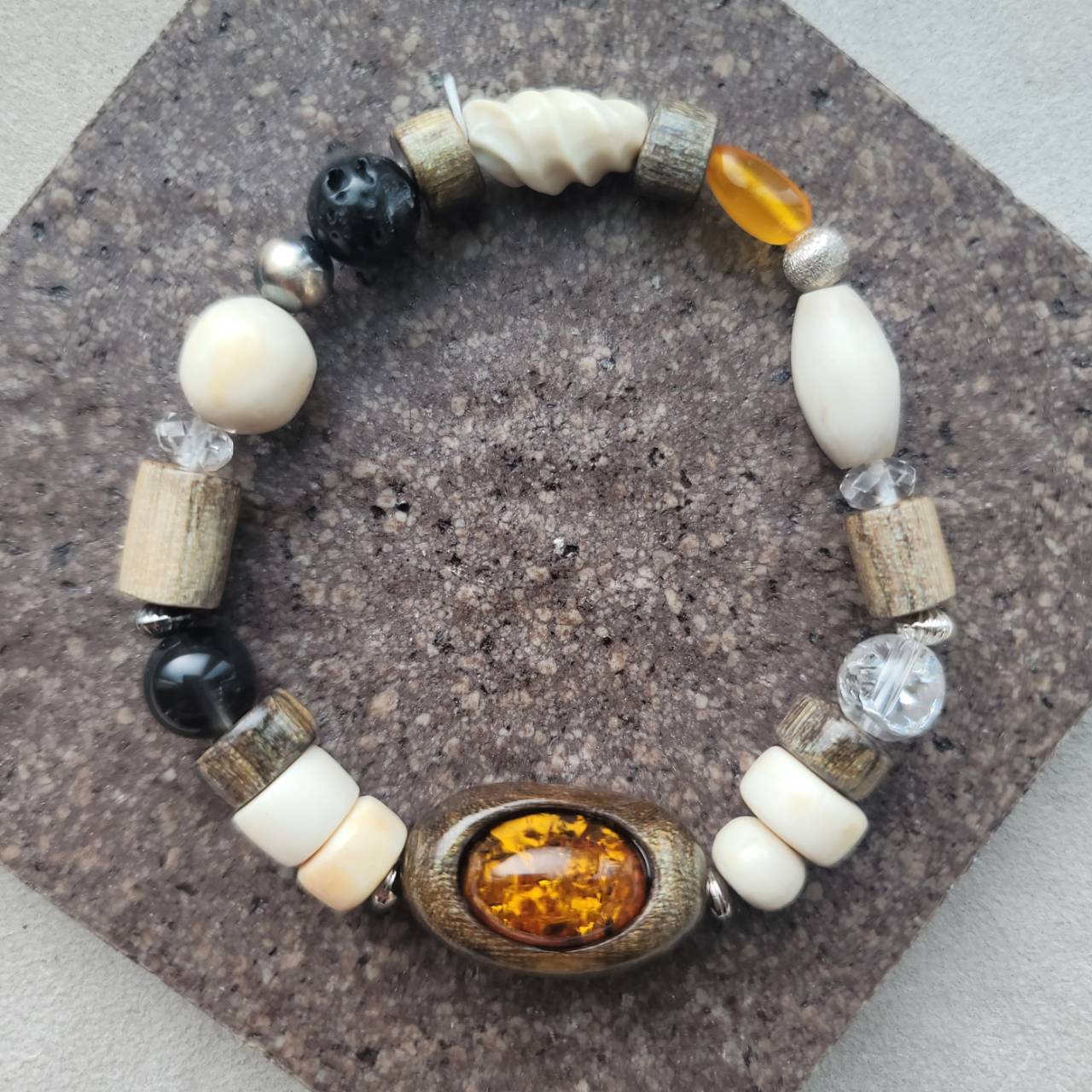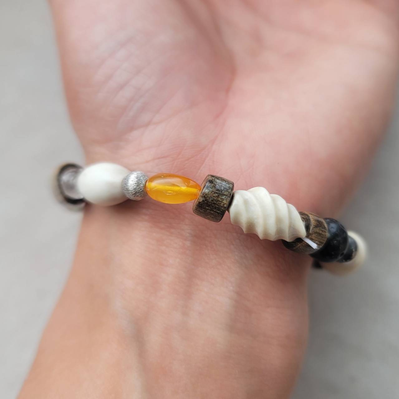 鹿の角 虹彩珊瑚 琥珀と天然石のブレスレット