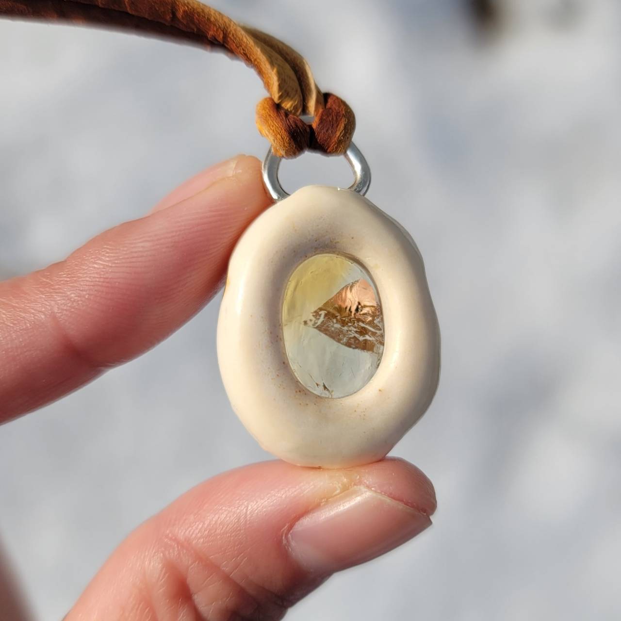 光にかざして天然石を見れるように裏面の一部をくり抜いて制作しています。