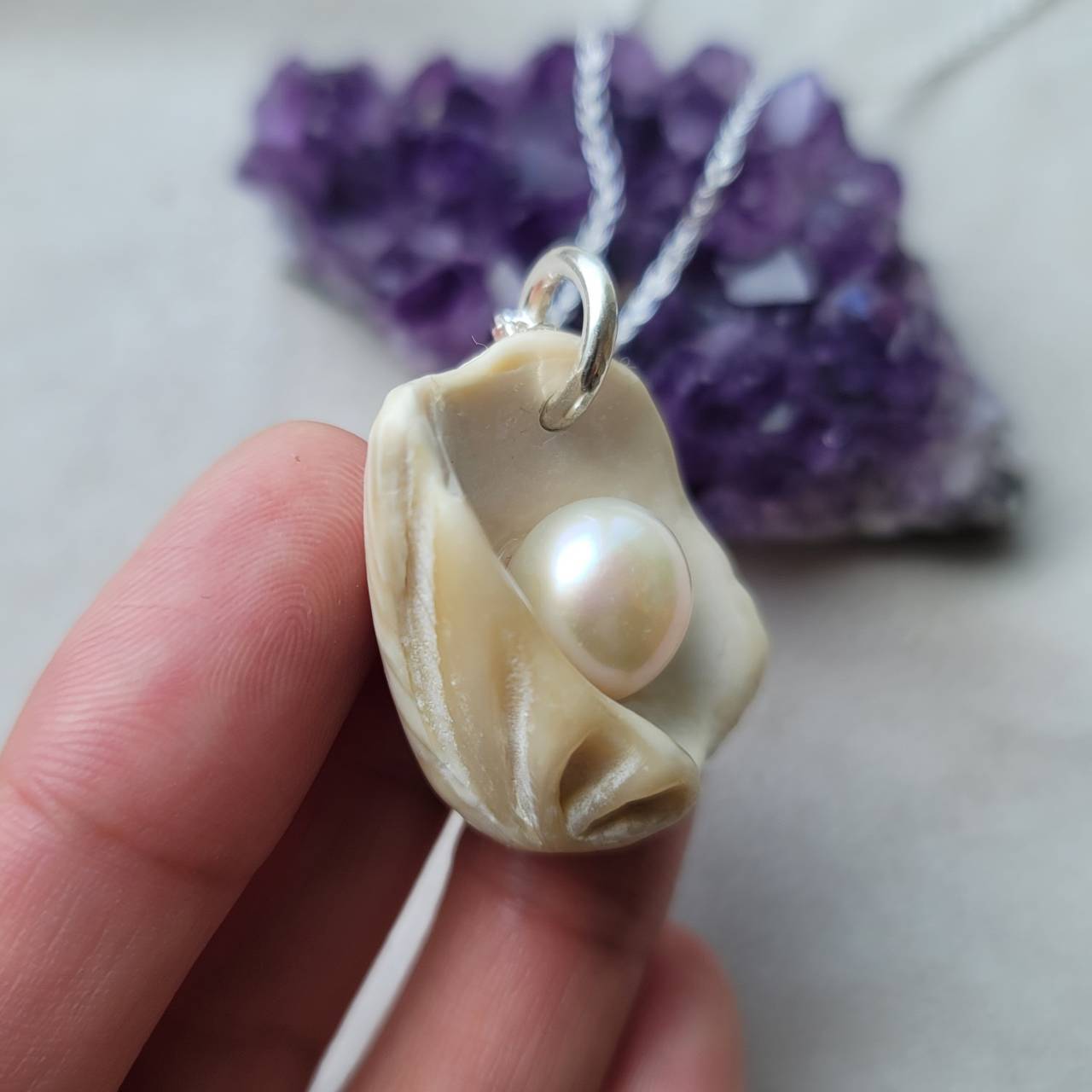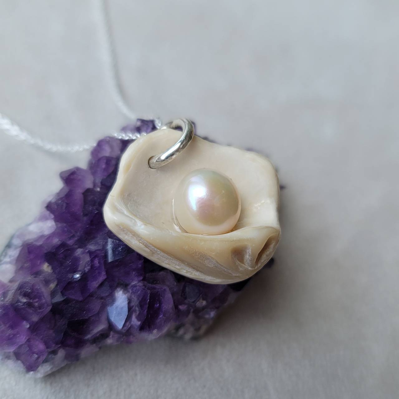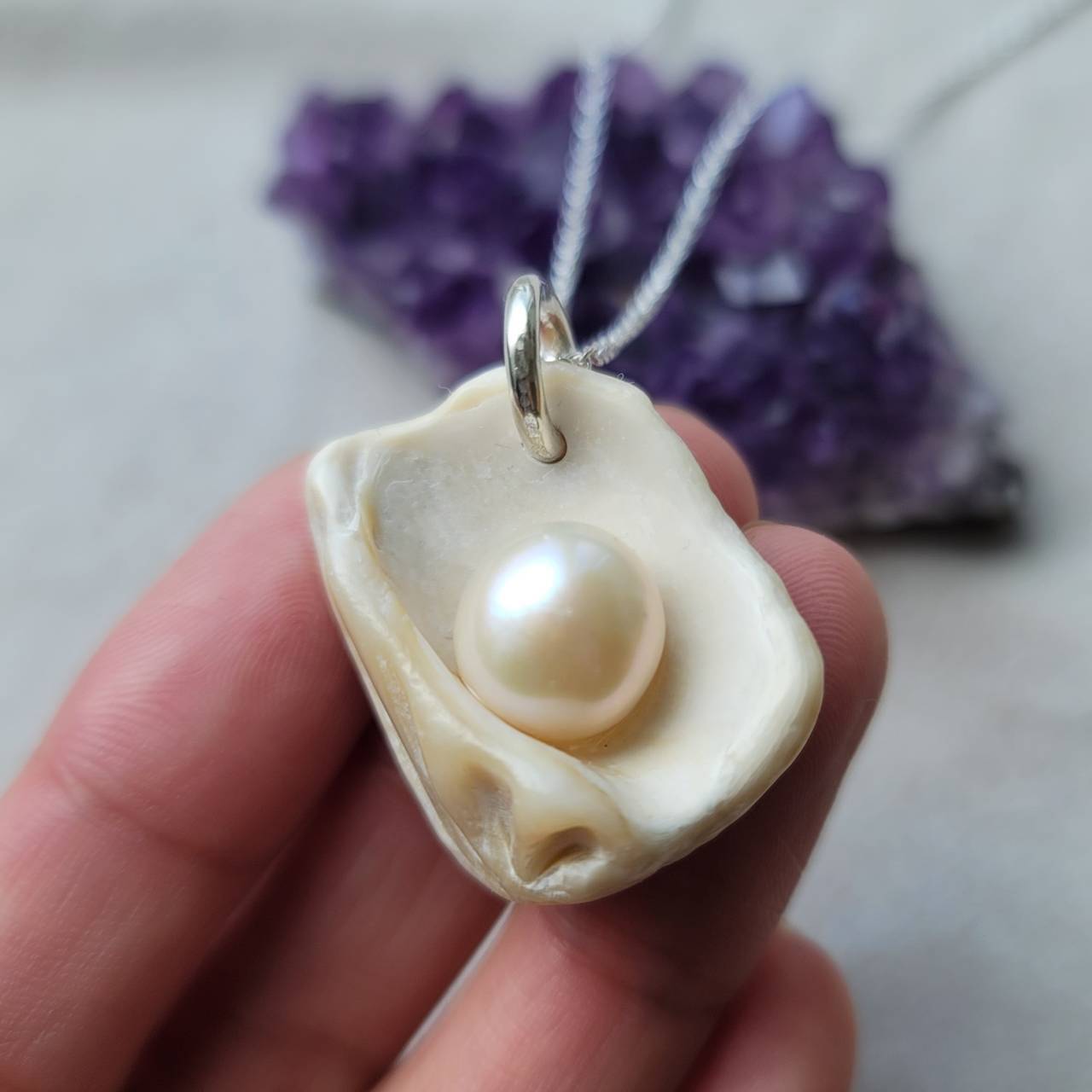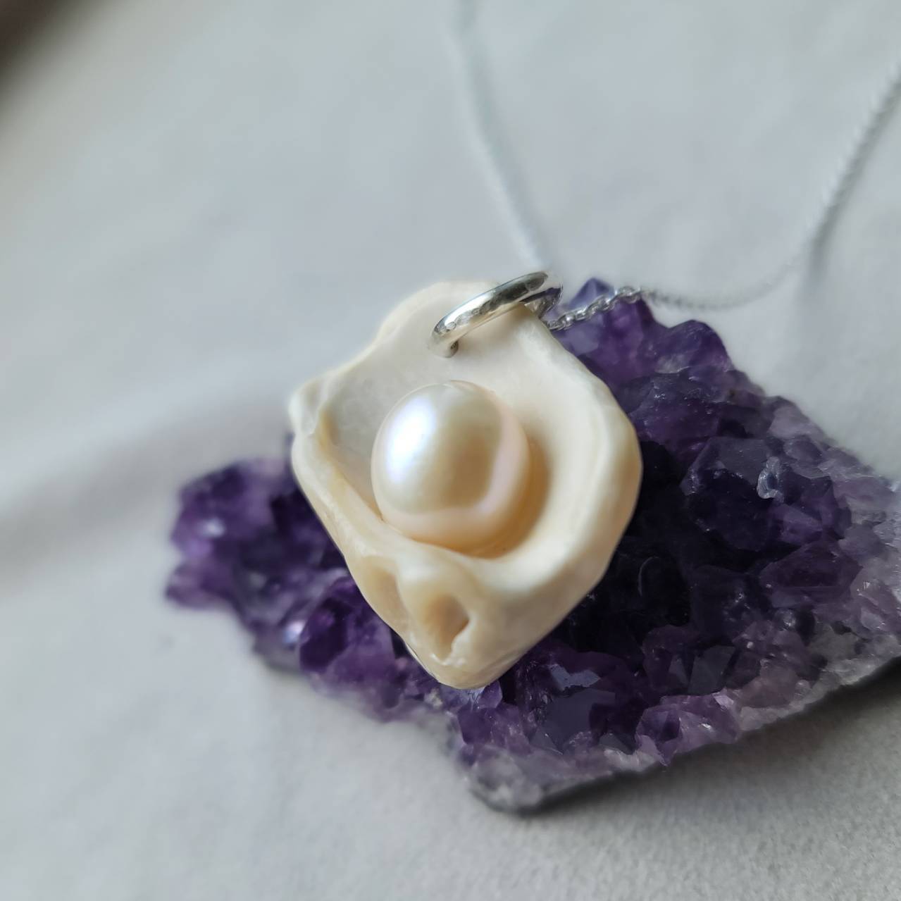 北海道奥尻島の海で拾った貝殻の欠片を磨き、淡水真珠を付けて固定しています。