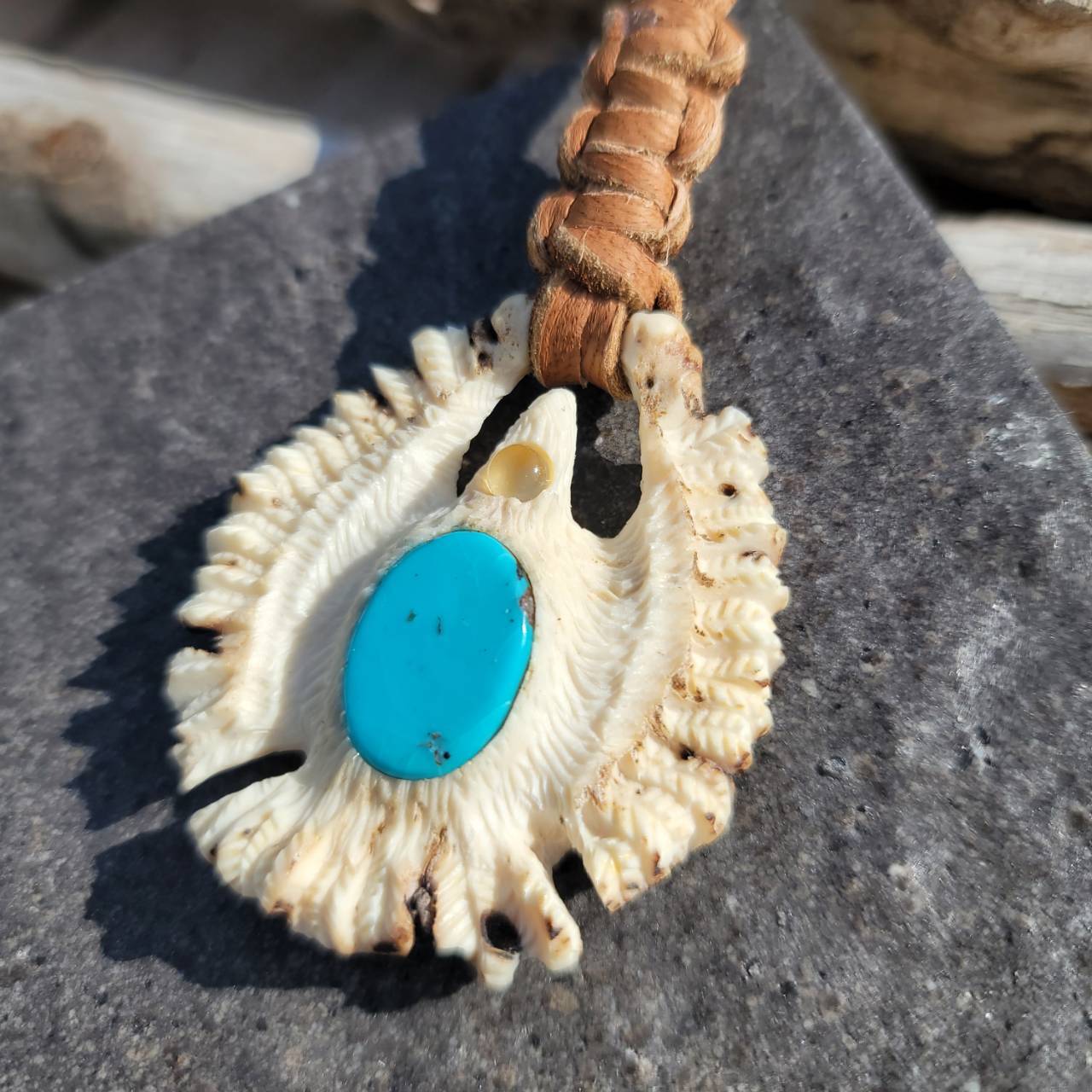 鹿の角の根元にイーグルを彫り、ターコイズとシトリンの組み合わせで、自然の美しさを存分に感じ、オシャレを楽しむことができるアイテムです。