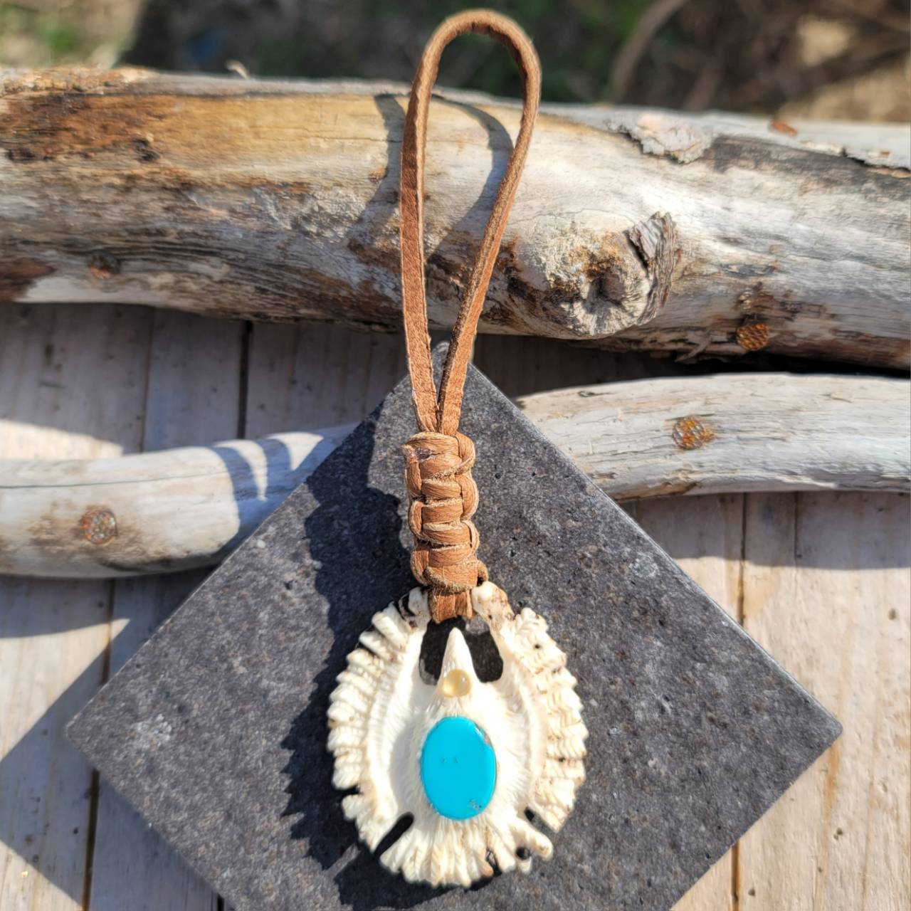 鹿の角 イーグルモチーフの革紐ストラップ ターコイズとシトリン