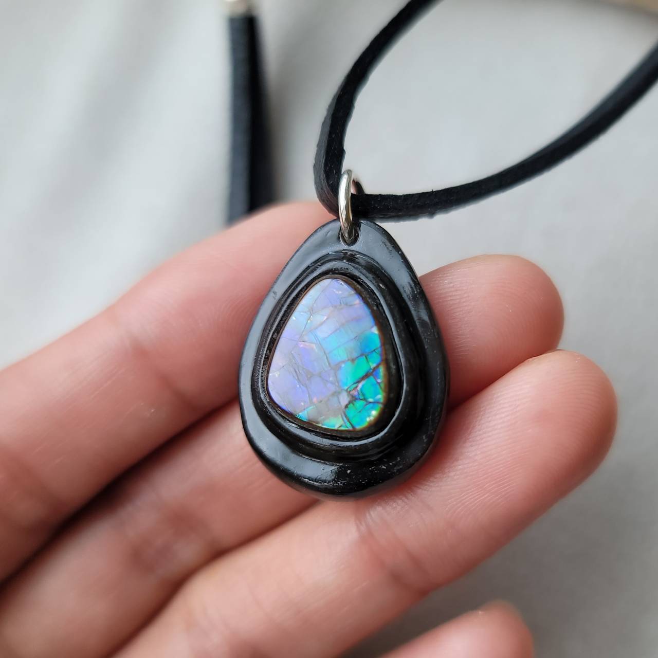 こちらは【水牛の角 アンモライトのペンダント】になります。