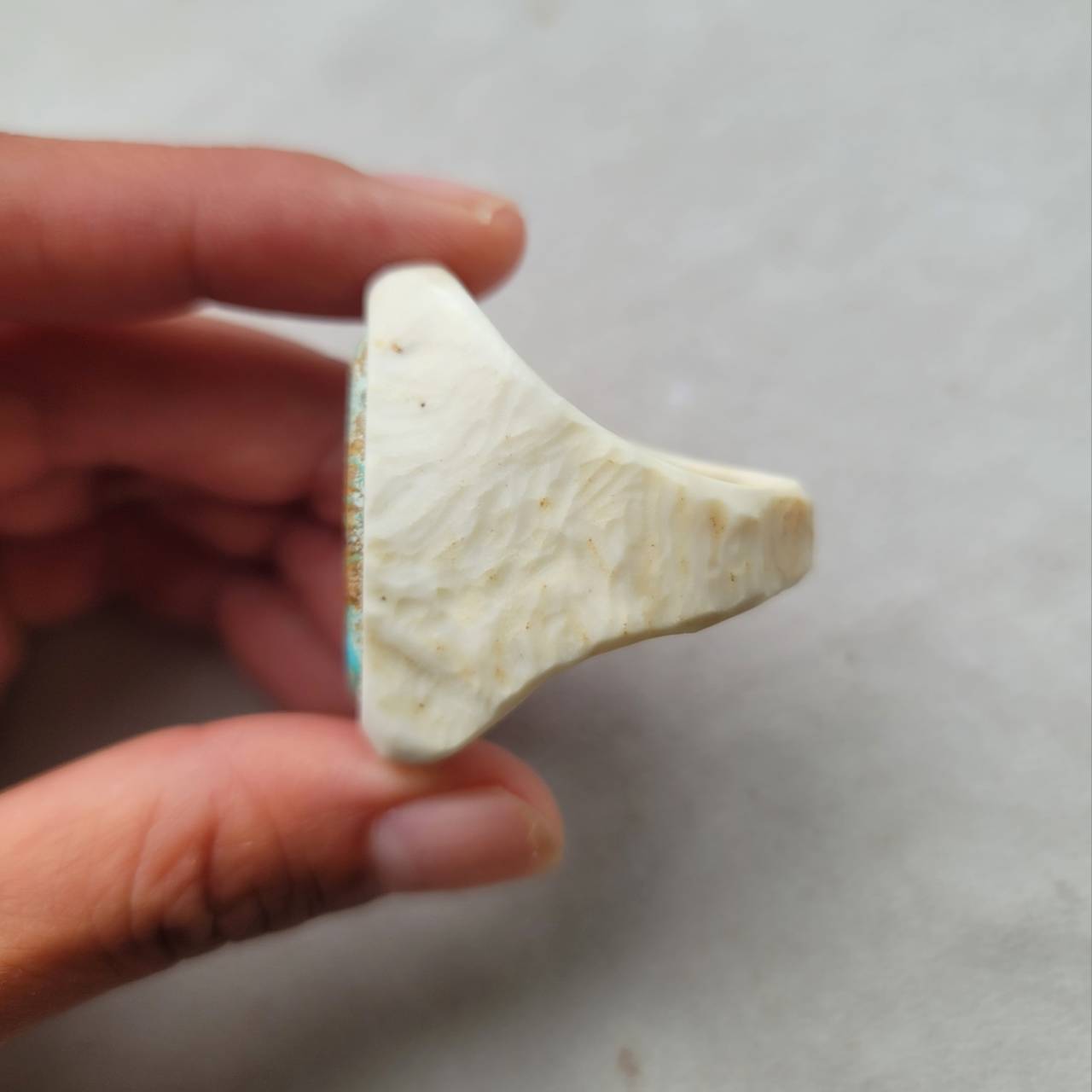 ターコイズの色合いがより映えるよう鹿角模様は削り取り、部分的に天然の凹凸模様は残してあります。