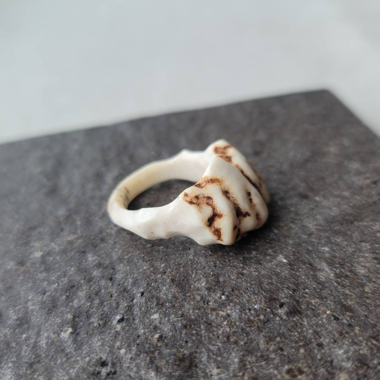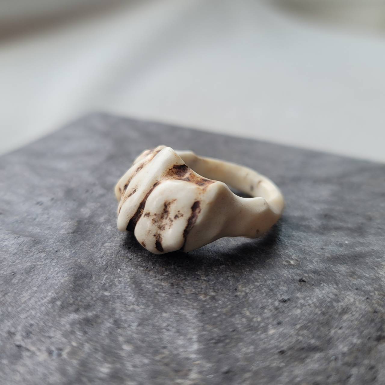 角の根本(クラウン)部分から、一部模様を残し削り出したリングです。