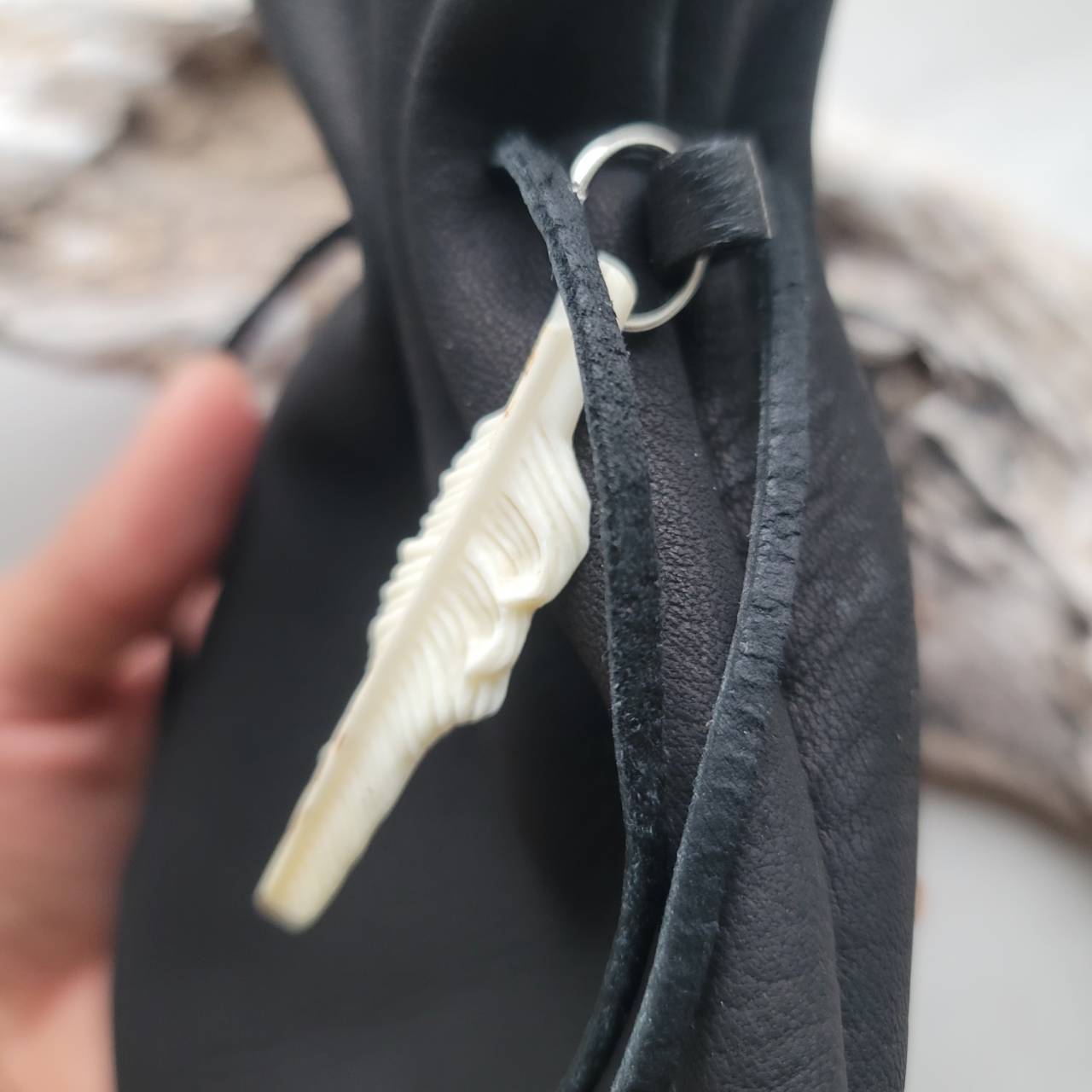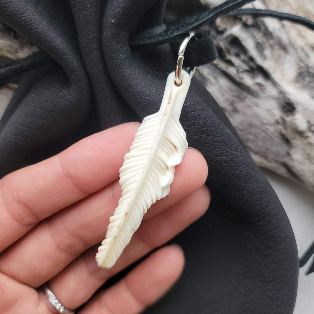 こちらは【鹿革の巾着 風切りフェザーのチャーム】になります。