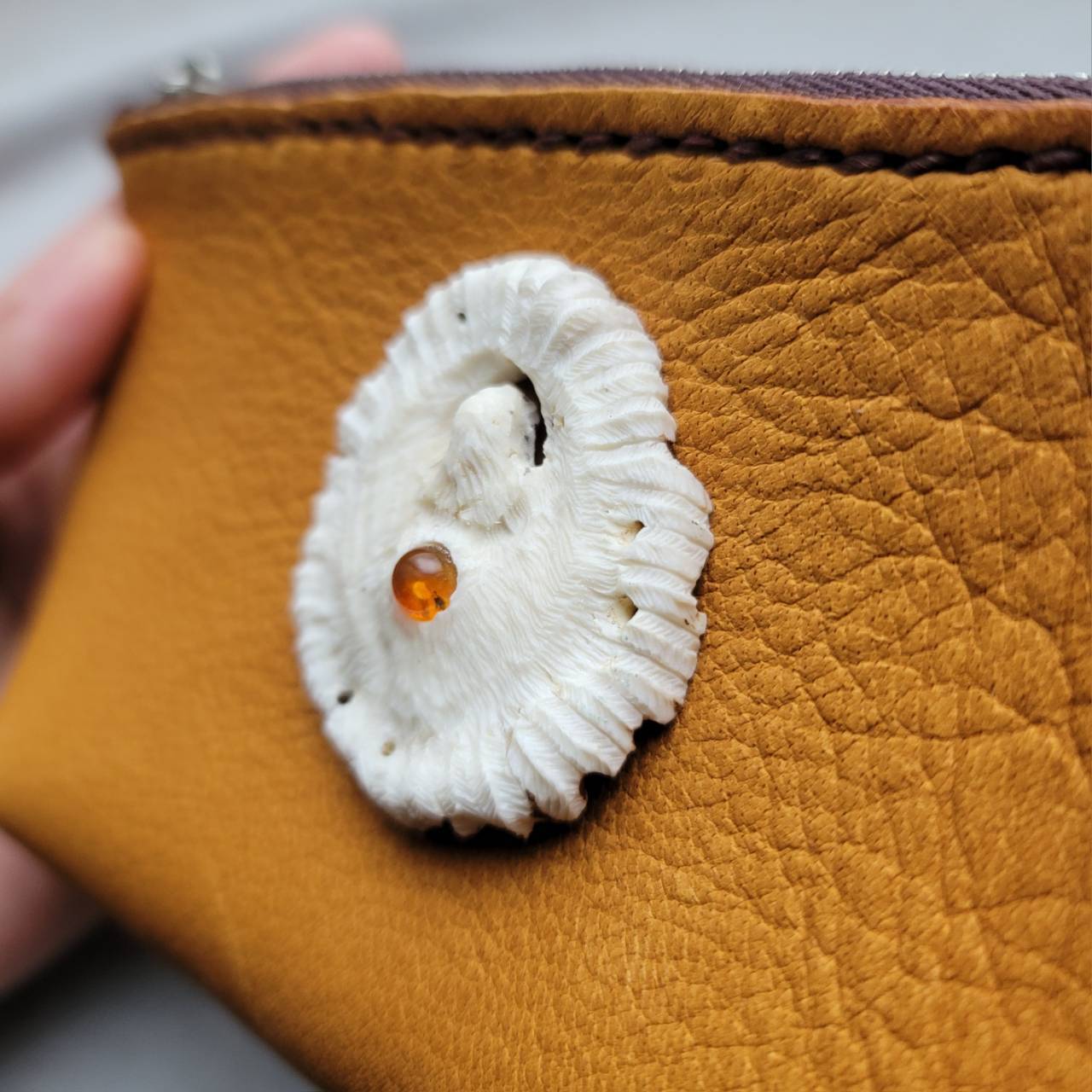 鹿の角根元部分から削り出したイーグル、バルティックアンバーを背中に埋め込み、縫い付けて留めています。