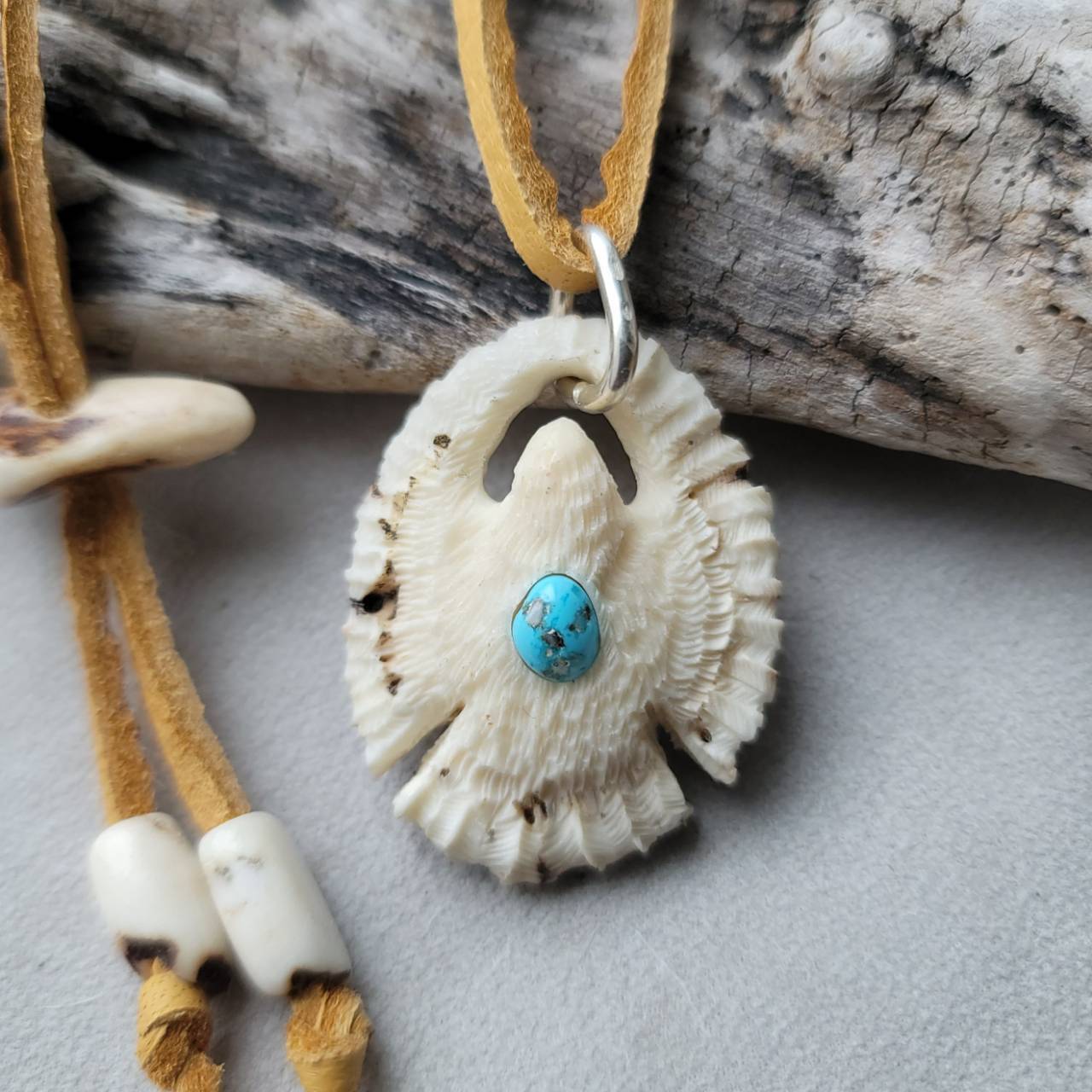 鹿の角根元部分から削り出したイーグル、背中に埋め込でいるのは小粒ですがネバダ州のローンマウンテン鉱山のターコイズです。