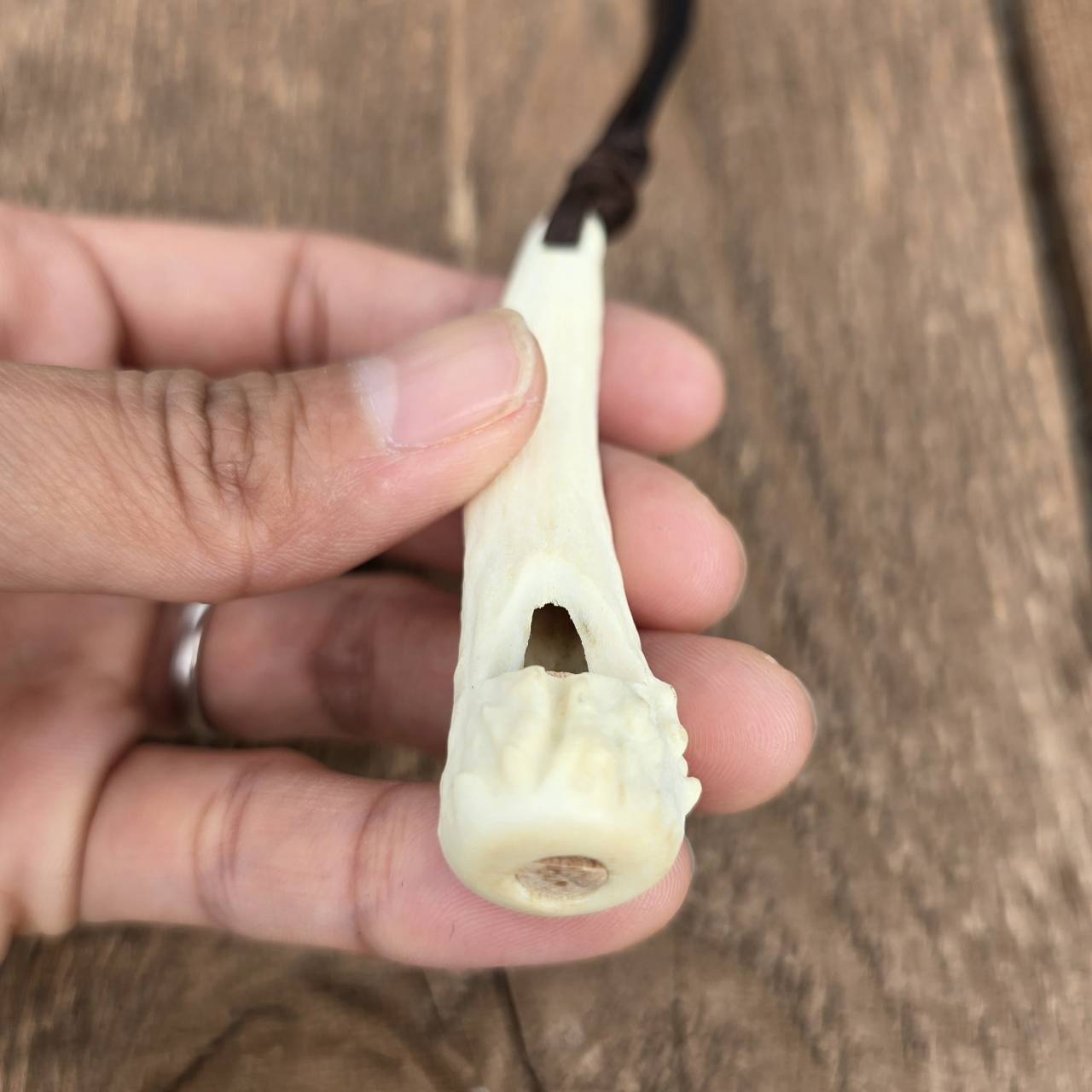 こちらは【鹿の角 1本角の角笛 革紐ストラップ】になります。