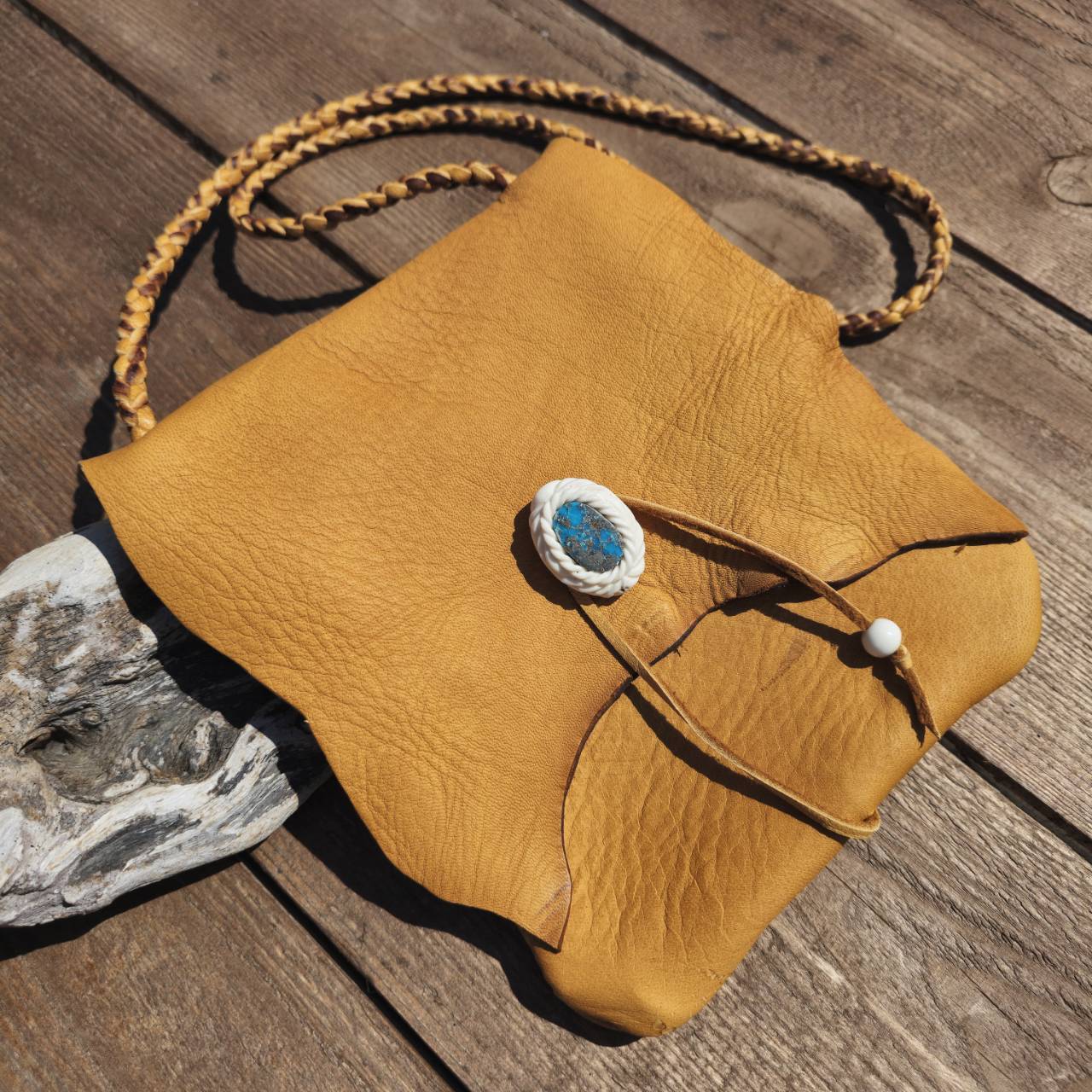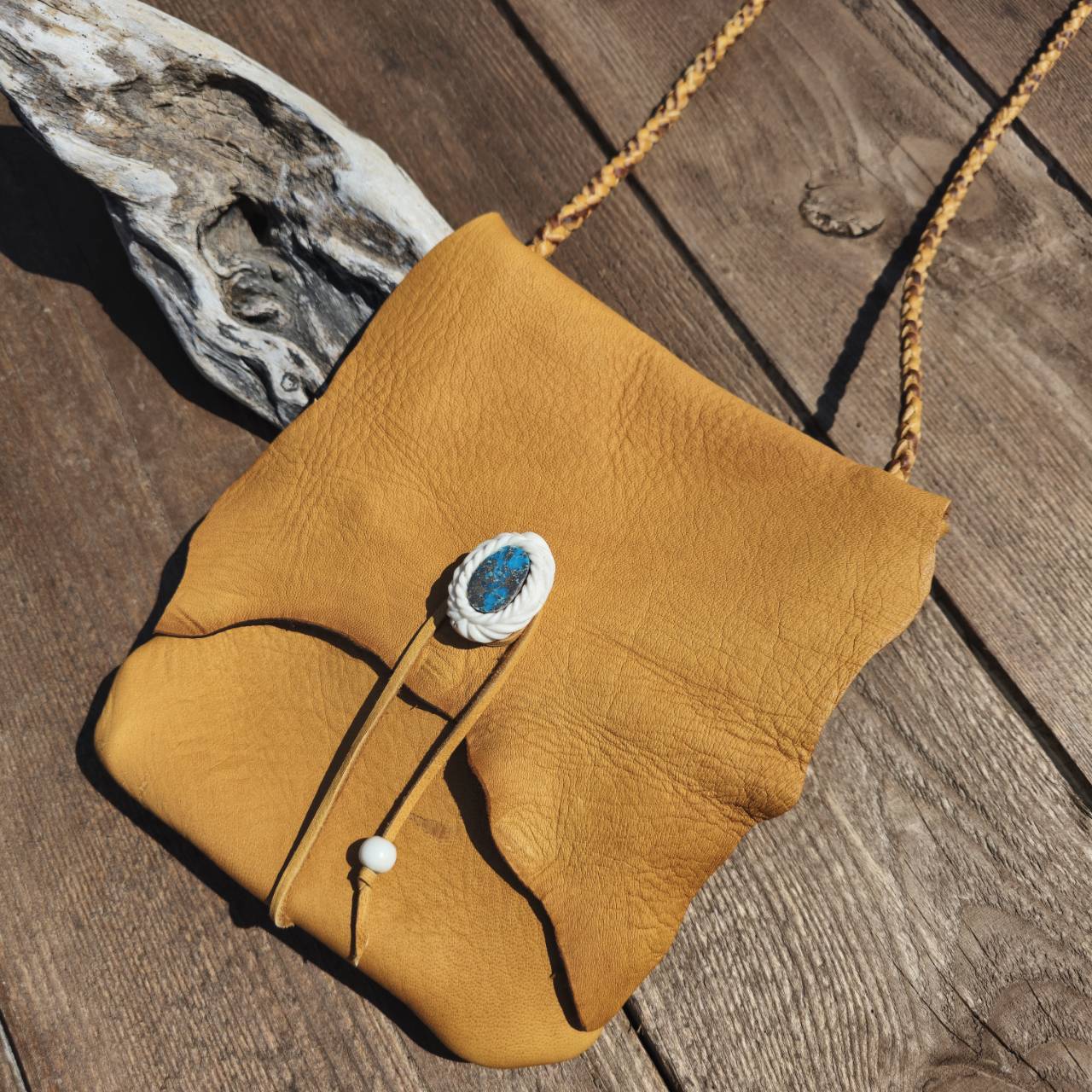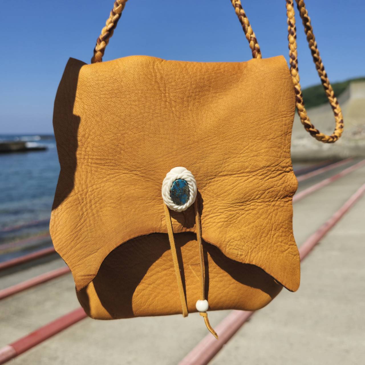 鹿革のメディスンポーチ ペルシアンターコイズの鹿角コンチョ