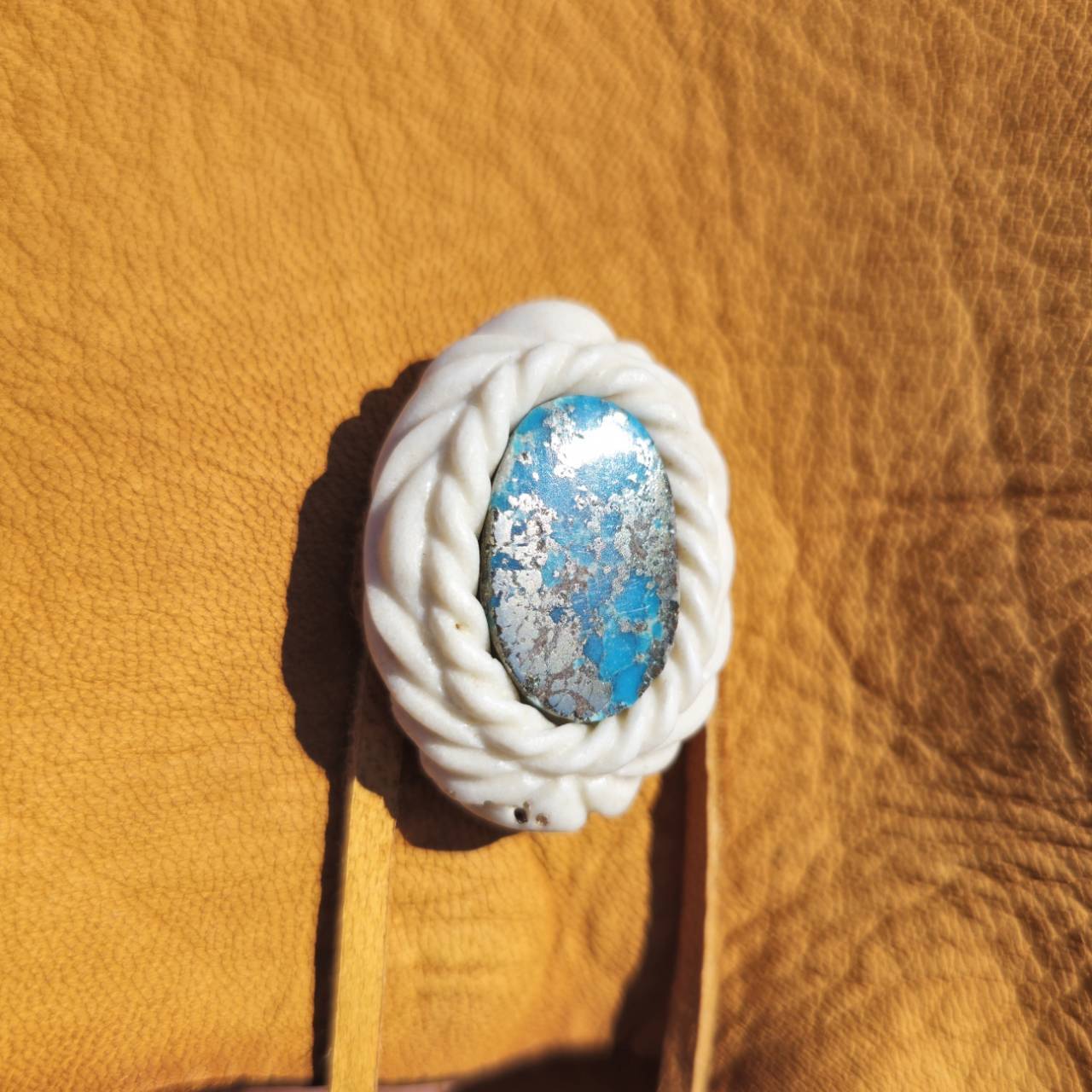 鹿角本来の模様を残した根元部分を土台に、ペルシアンターコイズをセットしたコンチョを制作し、取り付けました。