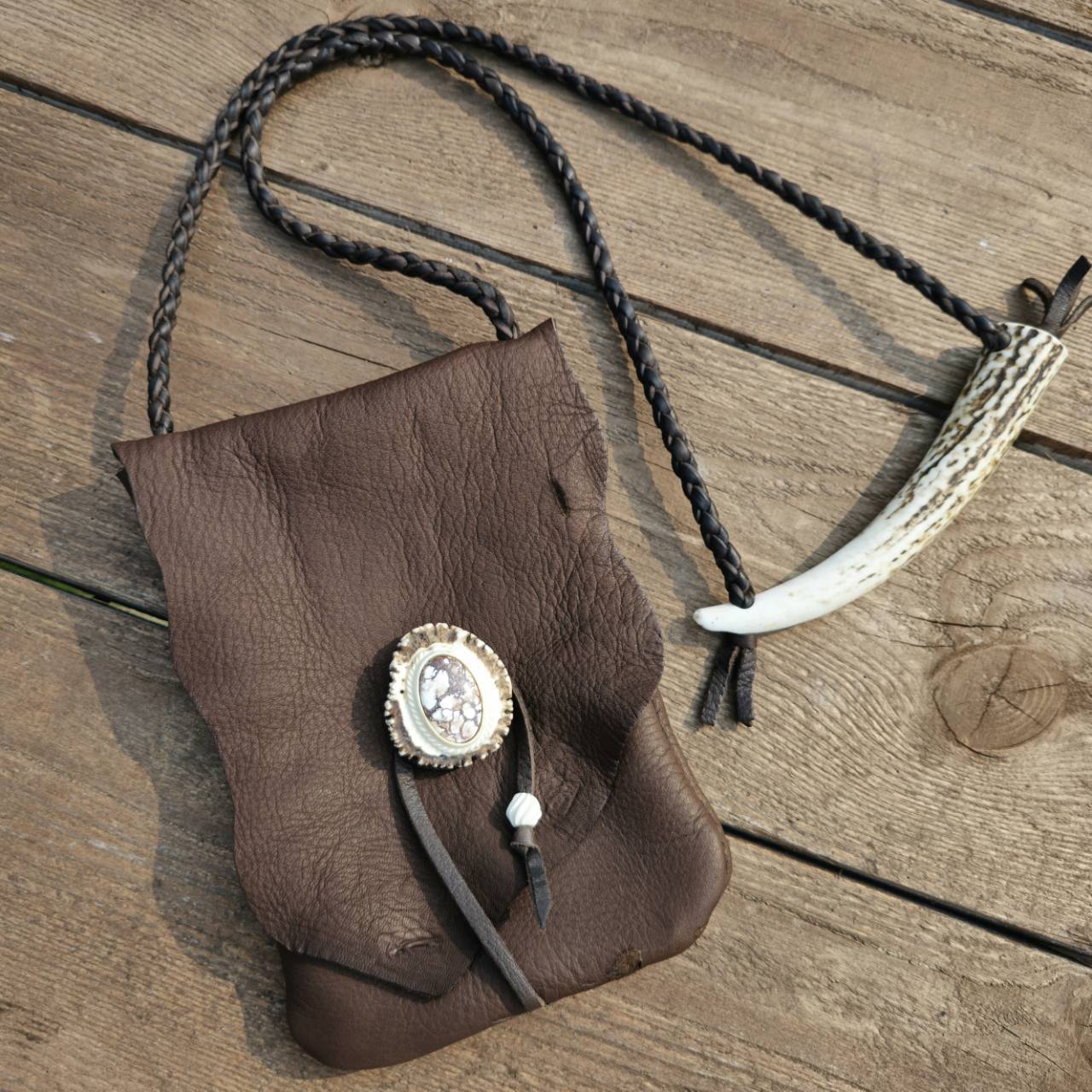 鹿革のメディスンポーチ ワイルドホースの鹿角コンチョ